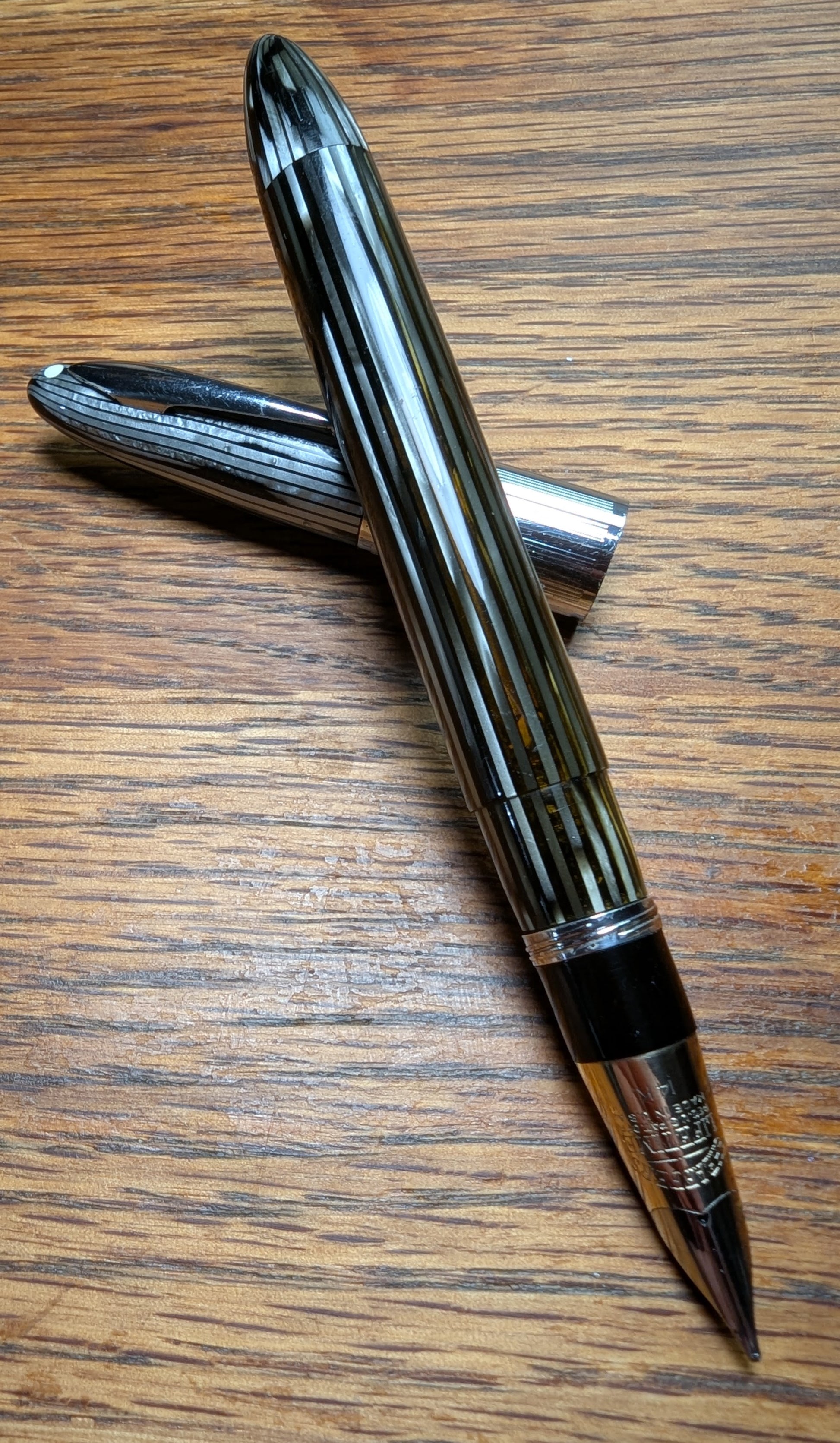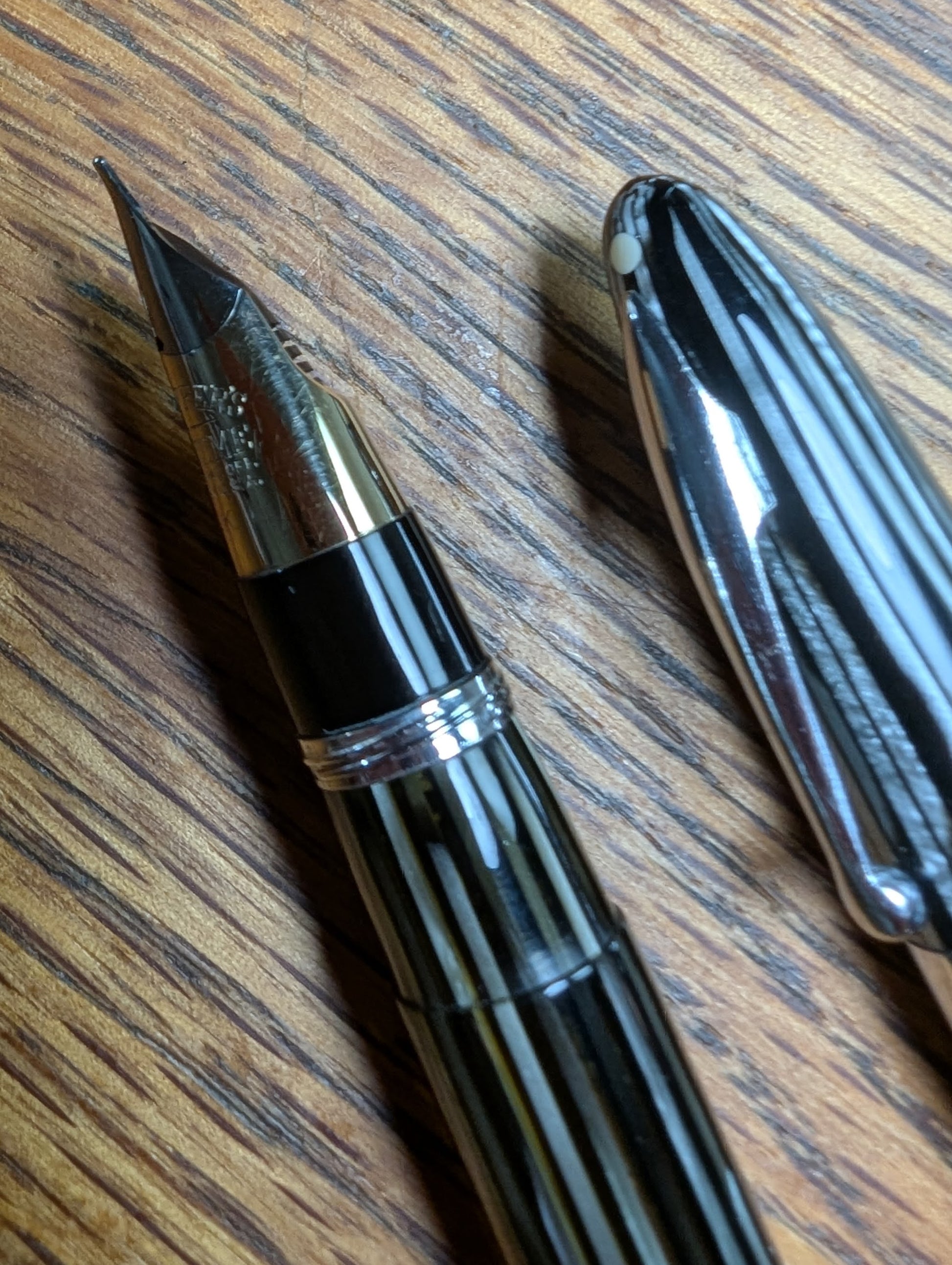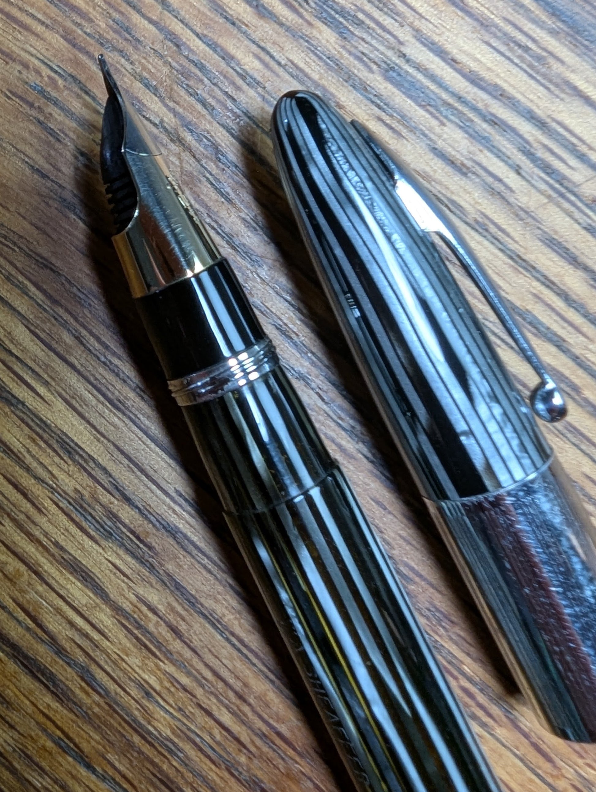 The pen is very nice. The celluloid is in excellent condition with very good transparency and clarity. The chrome plating is excellent. Chrome plating on vintage pens of the 1930s and 1940s is not always this nice.