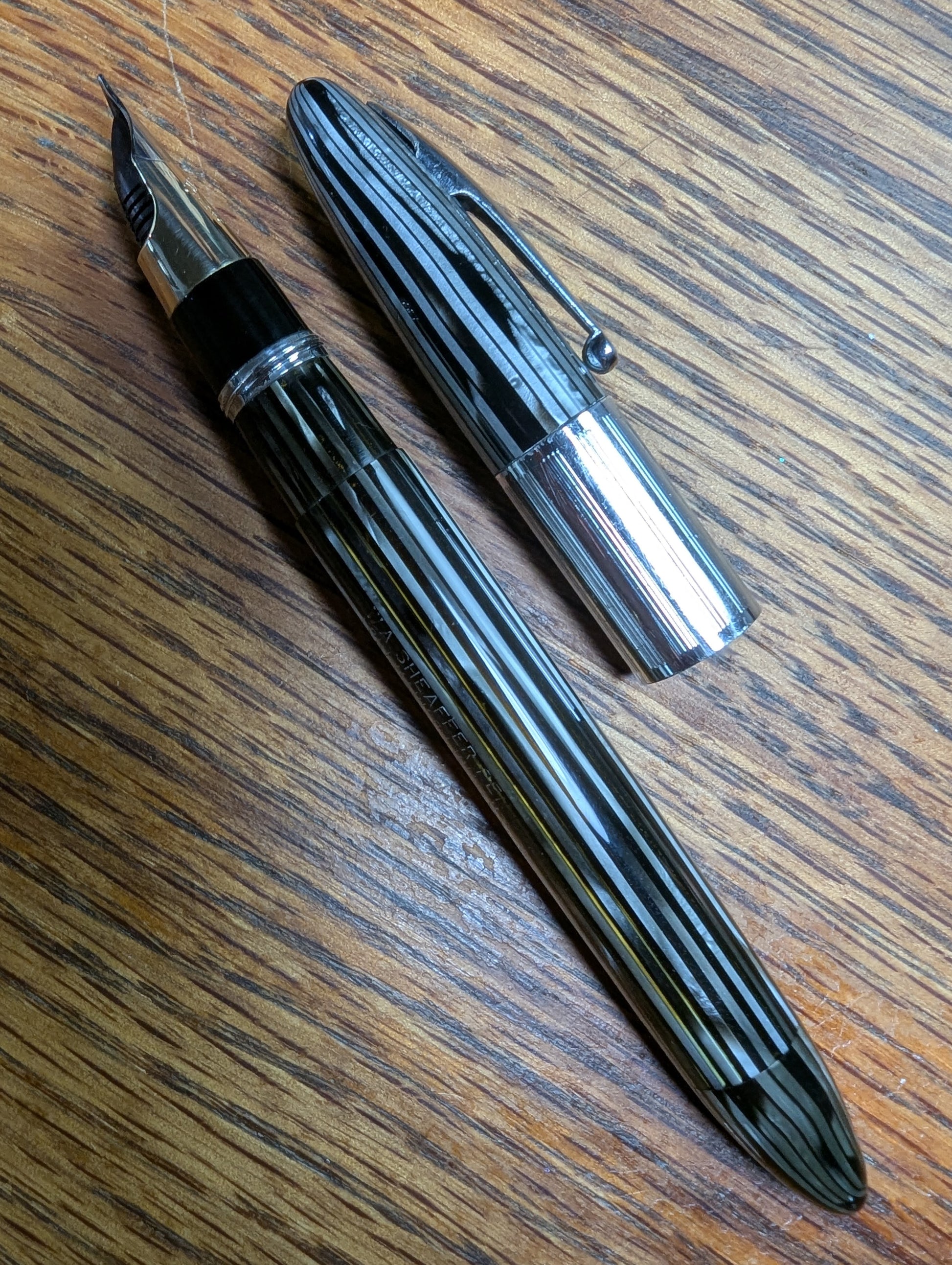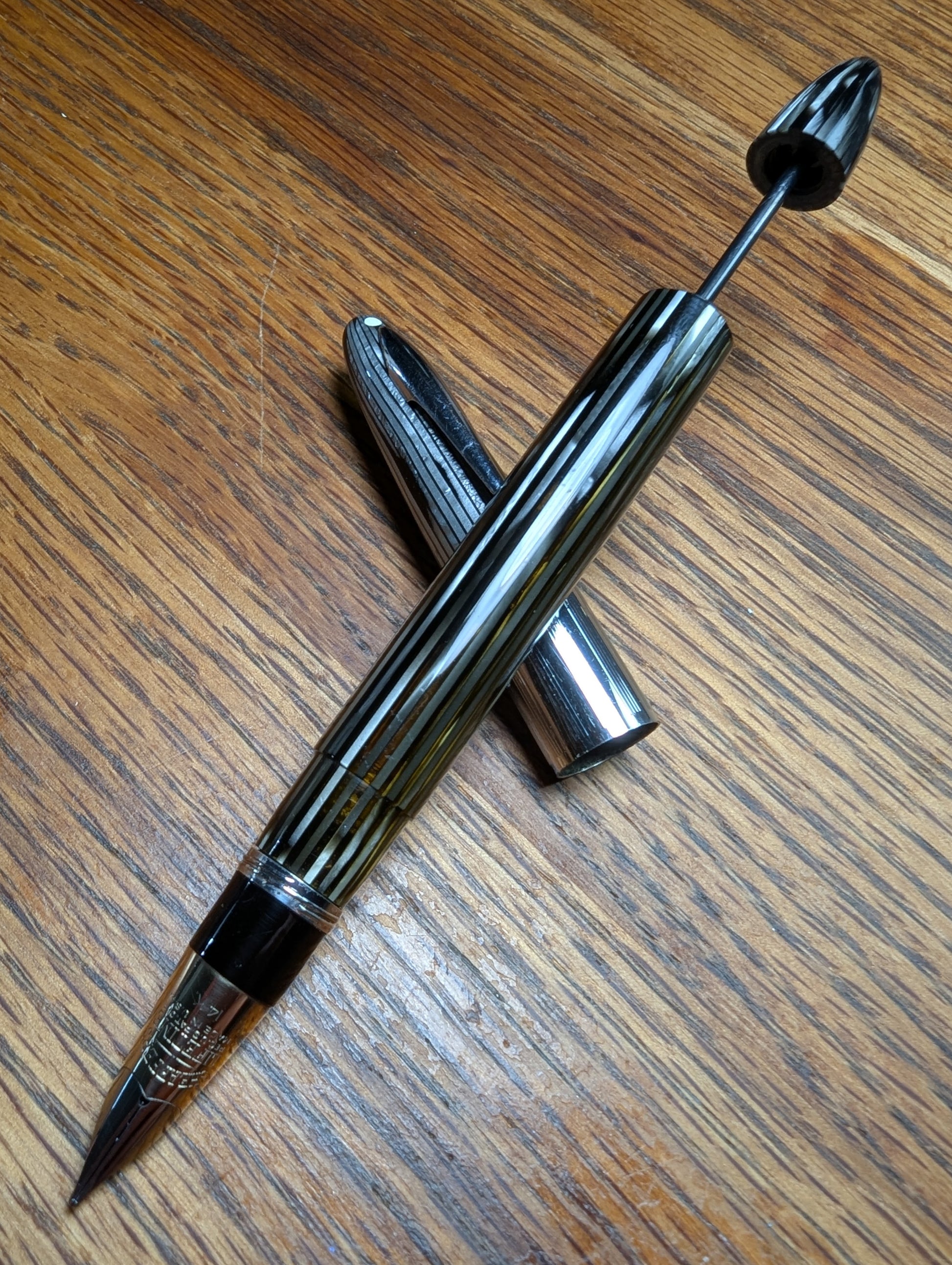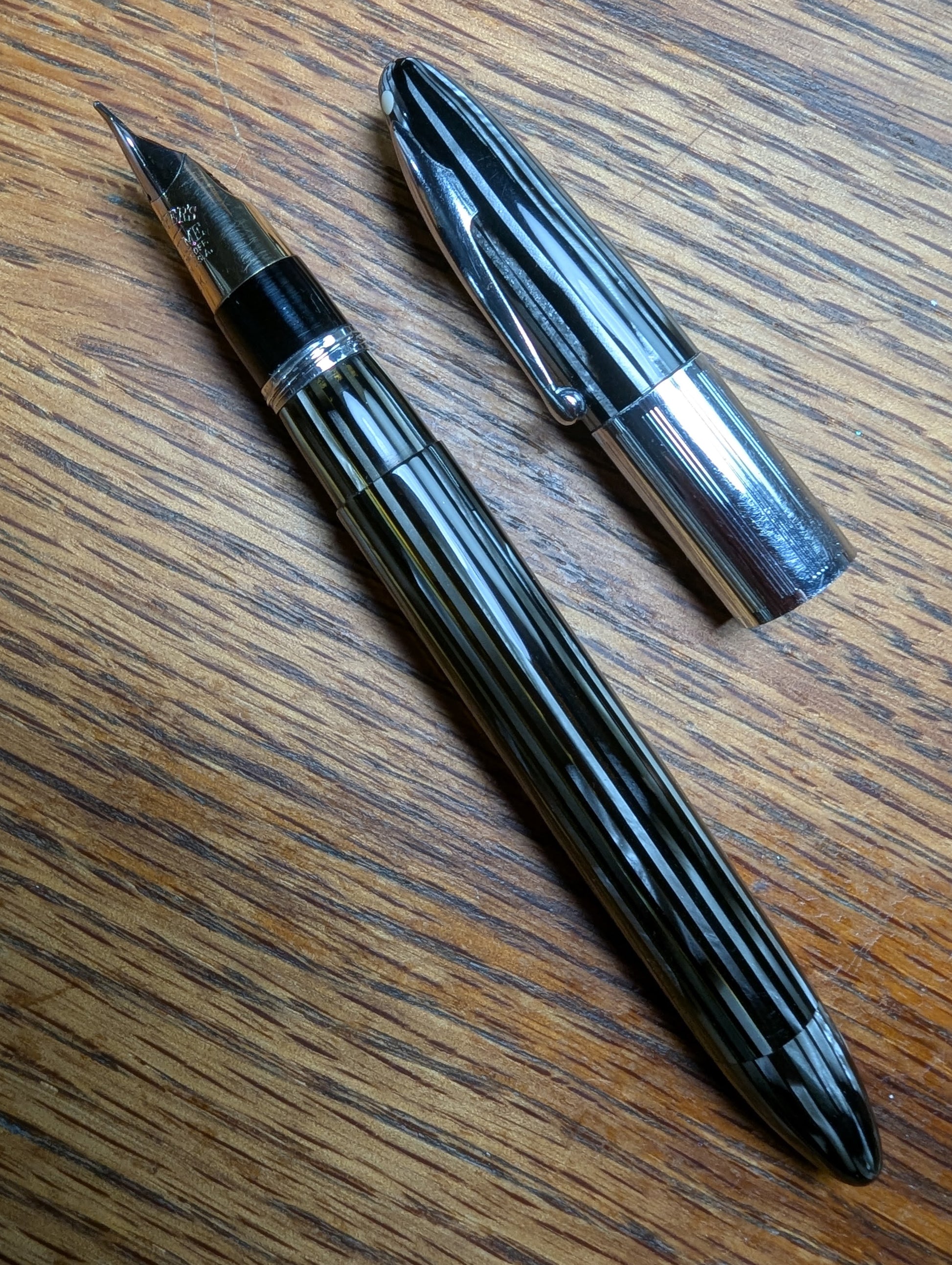 The pen is very nice. The celluloid is in excellent condition with very good transparency and clarity. The chrome plating is excellent. Chrome plating on vintage pens of the 1930s and 1940s is not always this nice.