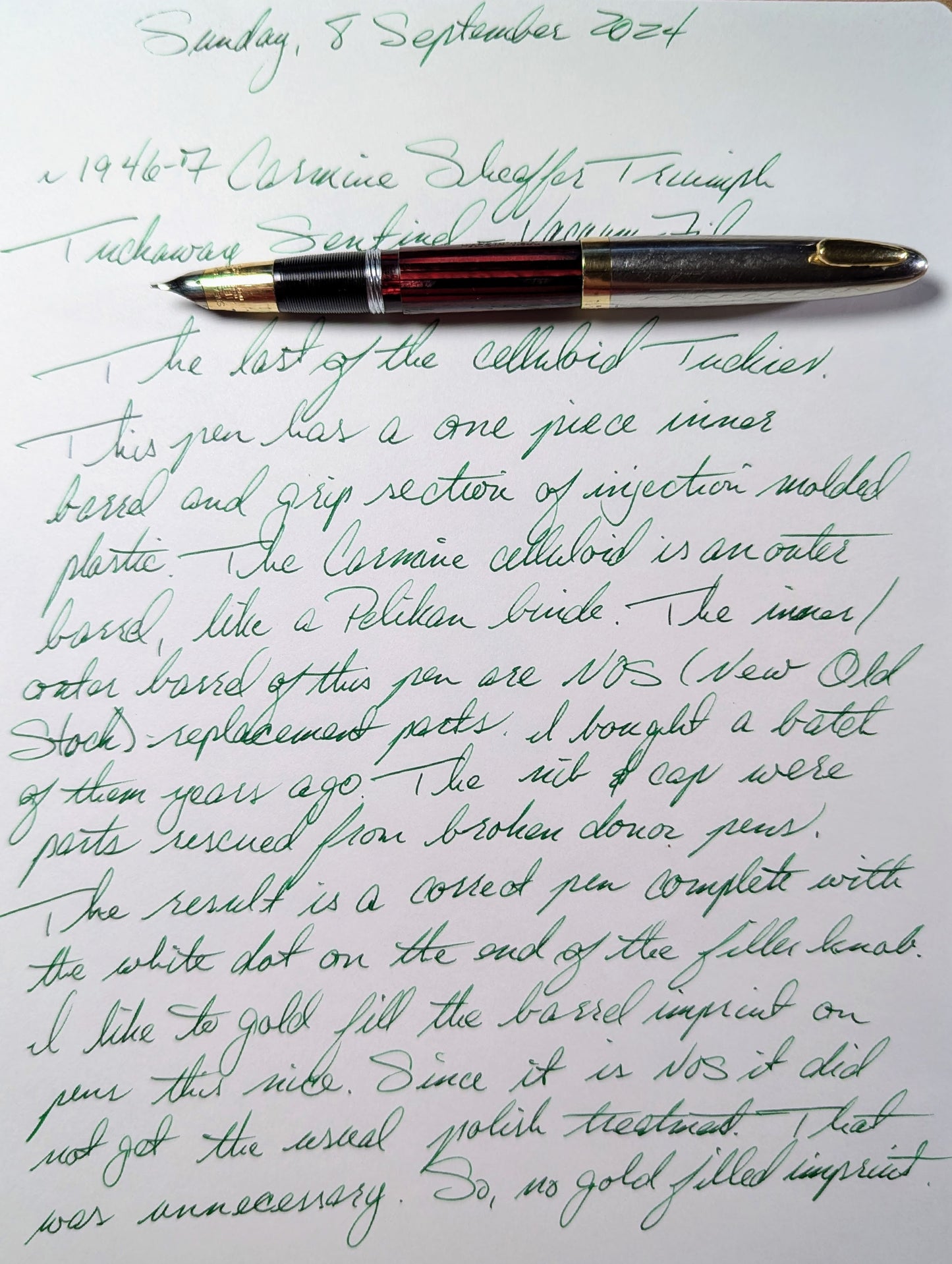 Lamentablemente, la Tuckaway solo se fabricó hasta 1949, aunque en sus diez años de existencia se han producido seis generaciones diferentes. Esta pluma es una Tuckaway de cuarta generación, contemporánea a la Triumph de tercera generación.