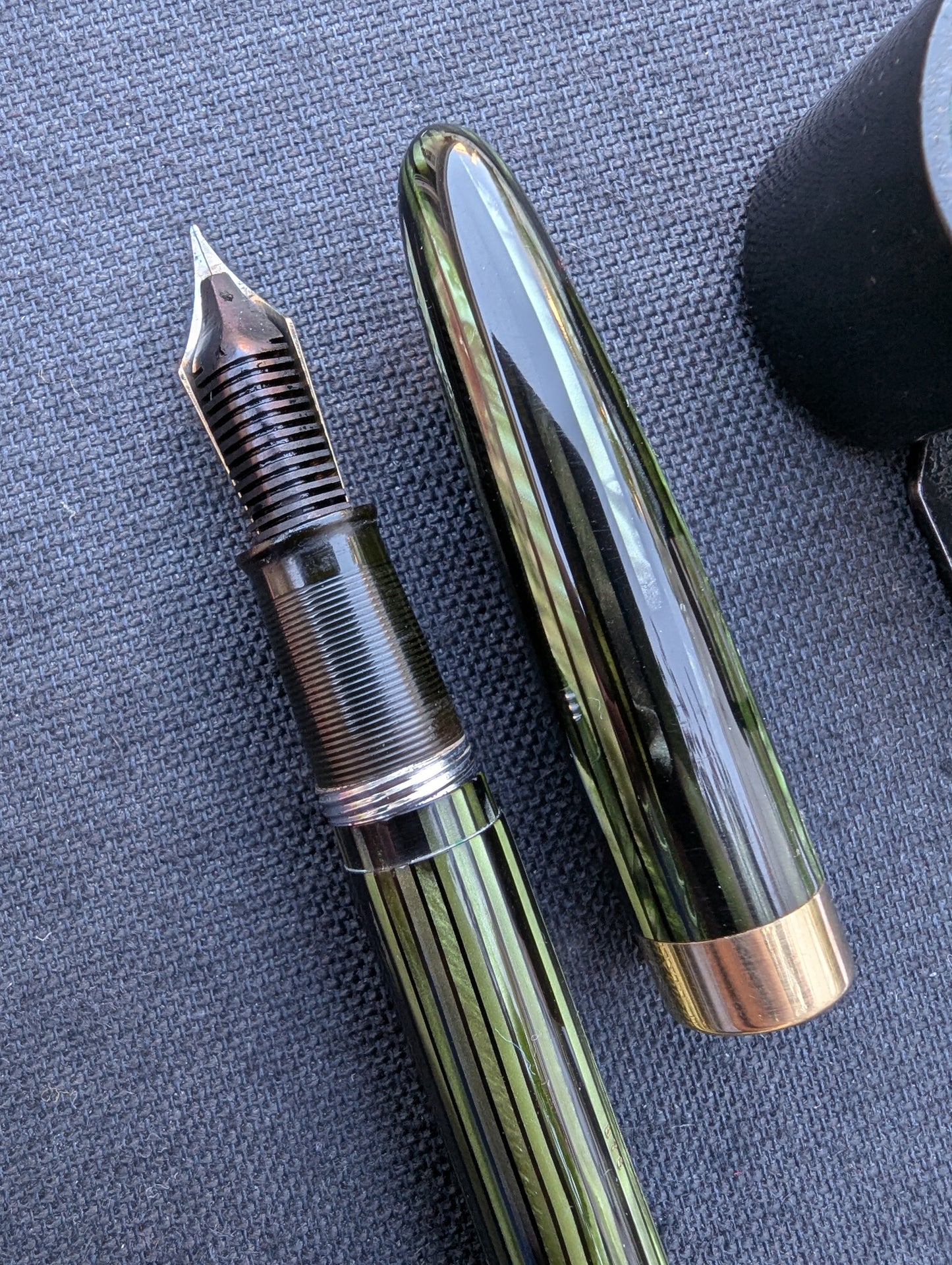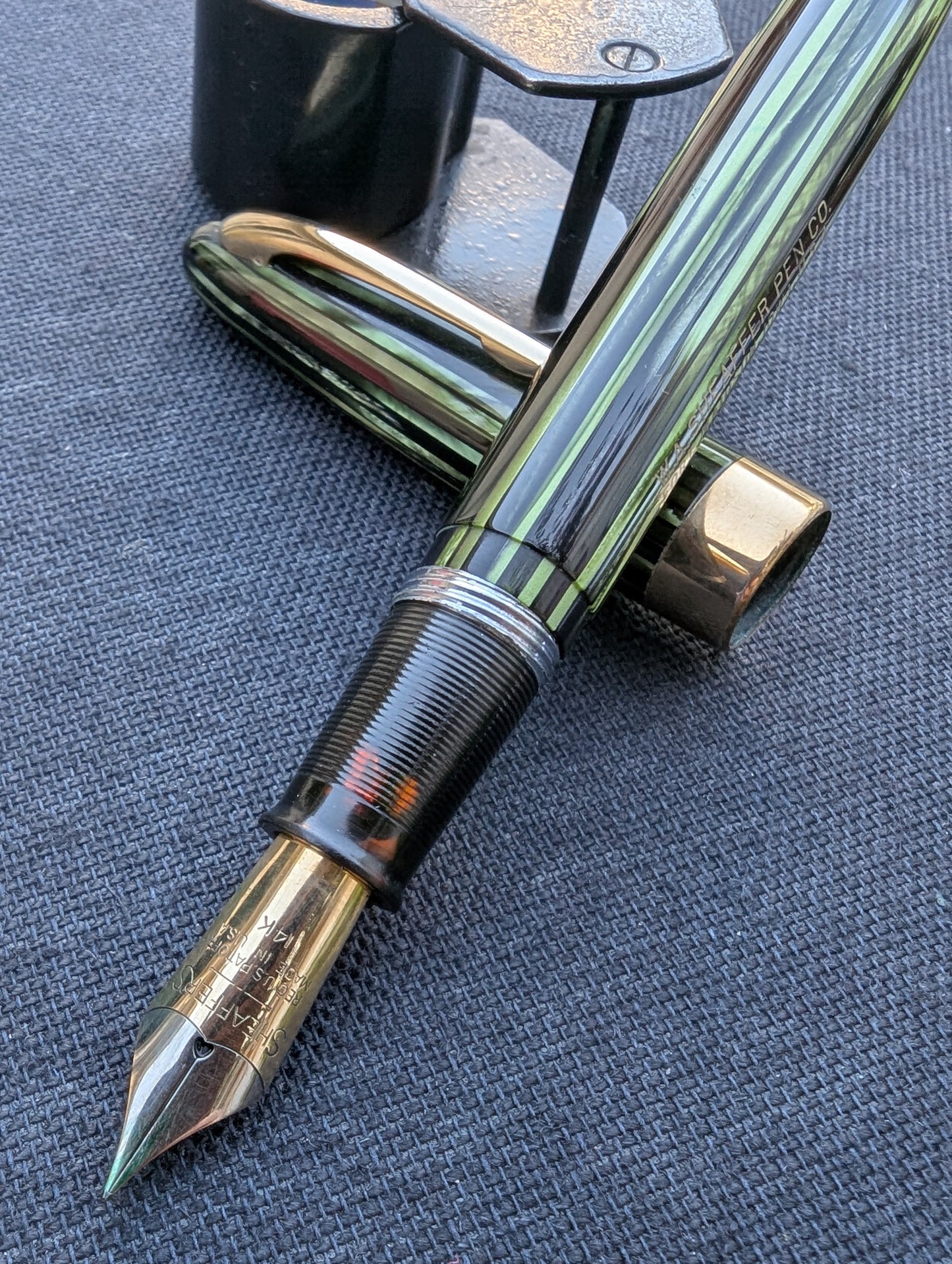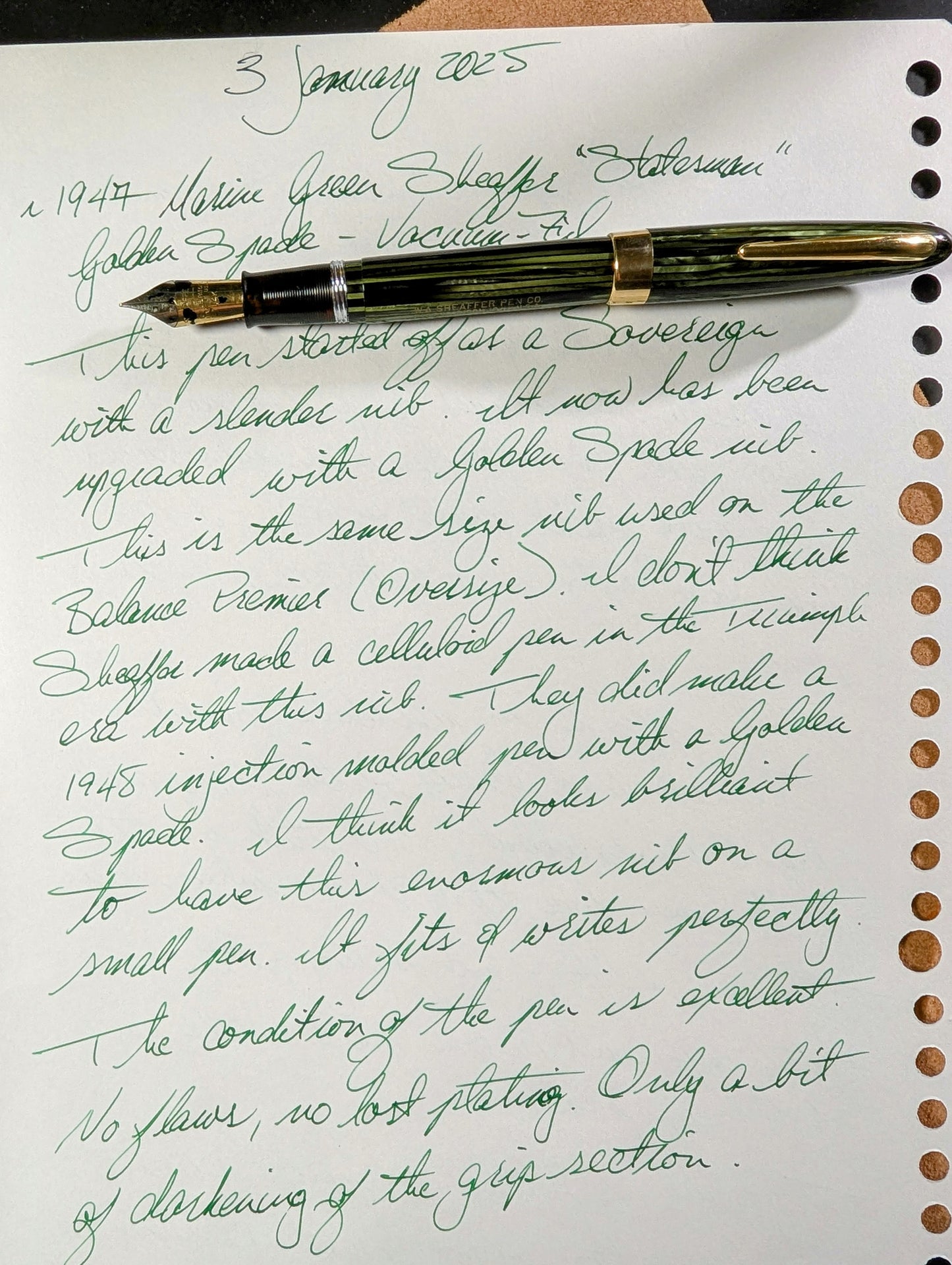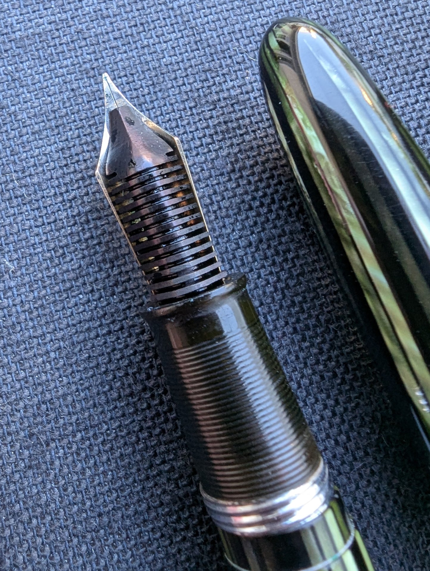He mejorado la punta por una Golden Spade, llamada así por mi amigo Paul Burberry porque es del mismo tamaño que la que se encontraba en la Balance Premier anterior o OverSize. Sheaffer dejó de fabricar las puntas Premier alrededor de 1942, pero introdujeron una nueva punta más grande en la Sheaffer Statesman de 1948, hecha de plástico moldeado por inyección. Es una punta de aspecto impresionante en una pluma vintage delgada. Creo que se ve particularmente bien en la pluma de celuloide anterior. La punta escribe una línea suave, húmeda y fina.