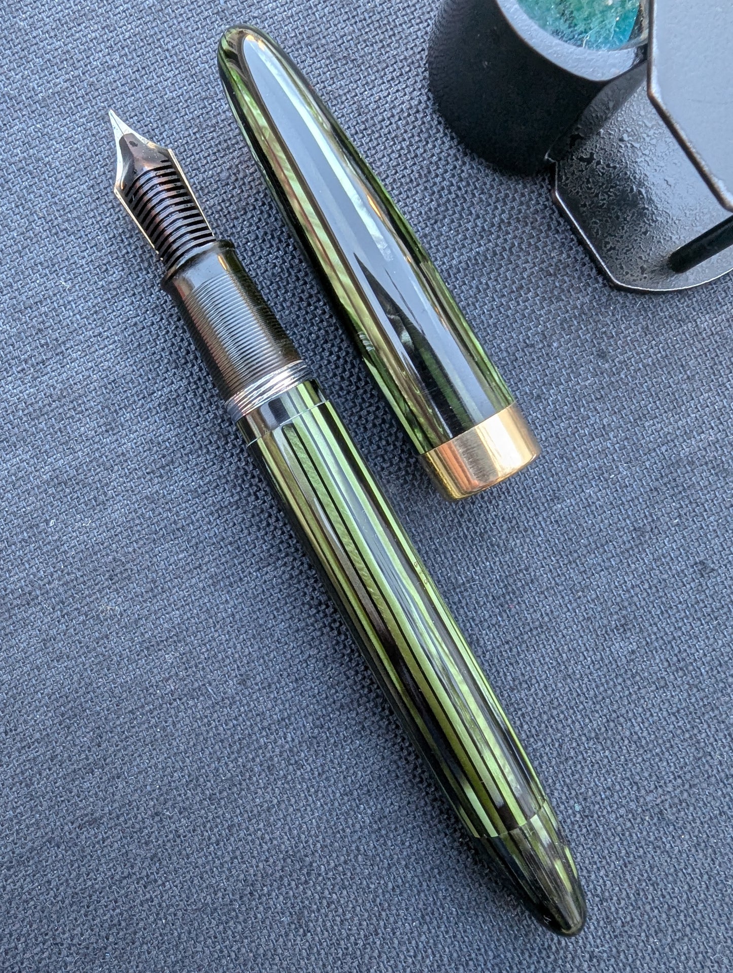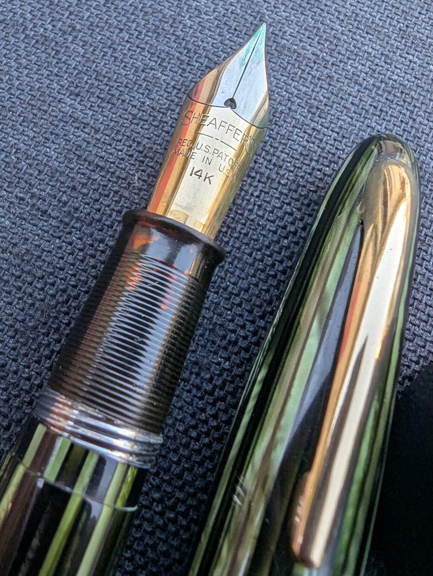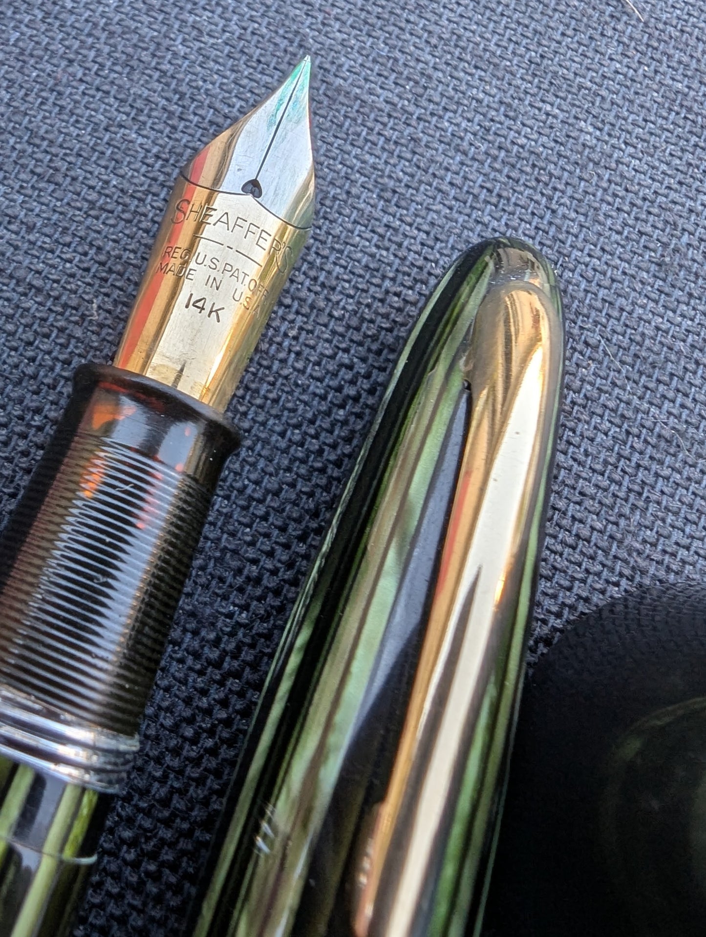 He mejorado la punta por una Golden Spade, llamada así por mi amigo Paul Burberry porque es del mismo tamaño que la que se encontraba en la Balance Premier anterior o OverSize. Sheaffer dejó de fabricar las puntas Premier alrededor de 1942, pero introdujeron una nueva punta más grande en la Sheaffer Statesman de 1948, hecha de plástico moldeado por inyección. Es una punta de aspecto impresionante en una pluma vintage delgada. Creo que se ve particularmente bien en la pluma de celuloide anterior. La punta escribe una línea suave, húmeda y fina.