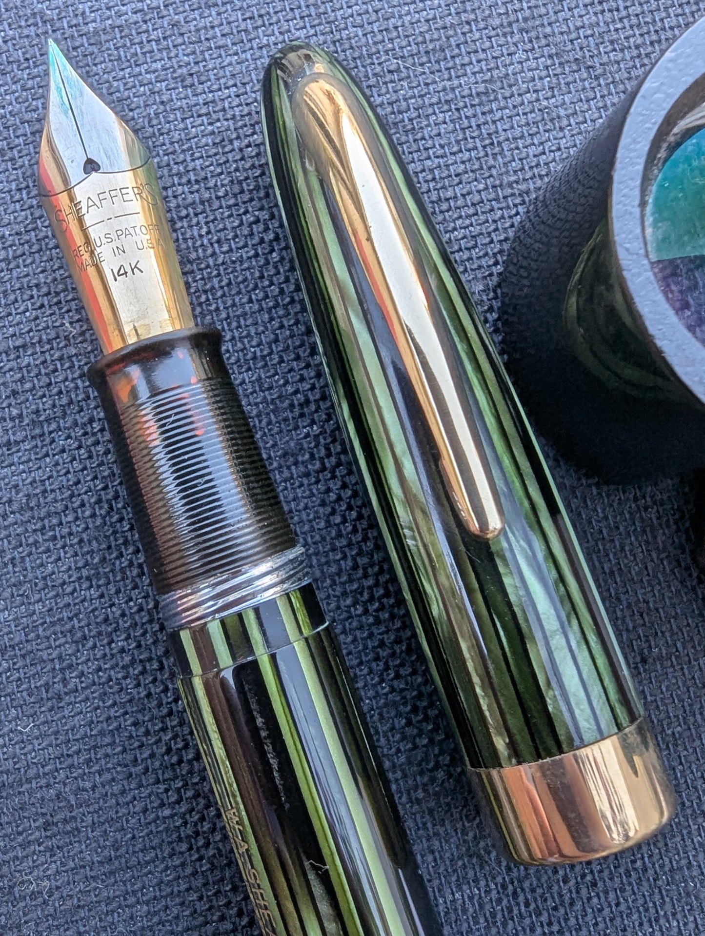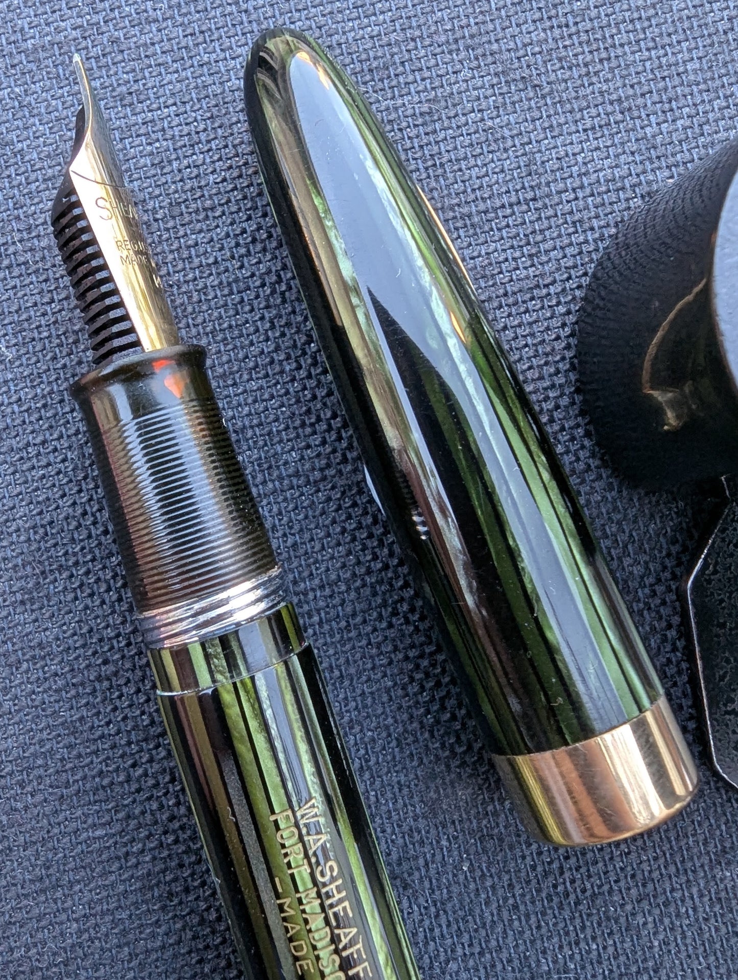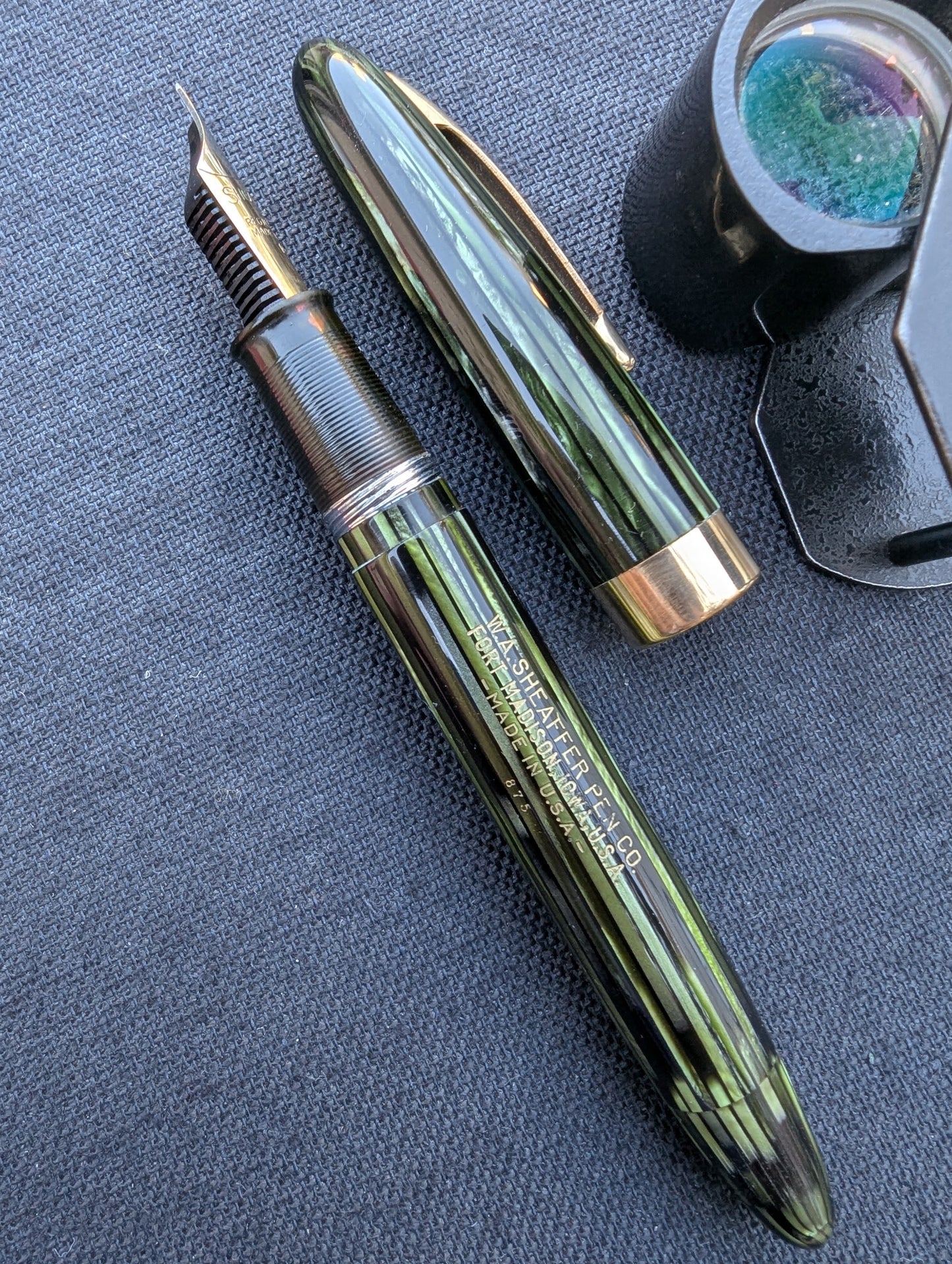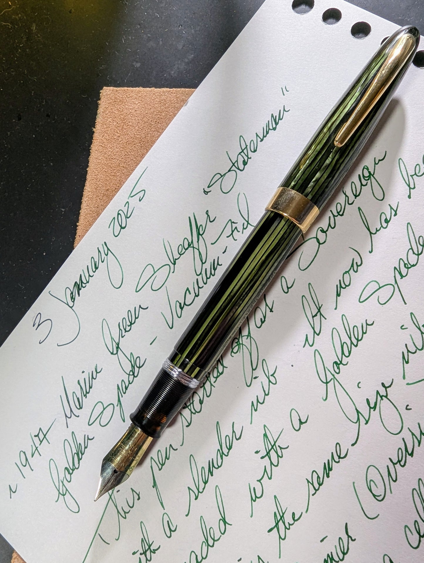 He mejorado la punta por una Golden Spade, llamada así por mi amigo Paul Burberry porque es del mismo tamaño que la que se encontraba en la Balance Premier anterior o OverSize. Sheaffer dejó de fabricar las puntas Premier alrededor de 1942, pero introdujeron una nueva punta más grande en la Sheaffer Statesman de 1948, hecha de plástico moldeado por inyección. Es una punta de aspecto impresionante en una pluma vintage delgada. Creo que se ve particularmente bien en la pluma de celuloide anterior. La punta escribe una línea suave, húmeda y fina.