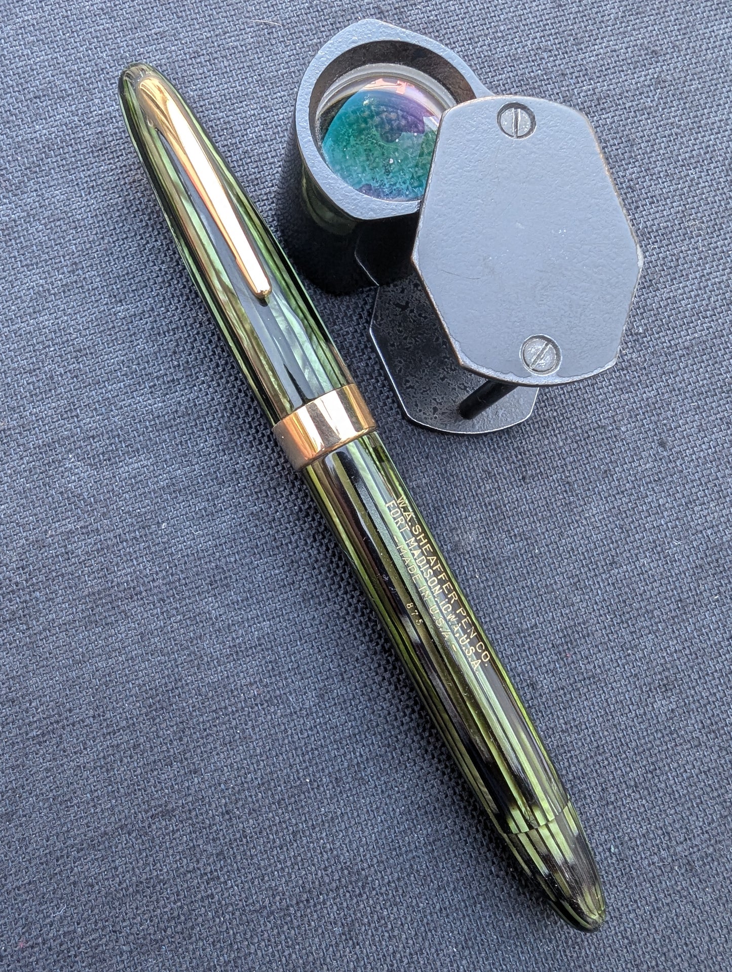 Esta pluma salió de la fábrica Sheaffer en Ft. Madison, Iowa, como una Sovereign con una punta fina. Esto se indica mediante el código de precio 875 debajo de la impresión del cuerpo que indica el precio de venta de $8,75.