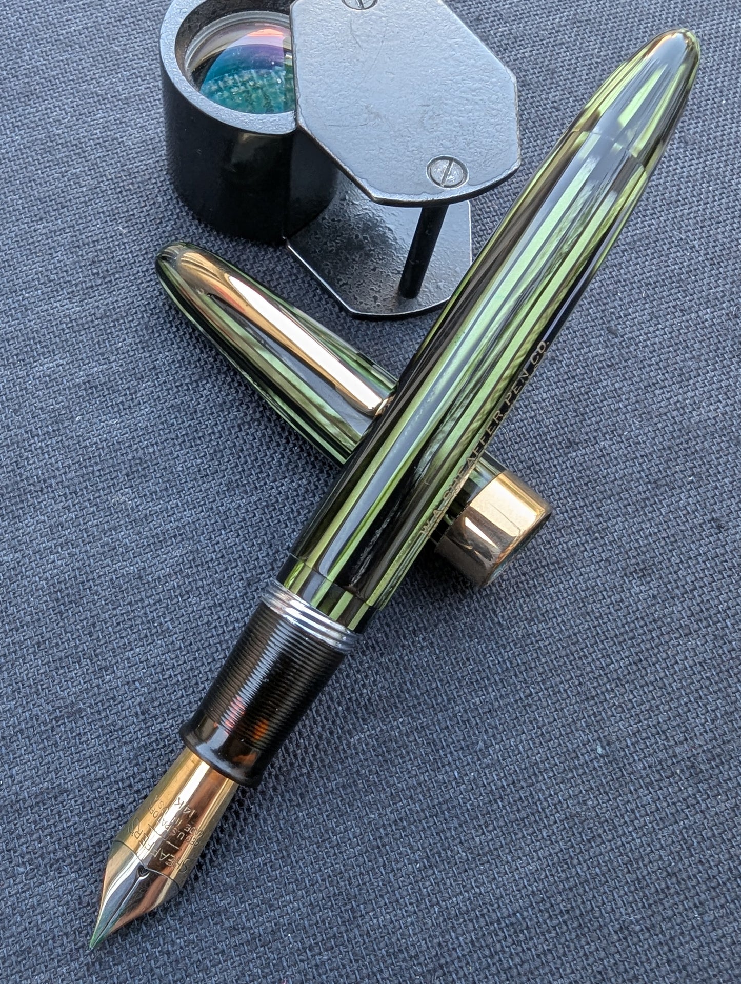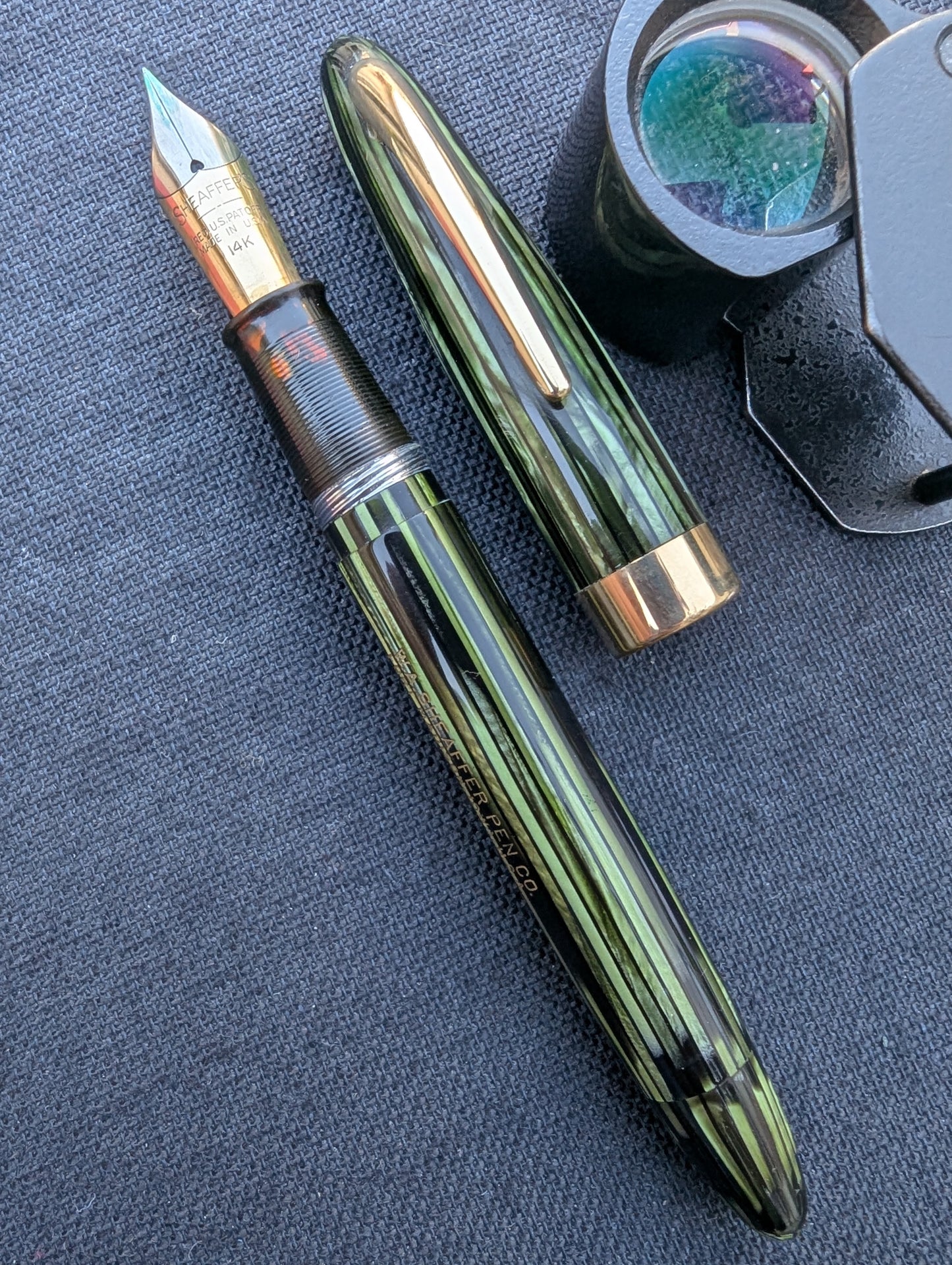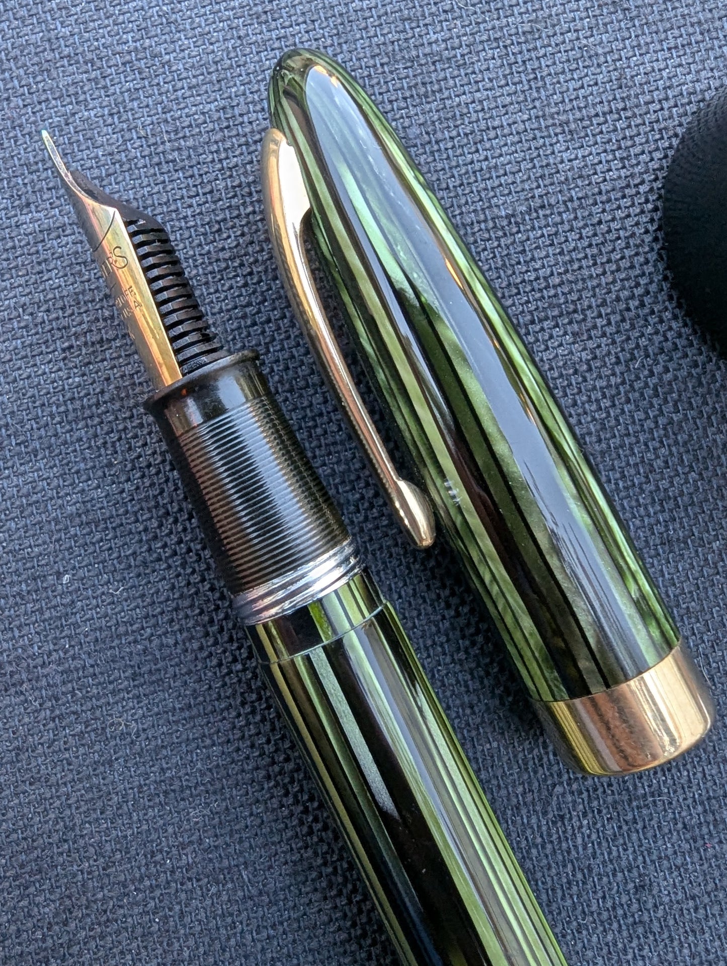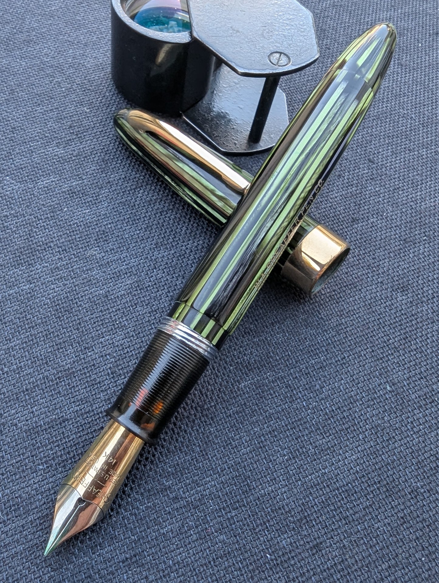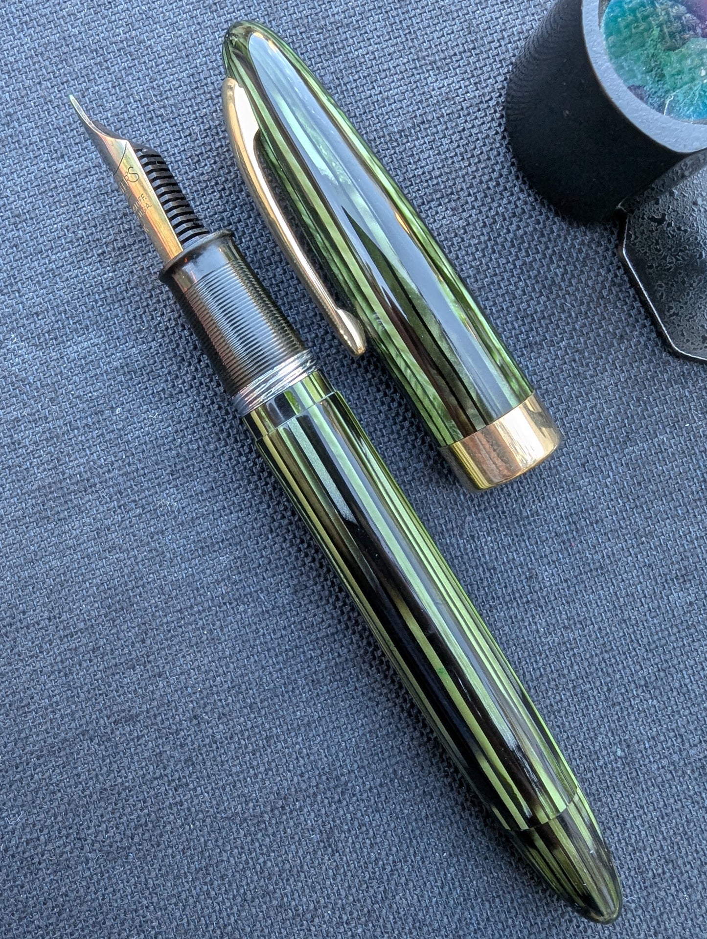 Pluma estilográfica Sheaffer Sovereign Statesman verde marino de 1947 - Llenado al vacío - Punta fina de pala dorada