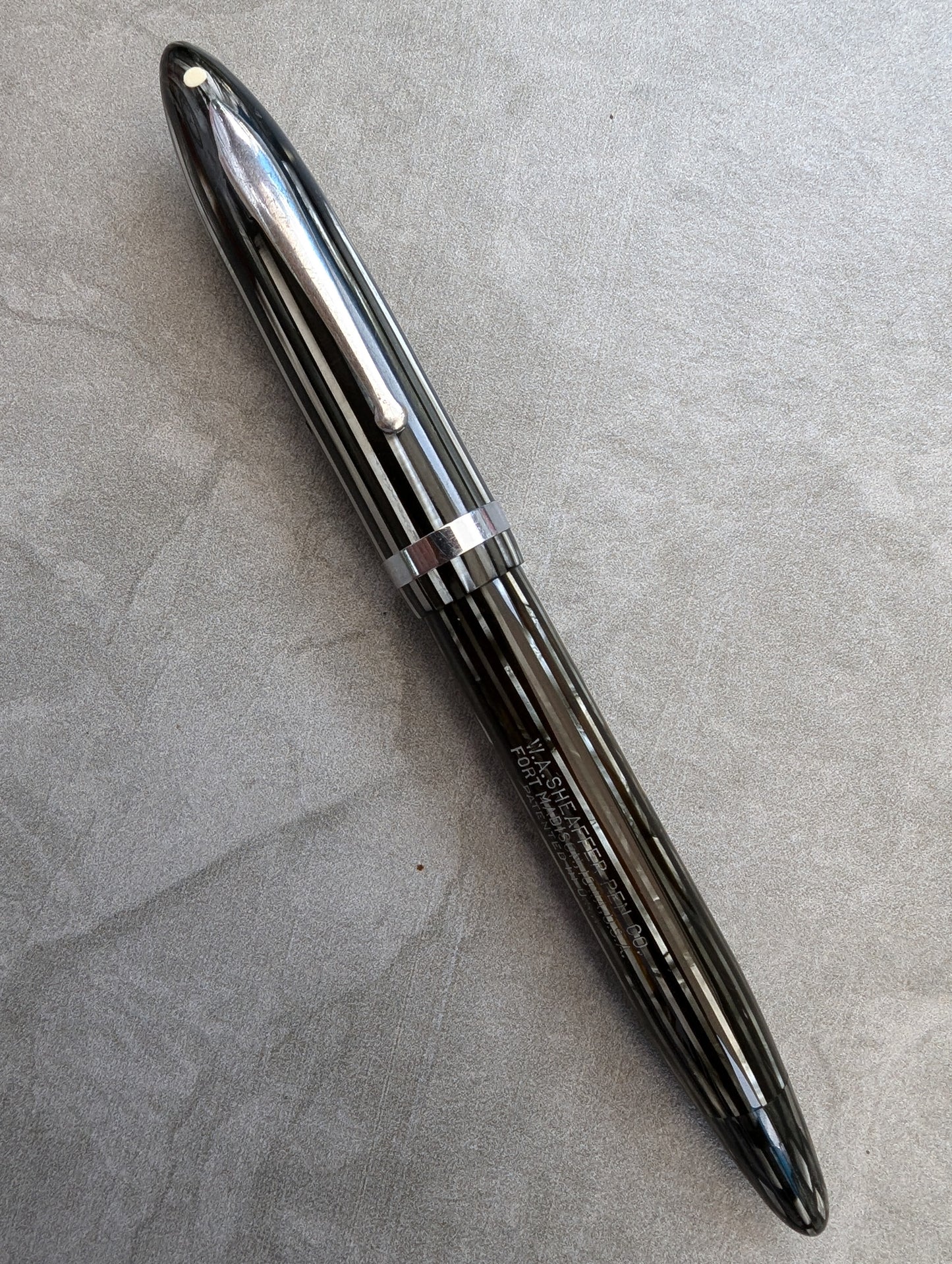No es habitual encontrar lapiceras antiguas en este estado. La exposición a los rayos ultravioleta hace que los preciosos cuerpos transparentes se vuelvan oscuros y turbios. Esta lapicera tiene un hermoso celuloide con muy buena claridad y color. Creo que pasó la mayor parte de su vida, si no toda, en una caja. El único defecto es una pequeña pérdida de recubrimiento al final del clip.