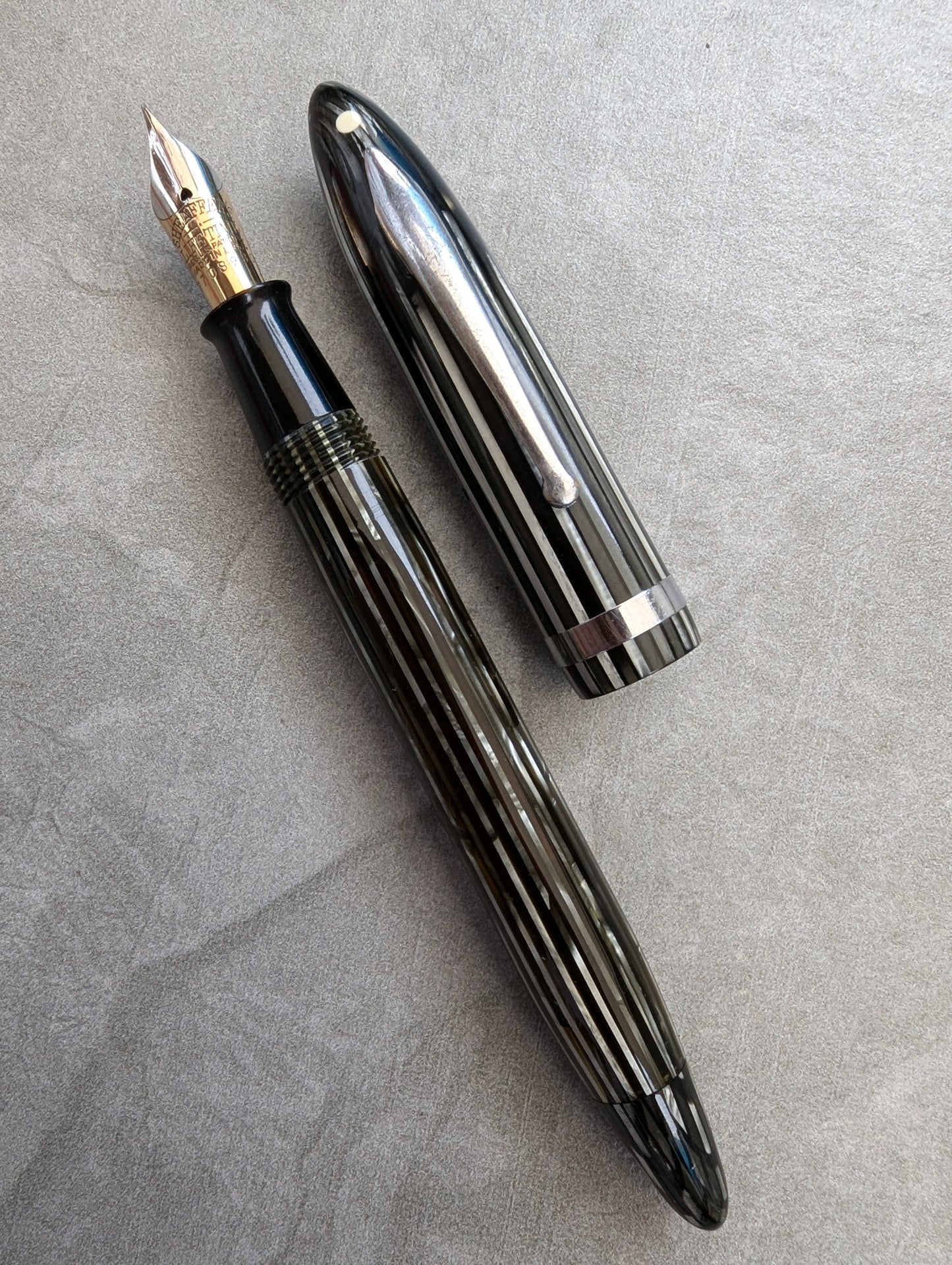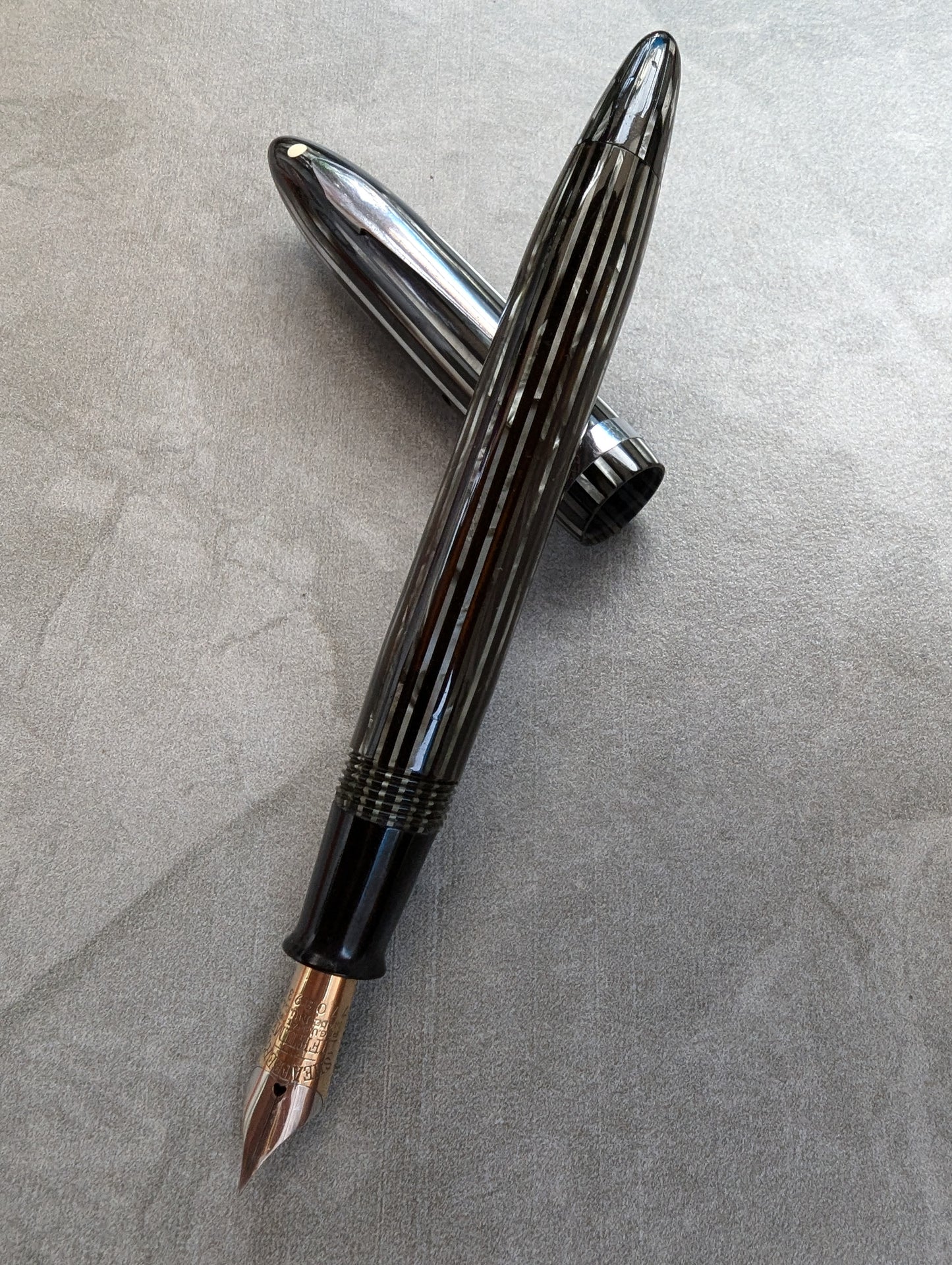 La punta escribe una línea suave, húmeda y fina. El sistema de llenado se restauró recientemente con materiales sintéticos modernos que durarán años con solo un toque ocasional de grasa de silicona pura en la varilla de llenado.