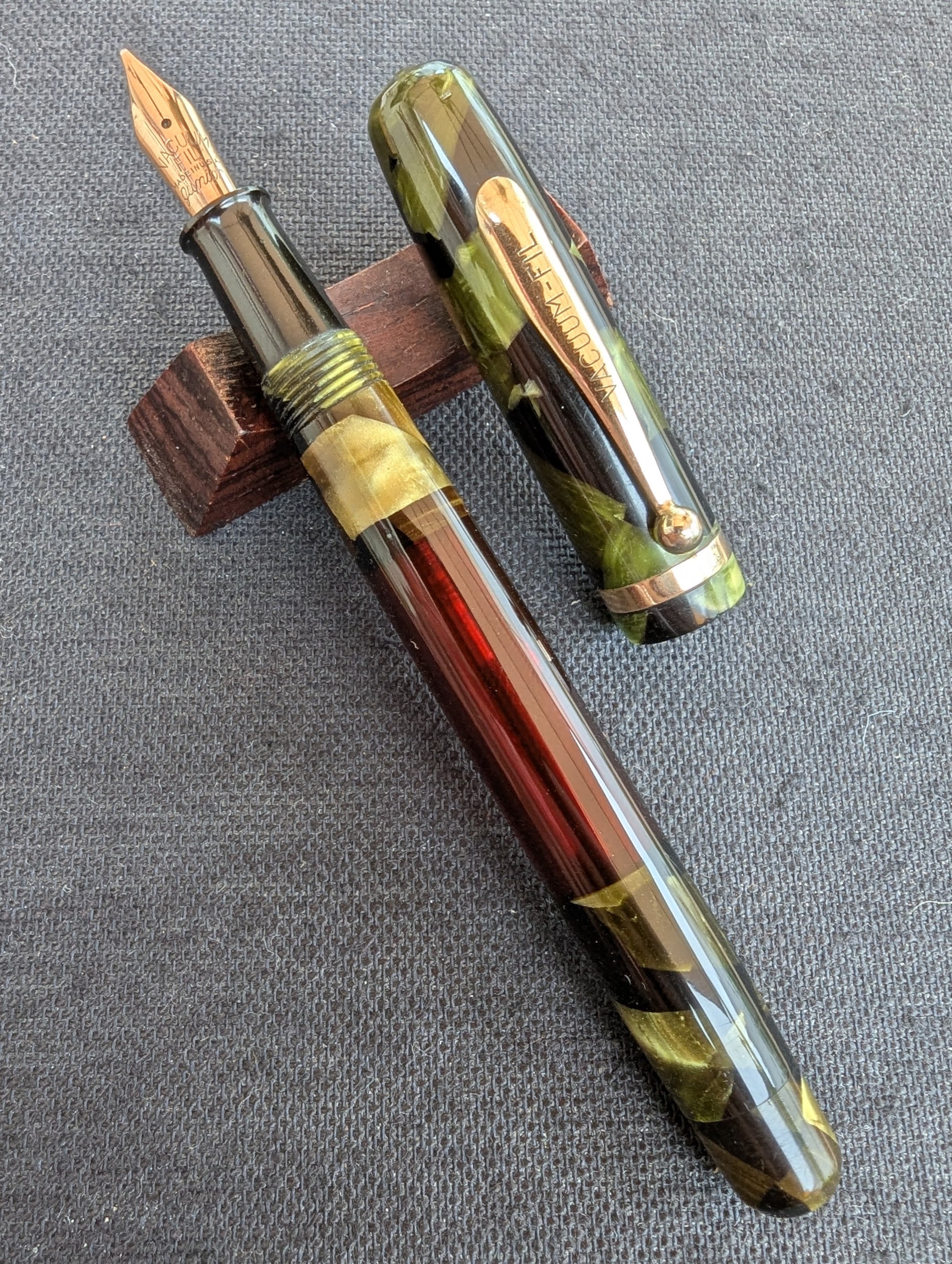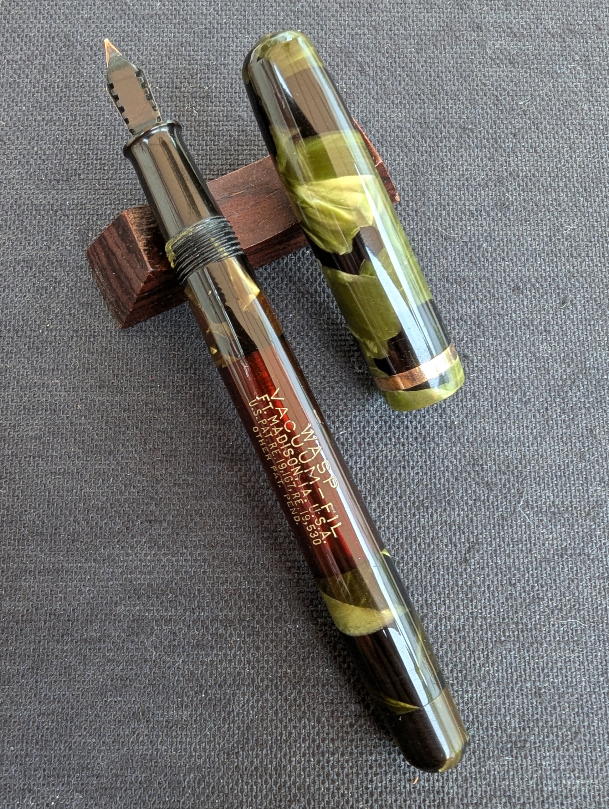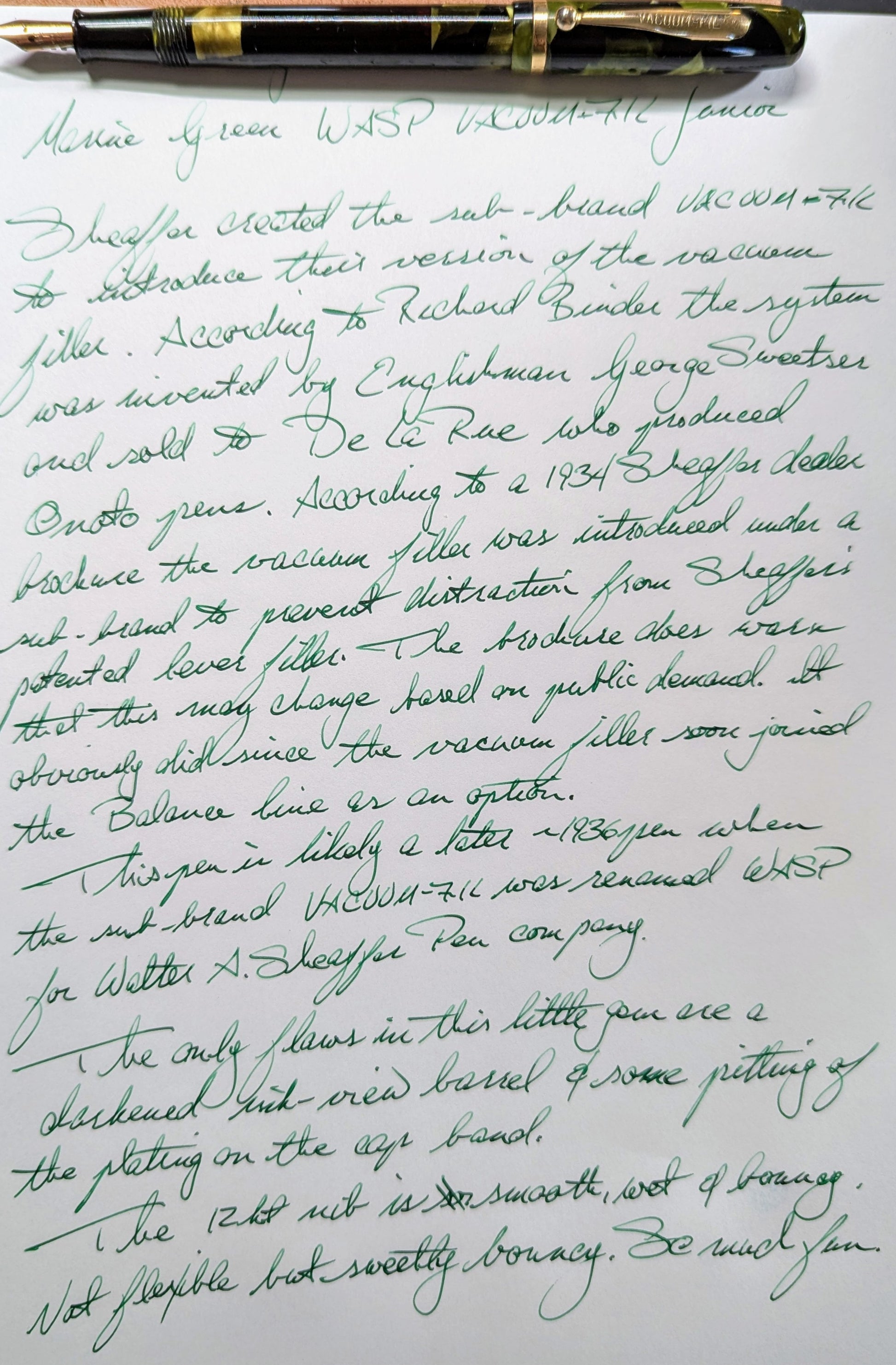 This pen is likely a later ~1936 production when the sub-brand VACUUM-FIL was renamed WASP - Walter A. Sheaffer Pen company. Earlier pens would have been marked only VACUUM-FIL while this barrel imprint is WASP, VACUUM-FIL.