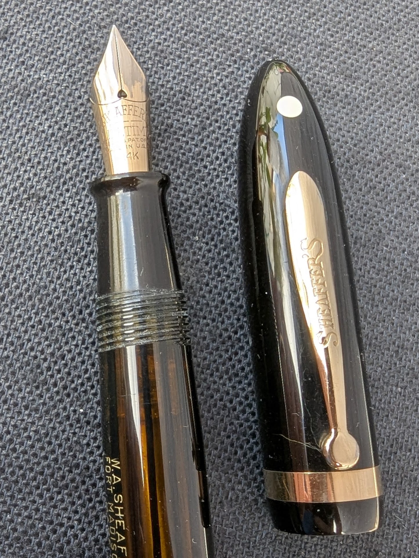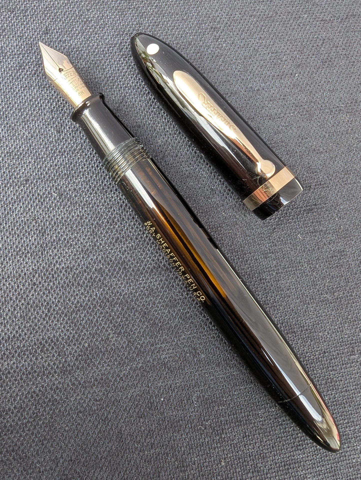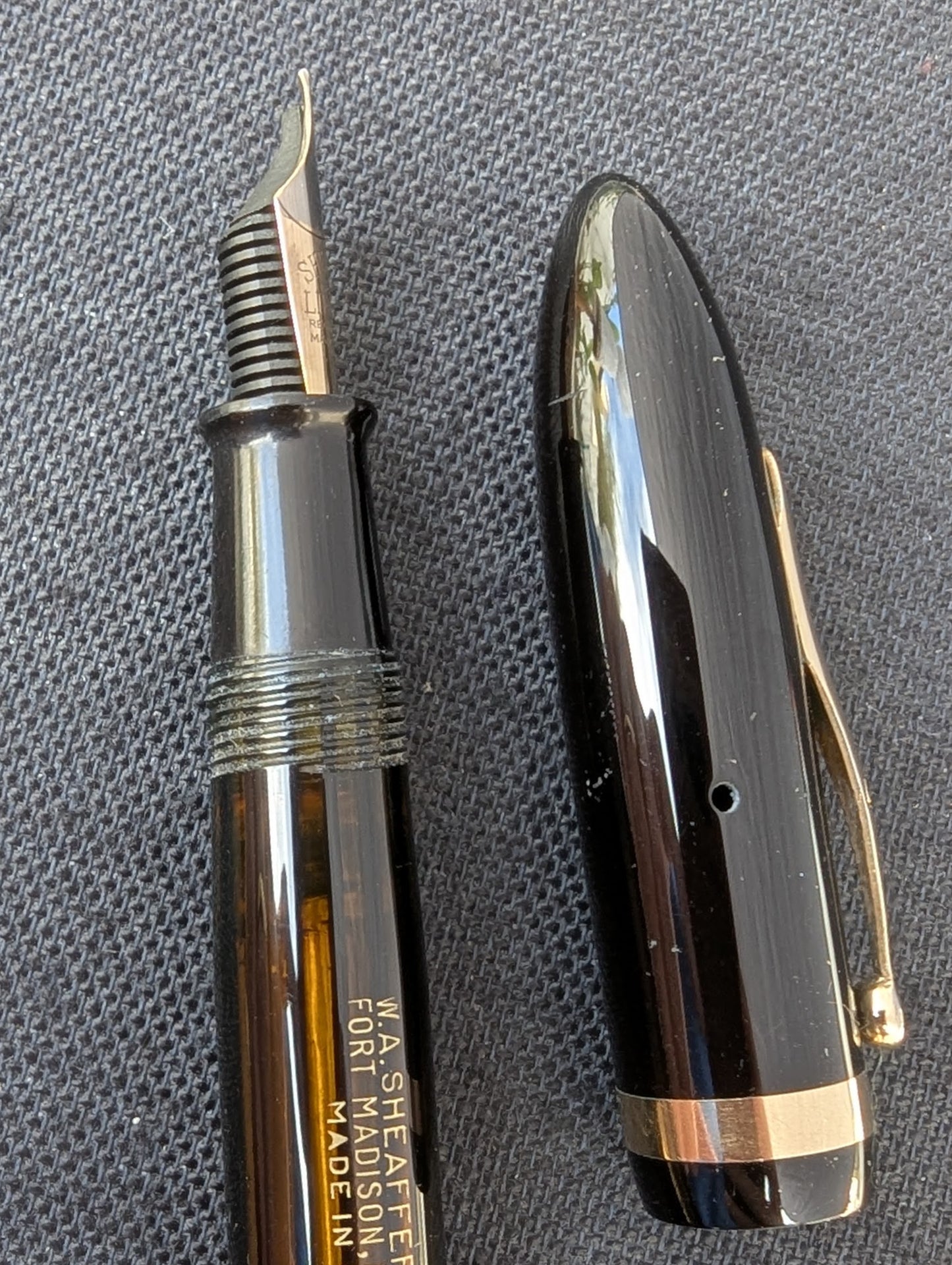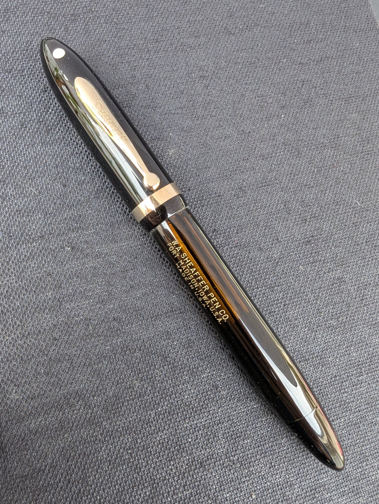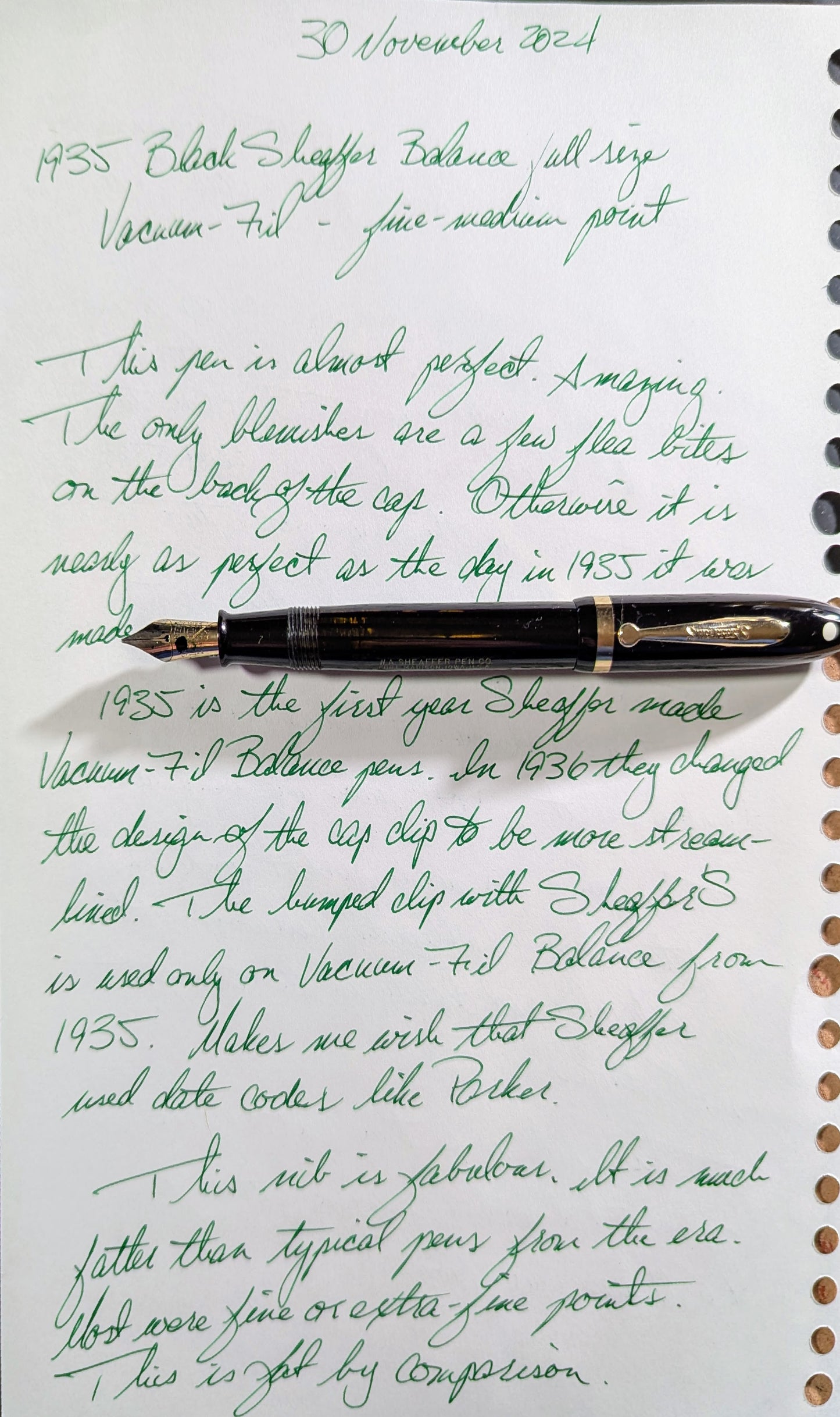 Sheaffer a introduit sa version du remplisseur sous vide dans sa gamme Balance en 1935. Il s'agit d'un Sheaffer Balance Vacuum-Fil de première année. La clé est le clip à capuchon bombé. 1935 est la dernière année pour ce clip qui a été remplacé en 1936 par un clip profilé sans empreinte.