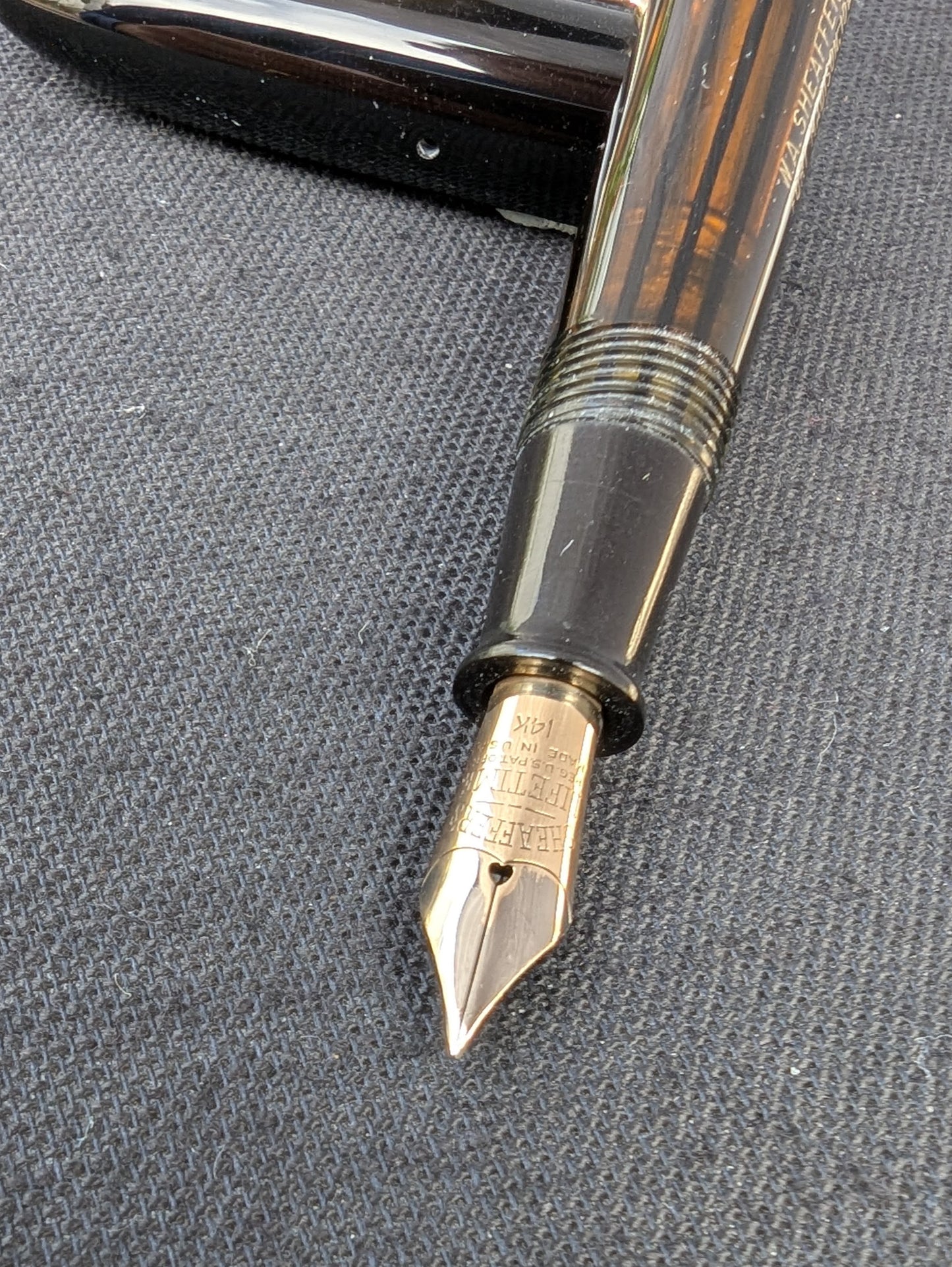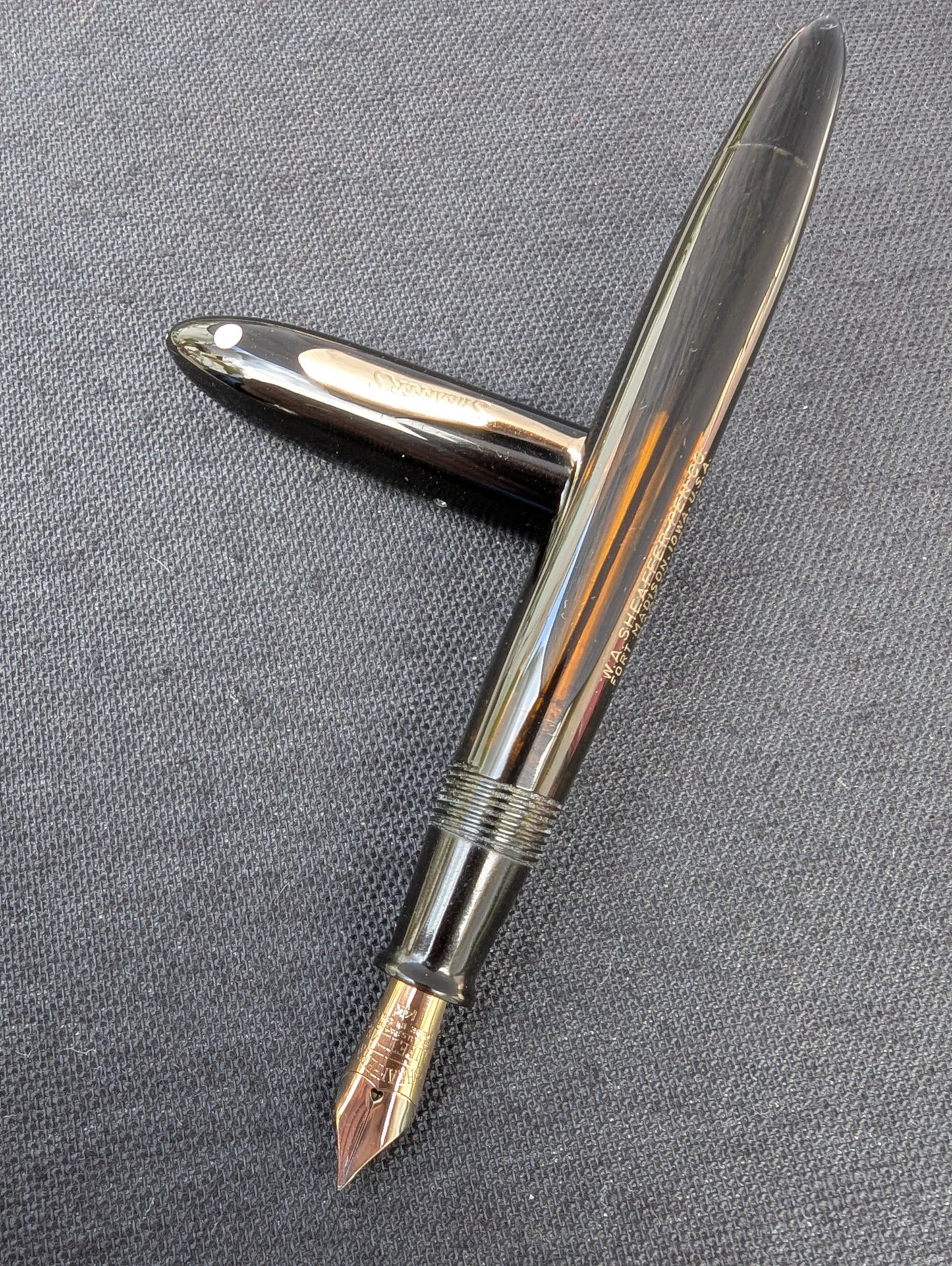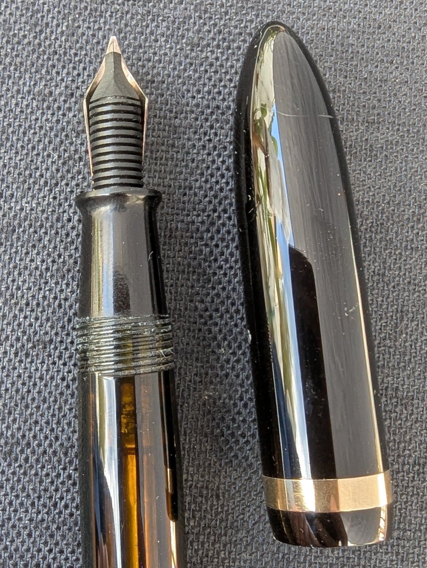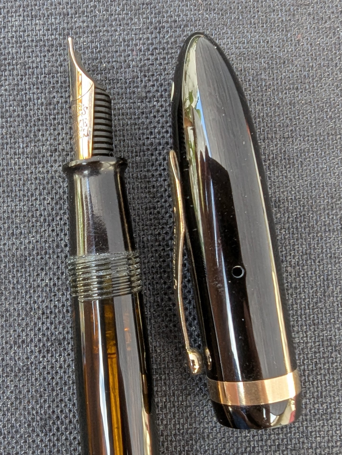 La couleur et la clarté du corps sont excellentes, presque parfaites. Le placage est parfait, tout comme le celluloïd, à l'exception de quelques petites piqûres de puces au dos du capuchon.