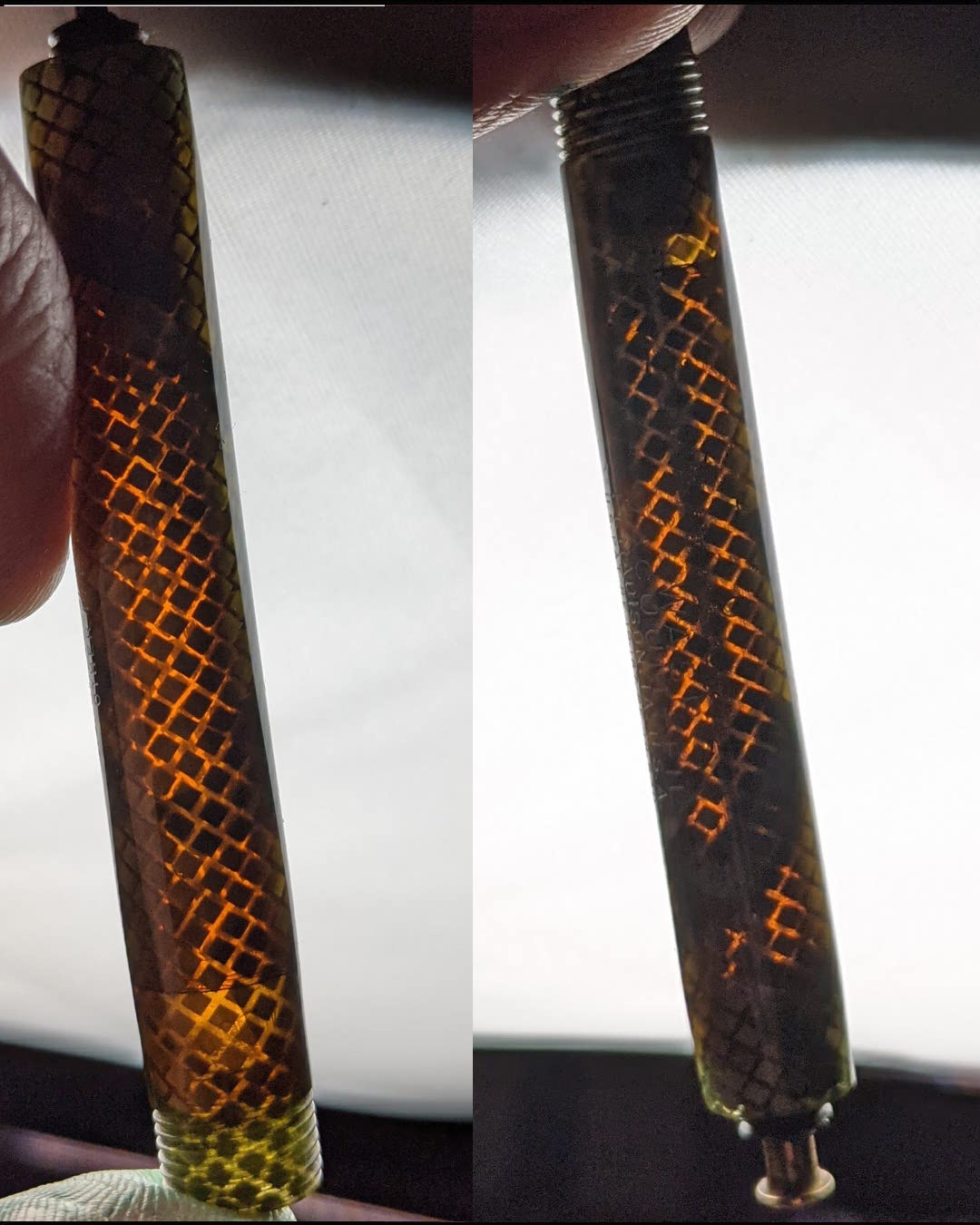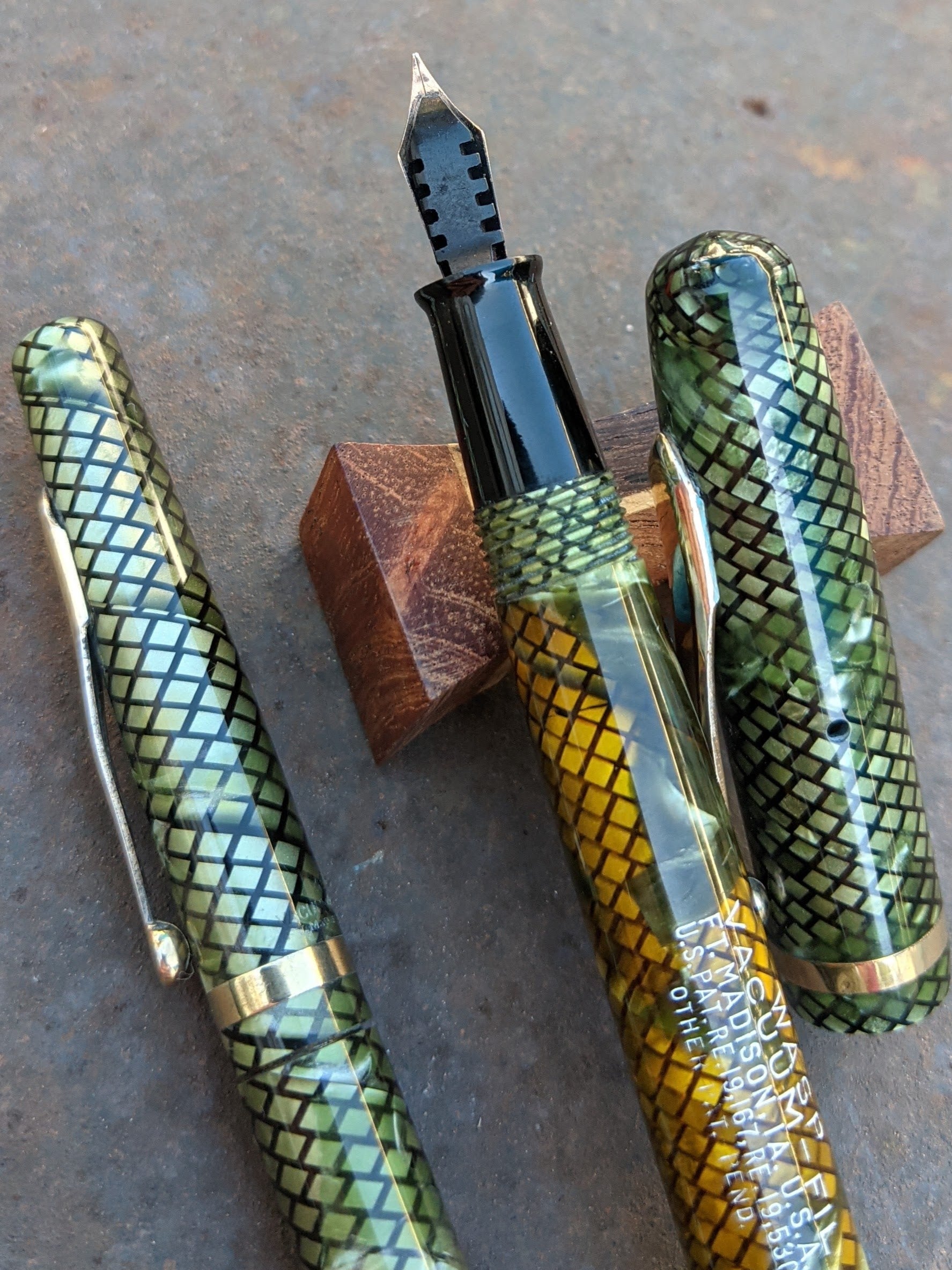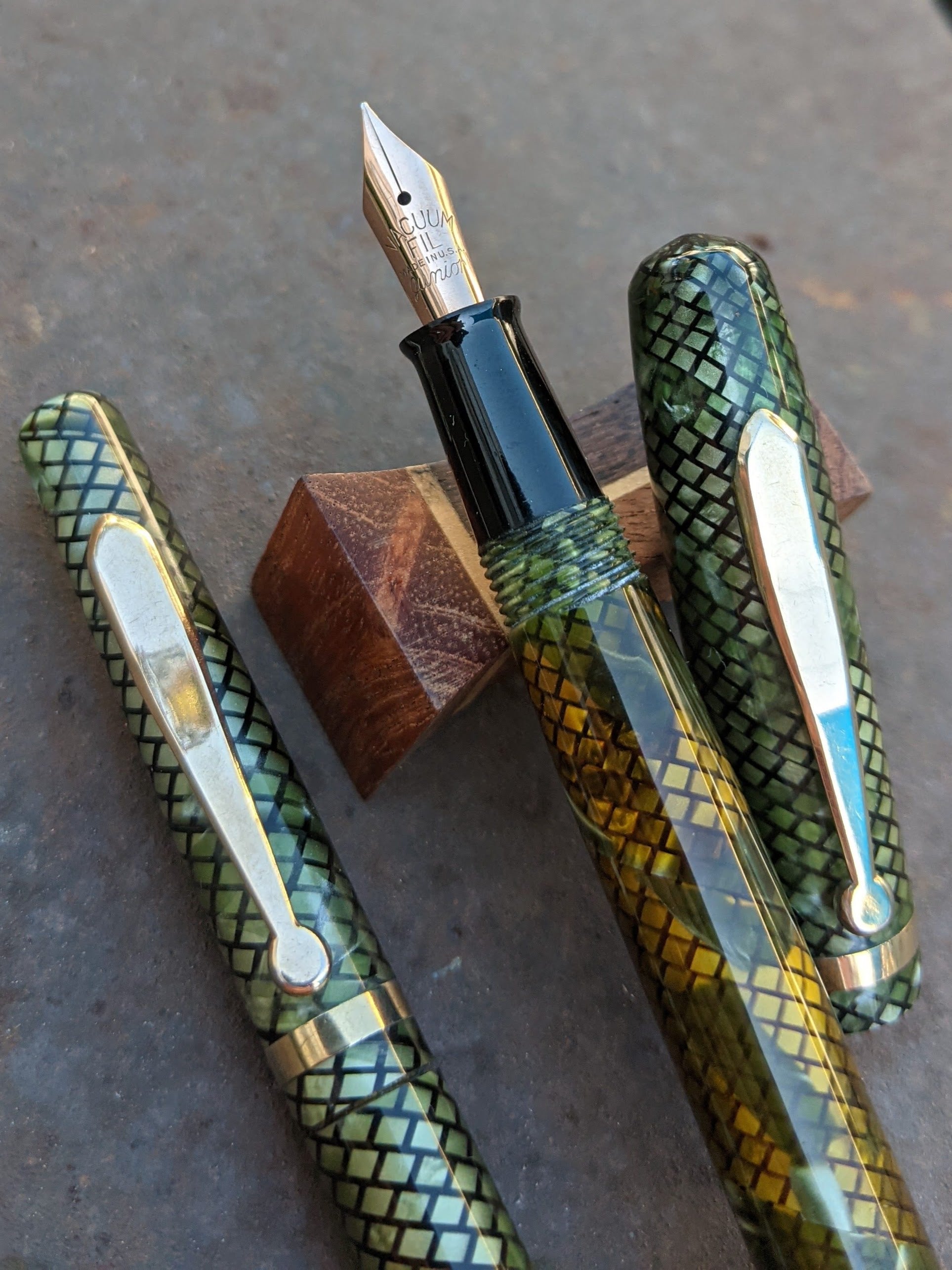 Ce stylo est en excellent état. Le corps n'a que légèrement noirci par rapport au capuchon. La transparence est très bonne. Le celluloïd et le placage sont parfaits. La tige recouverte de celluloïd a rouillé et a été remplacée par une tige en acier inoxydable recouverte d'oxyde noir fabriquée sur mesure qui durera toute la vie du stylo.