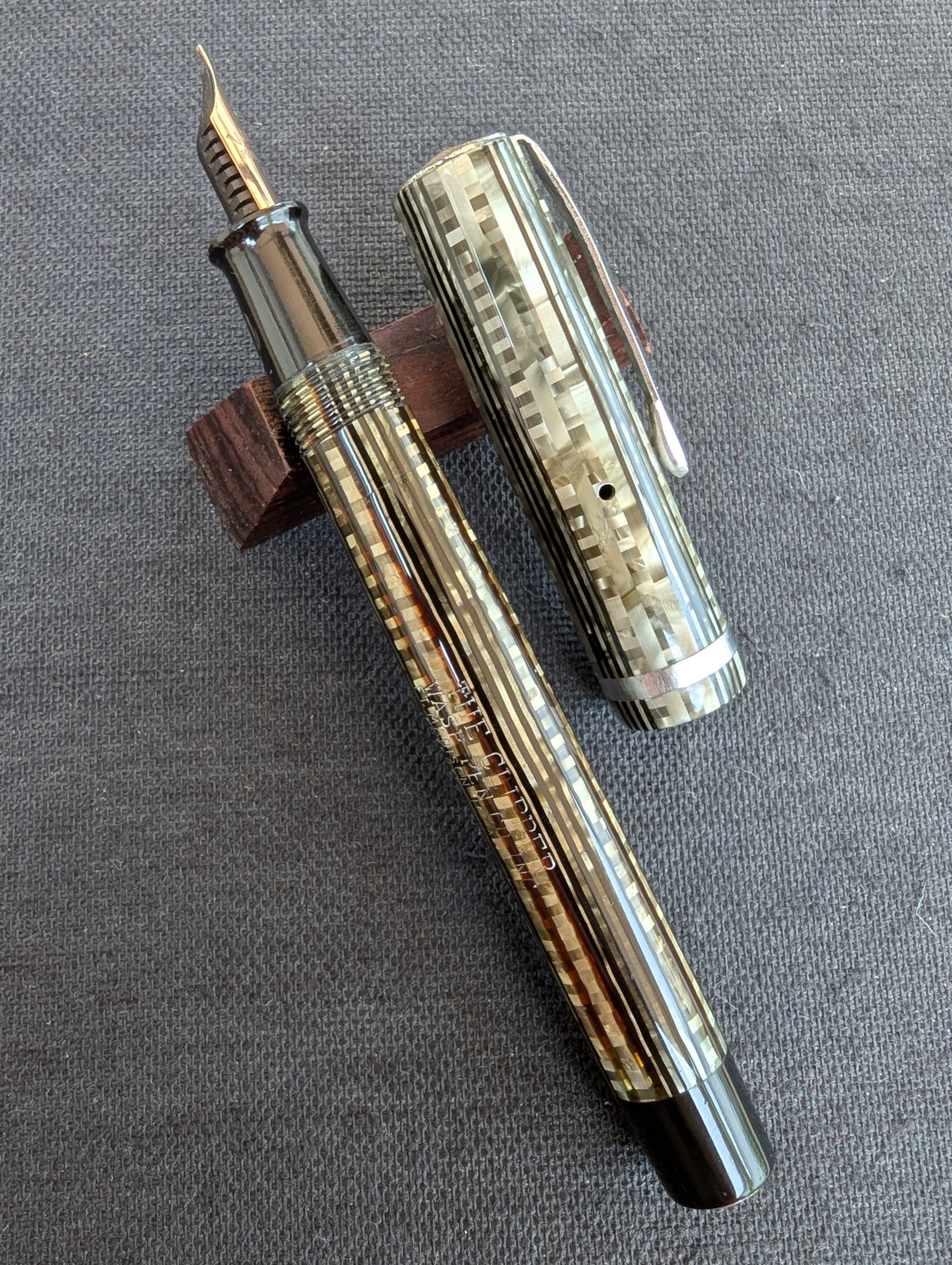The plating on the clip and band is in excellent condition. The plating on the cap and blind cap cabochons is quite worn. The barrel transparency has darkened. The celluloid is otherwise without blemish. There are 2 plier marks on the grip section but they are shallow and I don't feel them at all when using the pen. The nib is smooth, wet, and bouncy.
