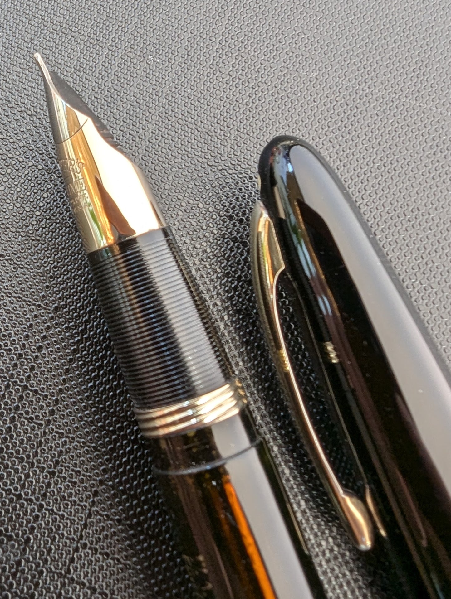 Ce stylo est en excellent état. La transparence et la clarté du corps sont très bonnes. Il n'y a aucun défaut dans le celluloïd ou le placage. La plume est une LIFETIME plus grande et plus longue que les plumes 59 et 79 à pointe plus courte. Le bonus est la grande pointe moyenne humide. Elle écrit une ligne ferme, humide et épaisse.