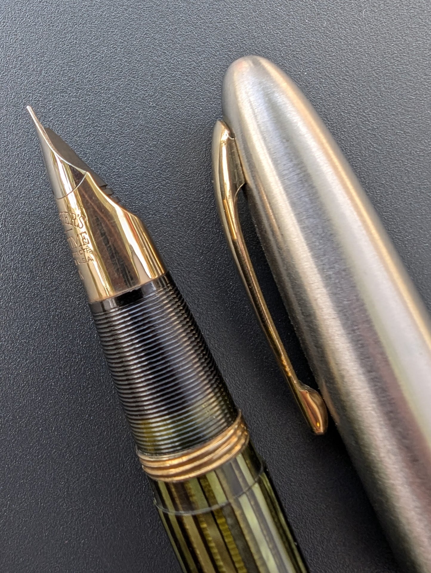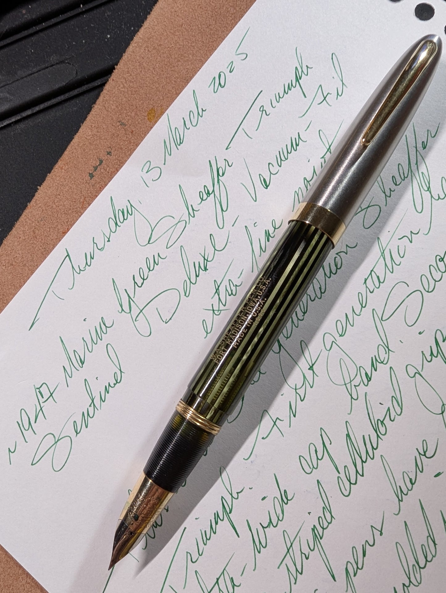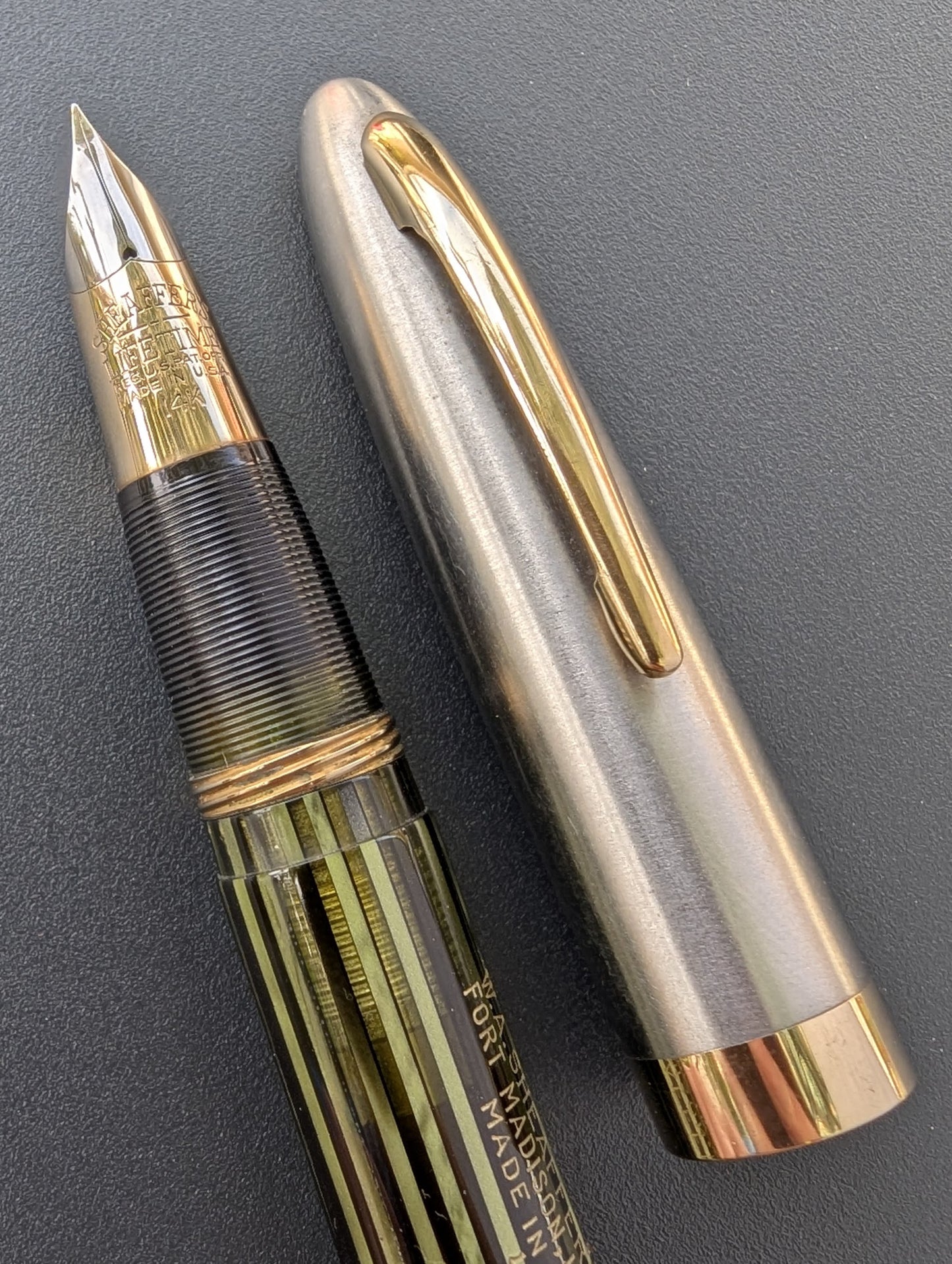 Sentinel Deluxe are one of the three largest Triumph models that Sheaffer made. It's siblings are the Valiant (celluloid cap) and the Crest Deluxe (rolled gold cap). I personally like the Sentinel Deluxe the best of those. The brushed steel cap looks very nice. There is a smaller Triumph Sentinel that is a sibling of the Triumph Statesman. But, this is the big one.