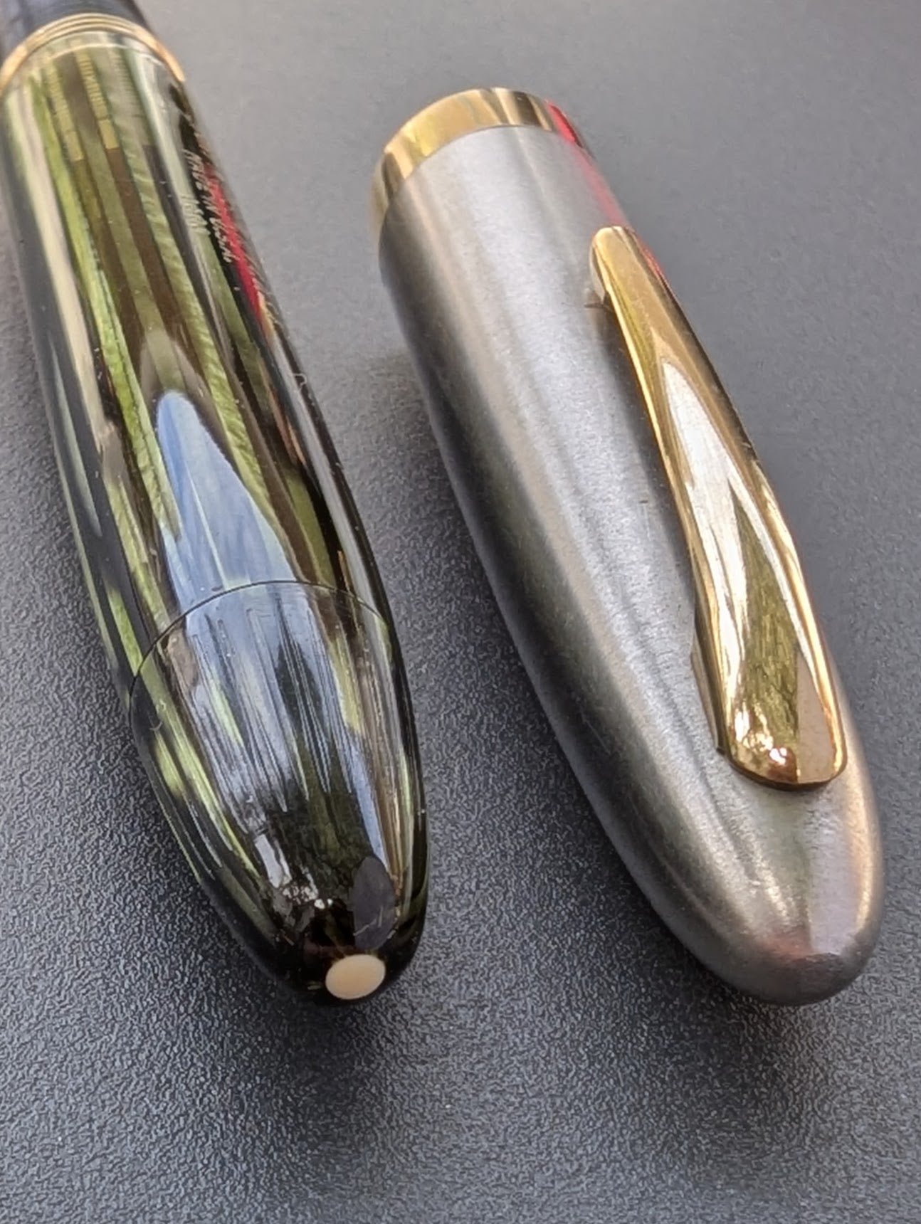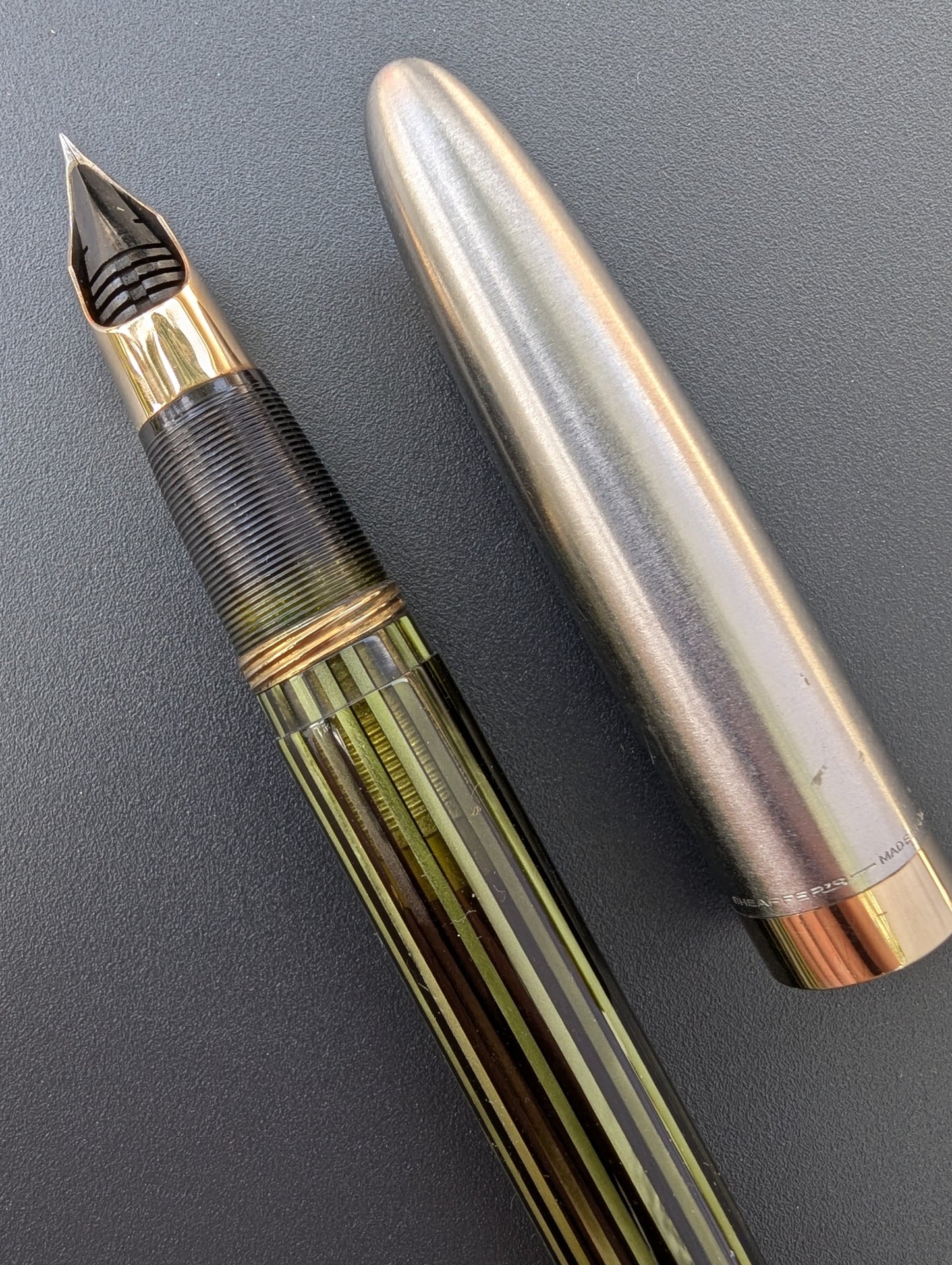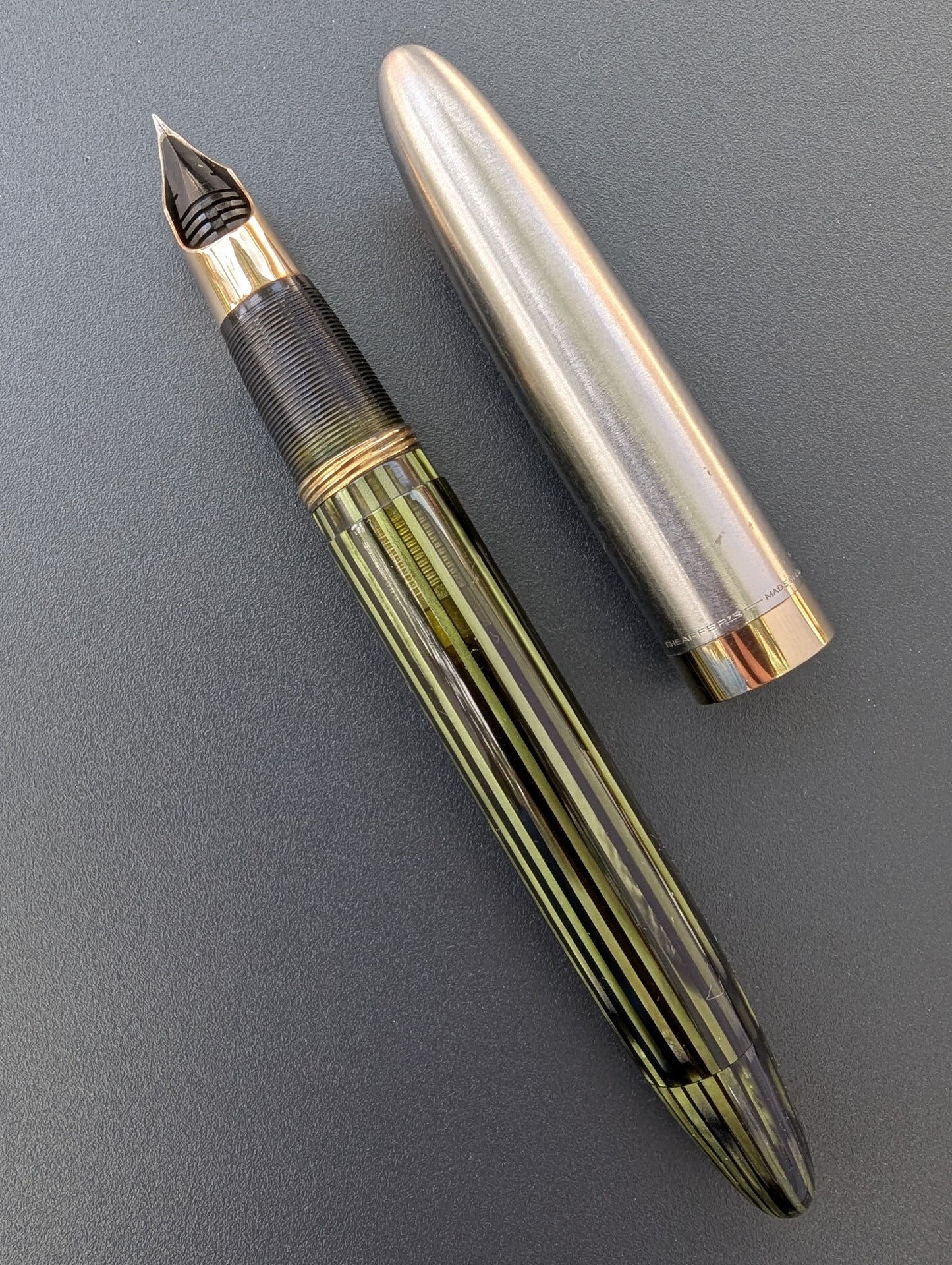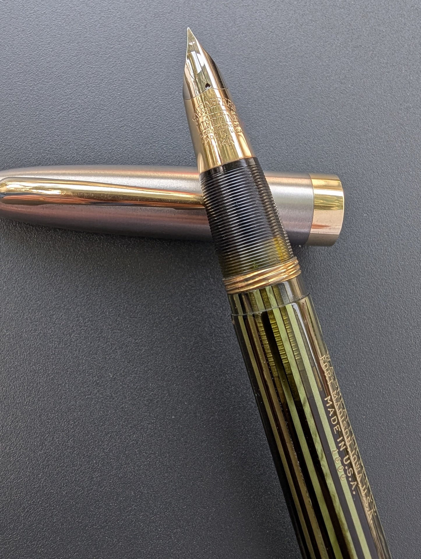 These steel caps are difficult to find without dents in the peak. Or, without any dents at all. This cap is perfect. The entire pen is in amazing condition. The clip is tight, straight and has an excellent spring. The ink view grip section still has the original pale green hue and amazing transparency. I believe this is an early production model because the 1/2 inch (12.7 mm) of the barrel binde nearest the grip section is transparent, allowing even better viewing of the ink level. Later pens of this generation have fully opaque barrel bindes. The green striped celluloid is unblemished and is polished to be like new.