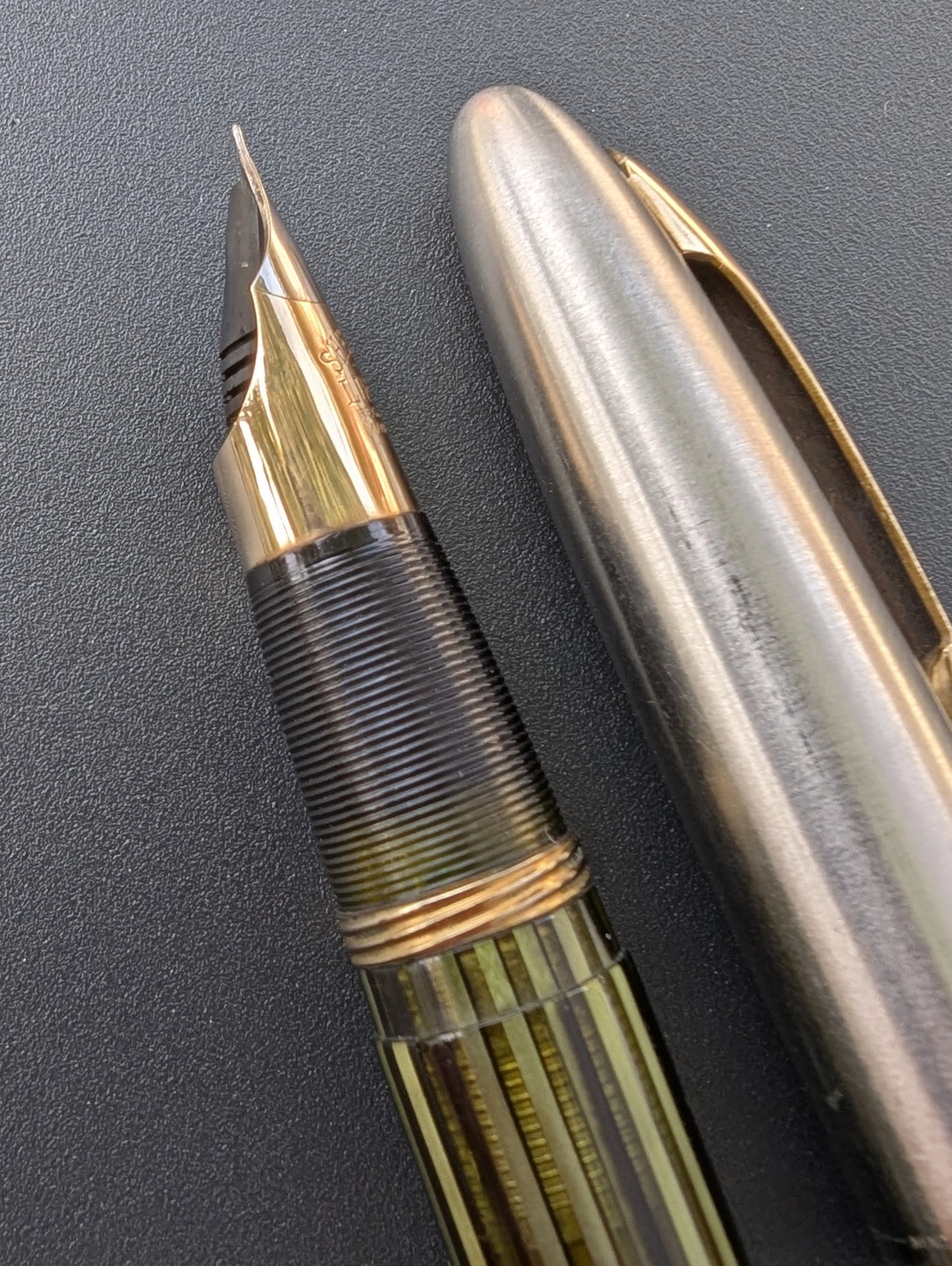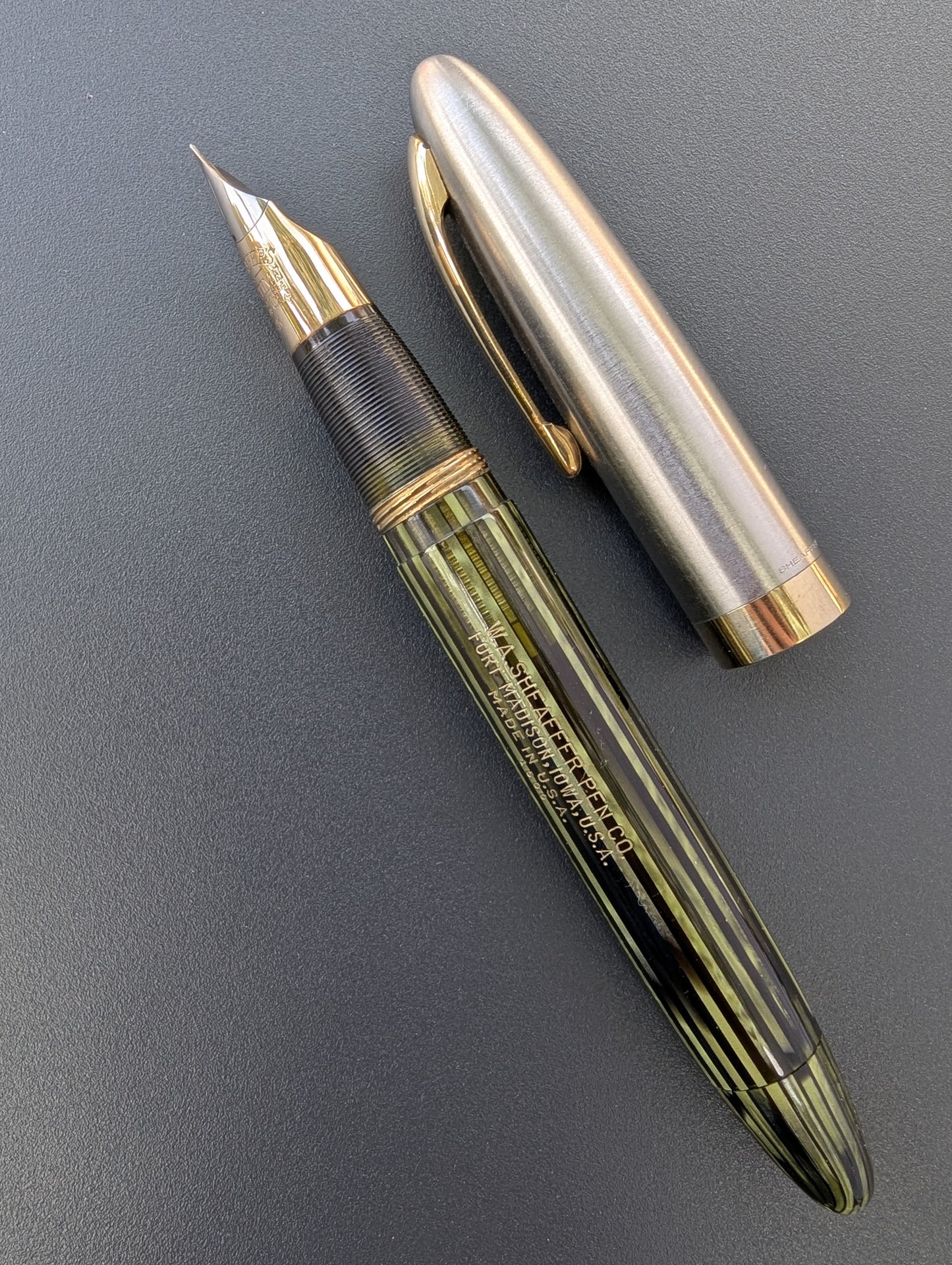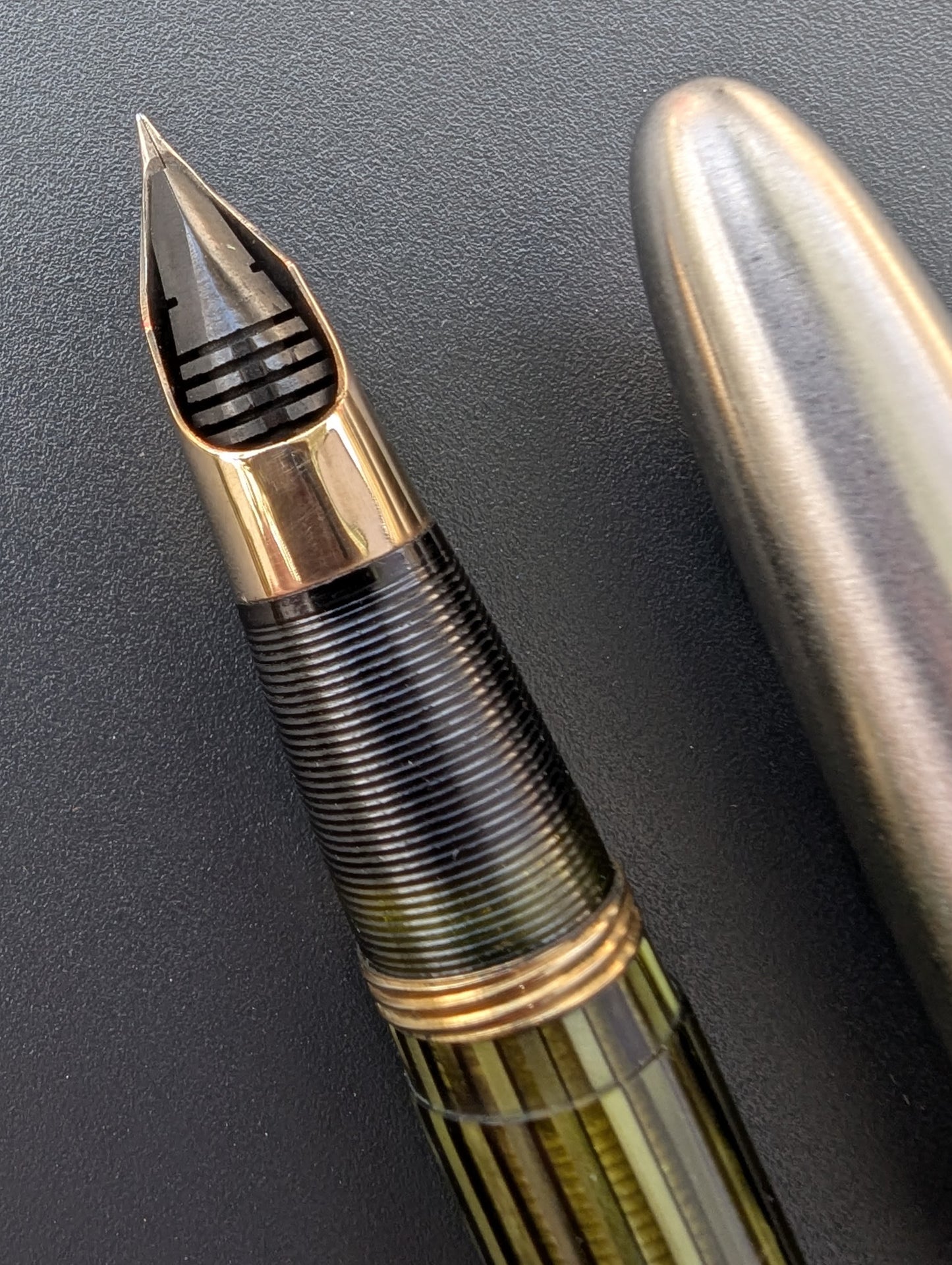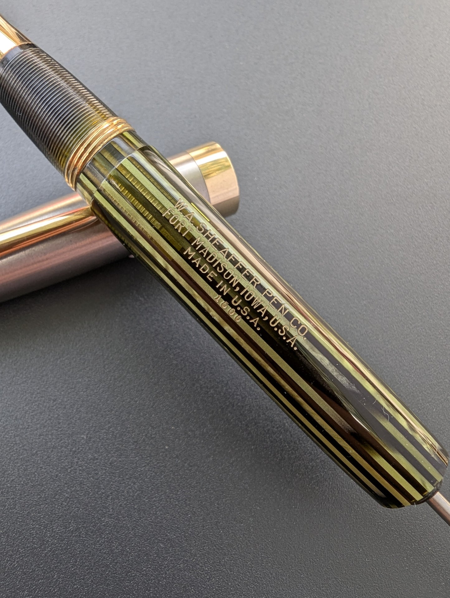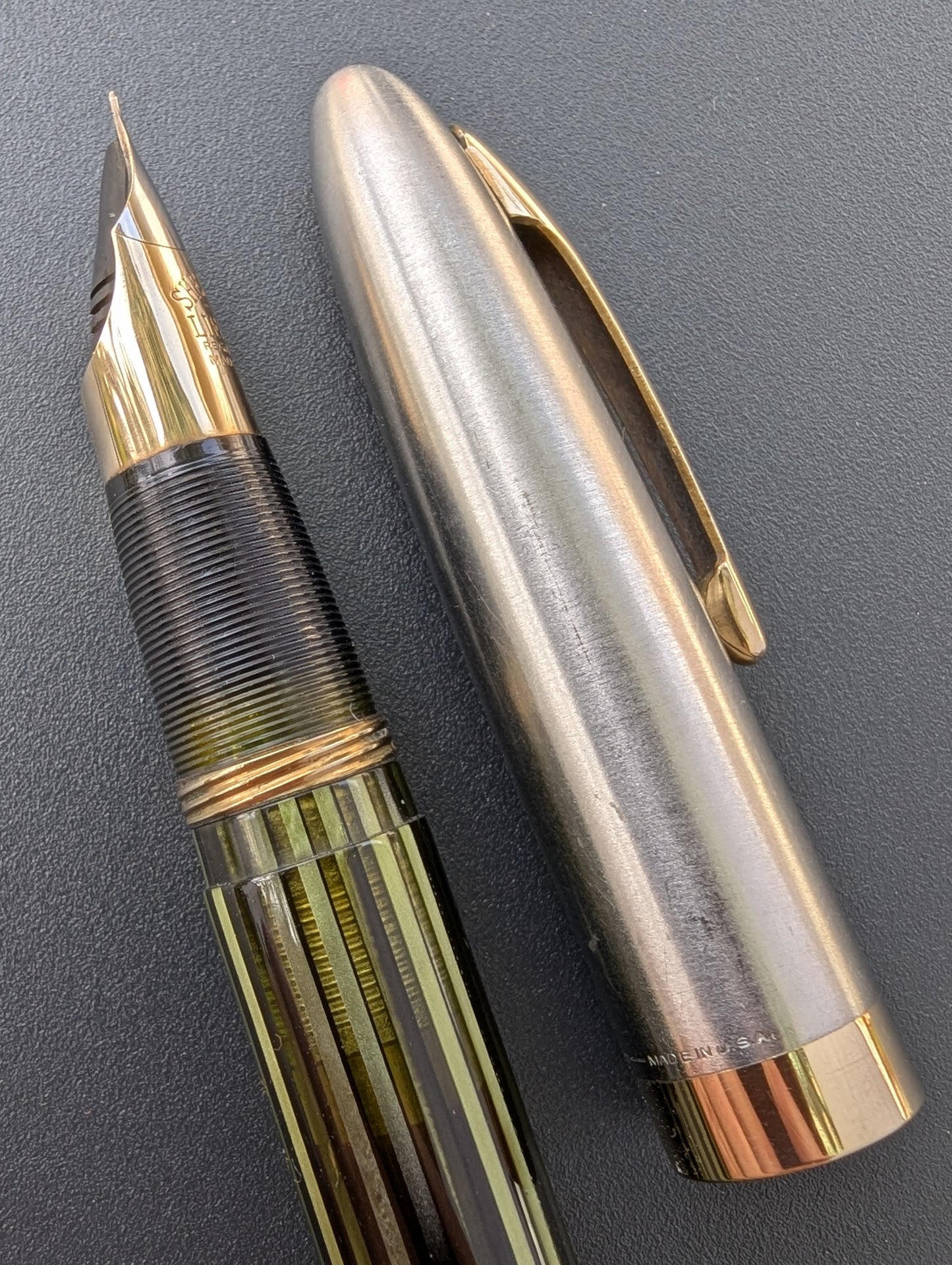 These steel caps are difficult to find without dents in the peak. Or, without any dents at all. This cap is perfect. The entire pen is in amazing condition. The clip is tight, straight and has an excellent spring. The ink view grip section still has the original pale green hue and amazing transparency. I believe this is an early production model because the 1/2 inch (12.7 mm) of the barrel binde nearest the grip section is transparent, allowing even better viewing of the ink level. Later pens of this generation have fully opaque barrel bindes. The green striped celluloid is unblemished and is polished to be like new.