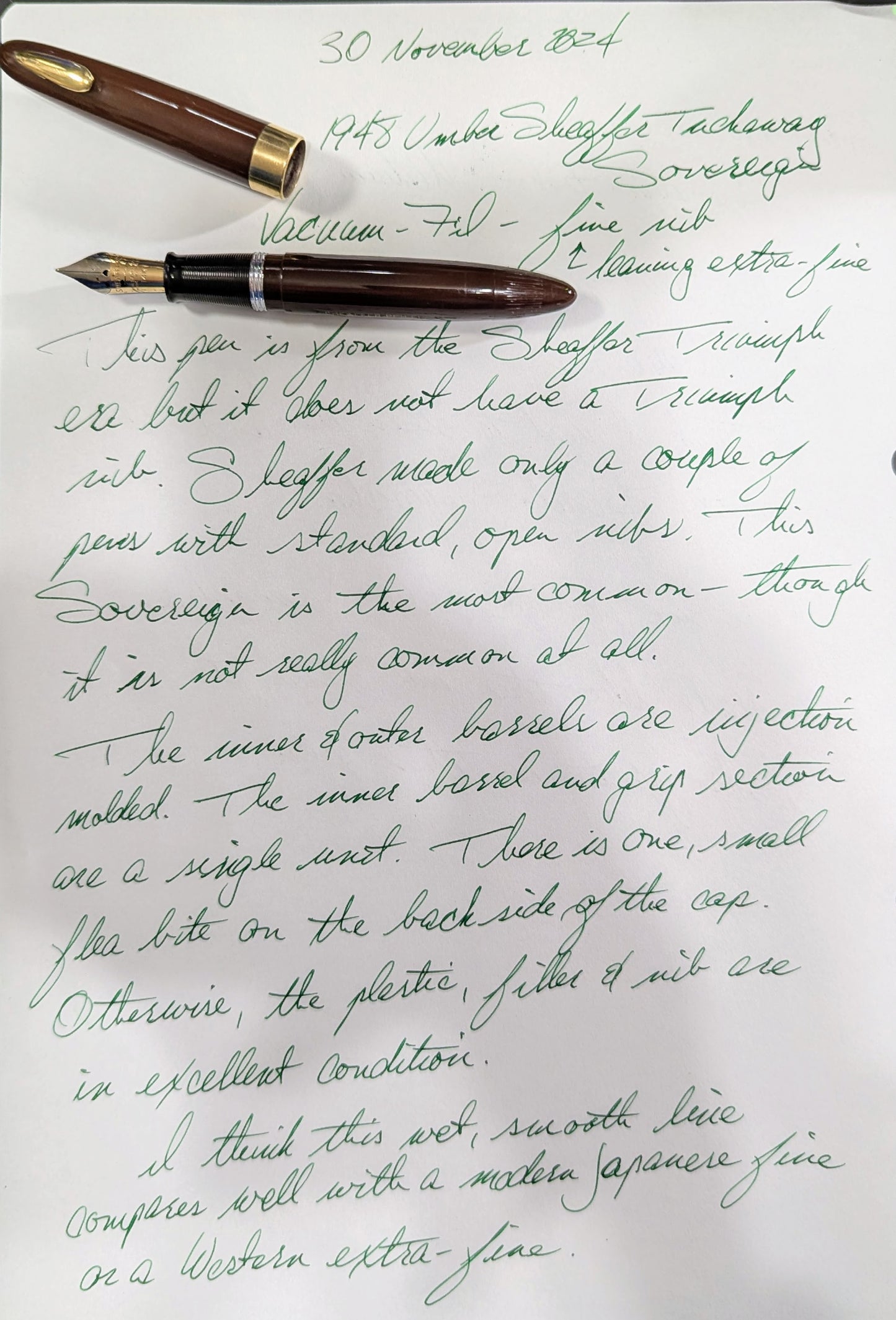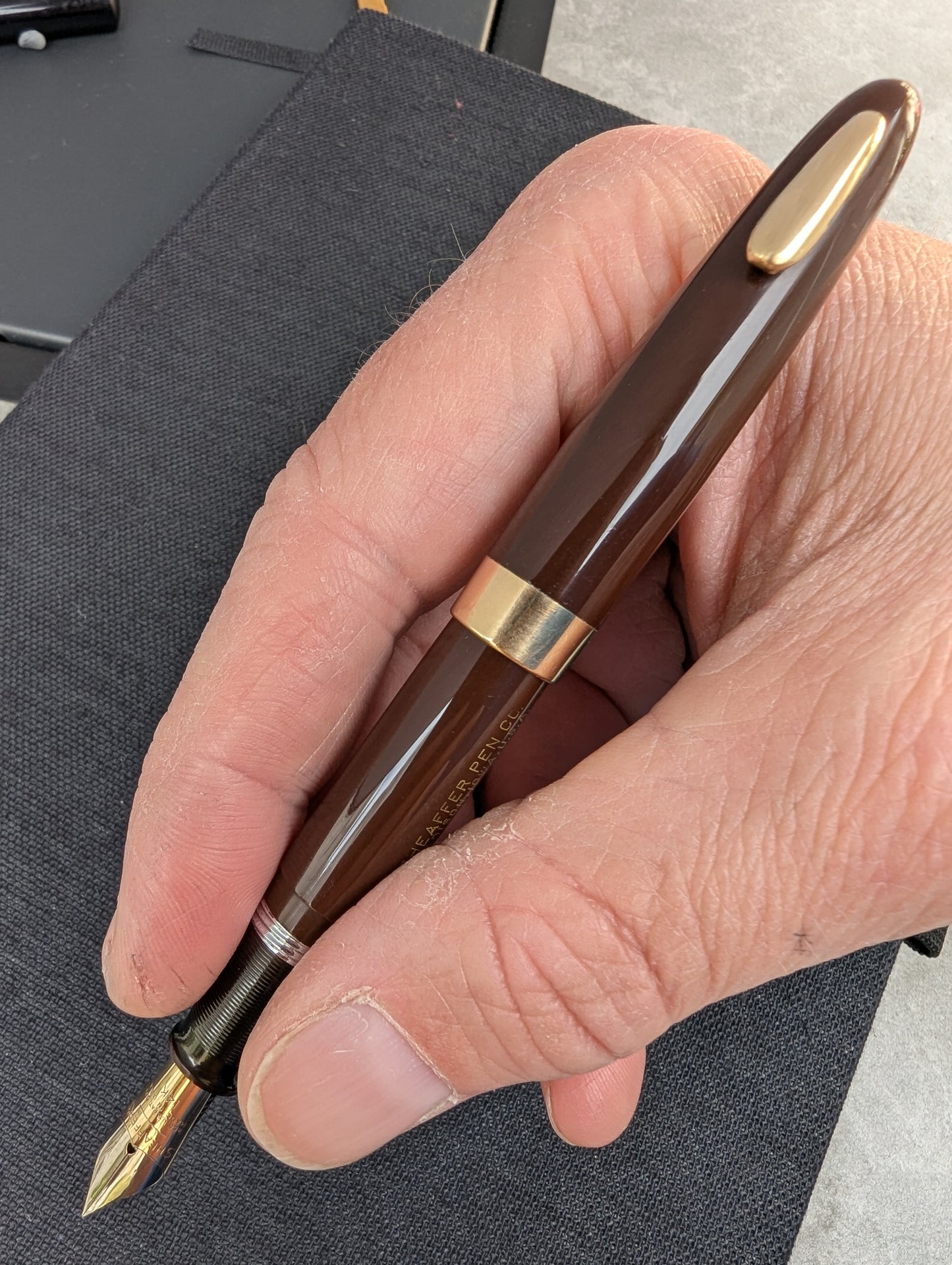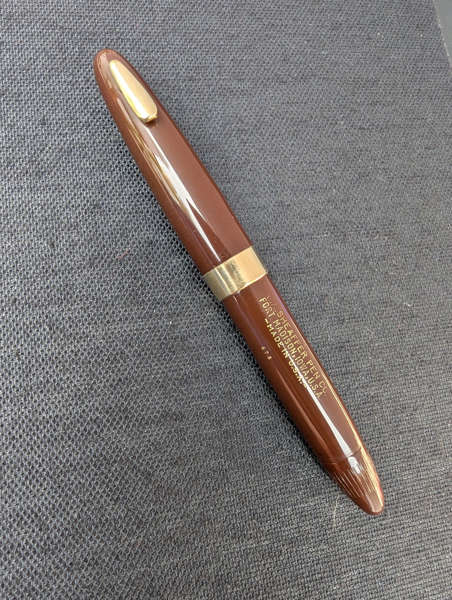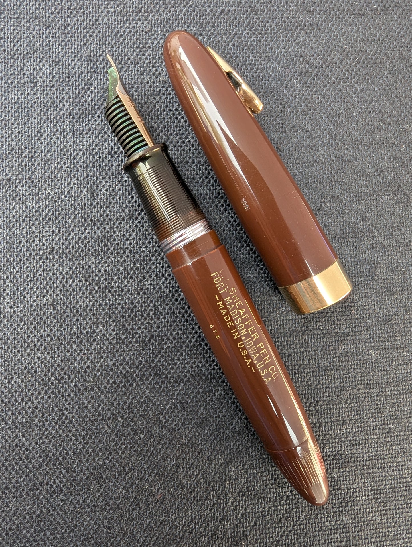 En 1948, Sheaffer a arrêté d'utiliser le celluloïd. Cela me rend un peu triste. Cependant, les plastiques moulés par injection vers lesquels ils se sont tournés avaient des couleurs intéressantes. J'aime les stylos Sheaffer umber. C'est une couleur profonde et riche que je trouve agréable. Les stylos de cette couleur semblent être moins courants que le noir typique.