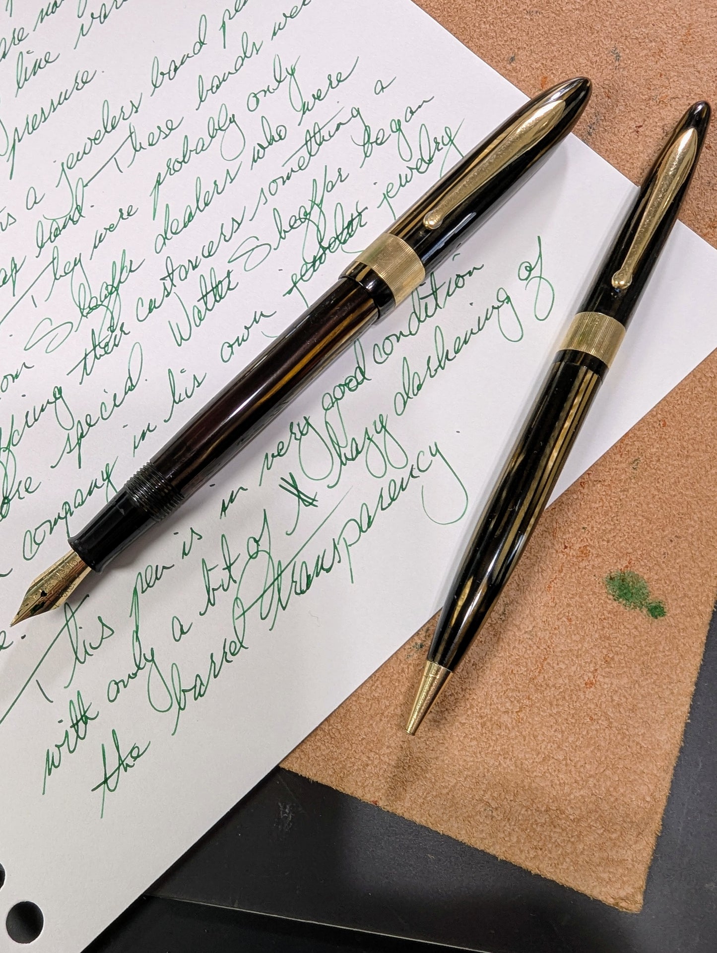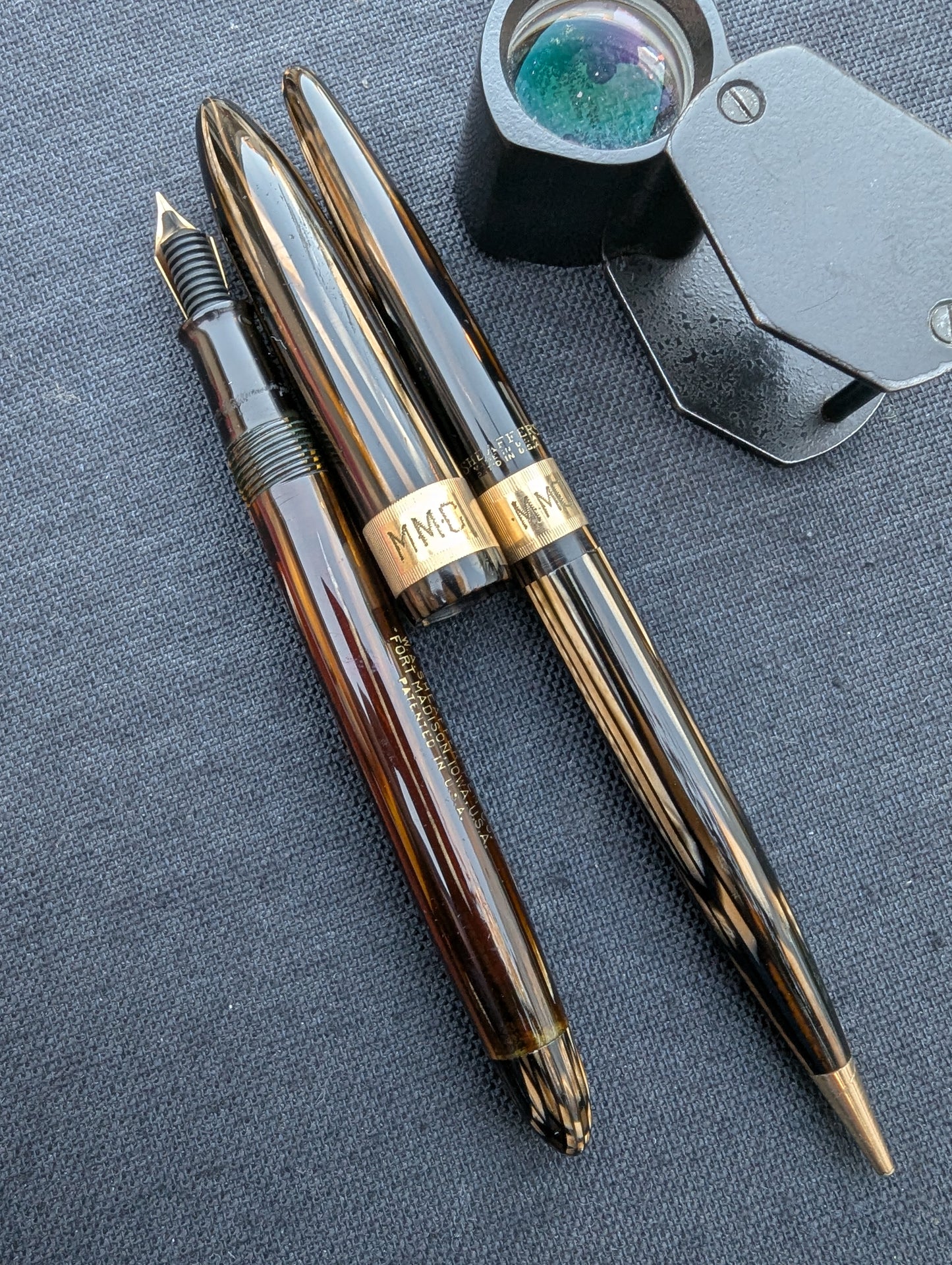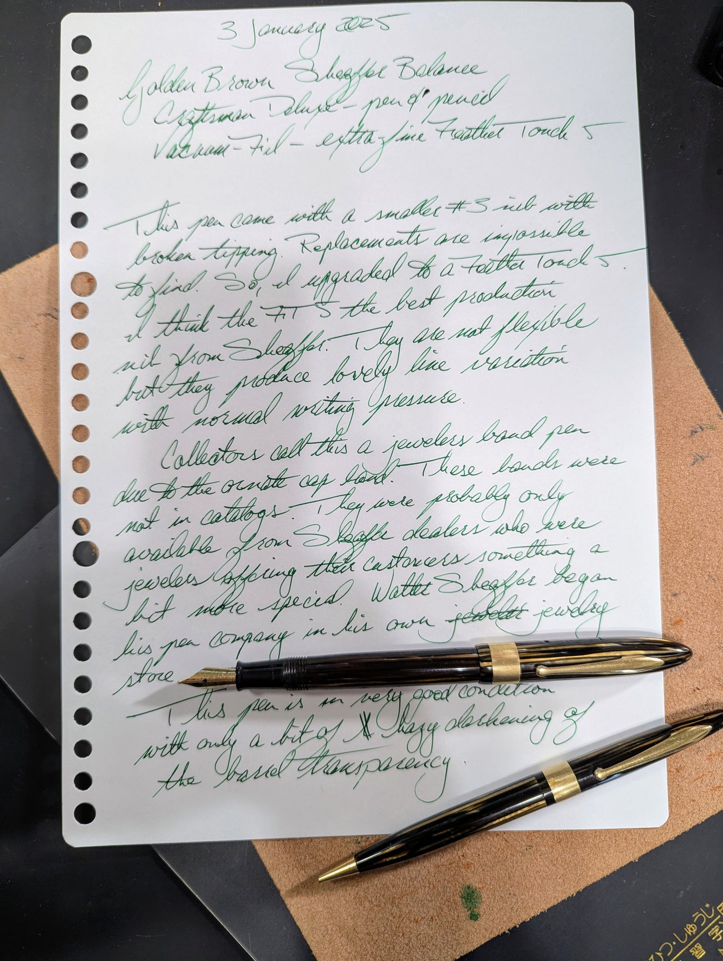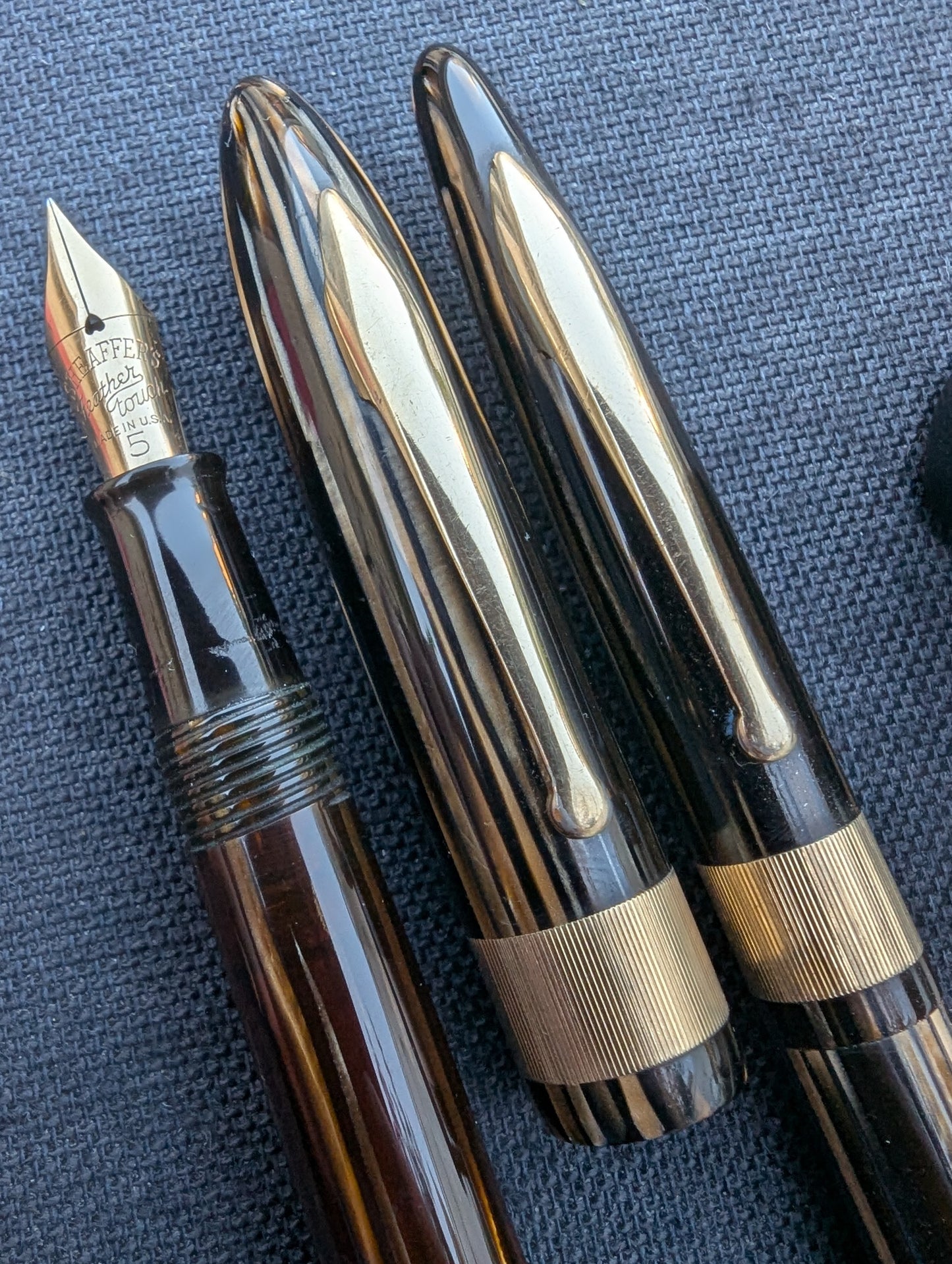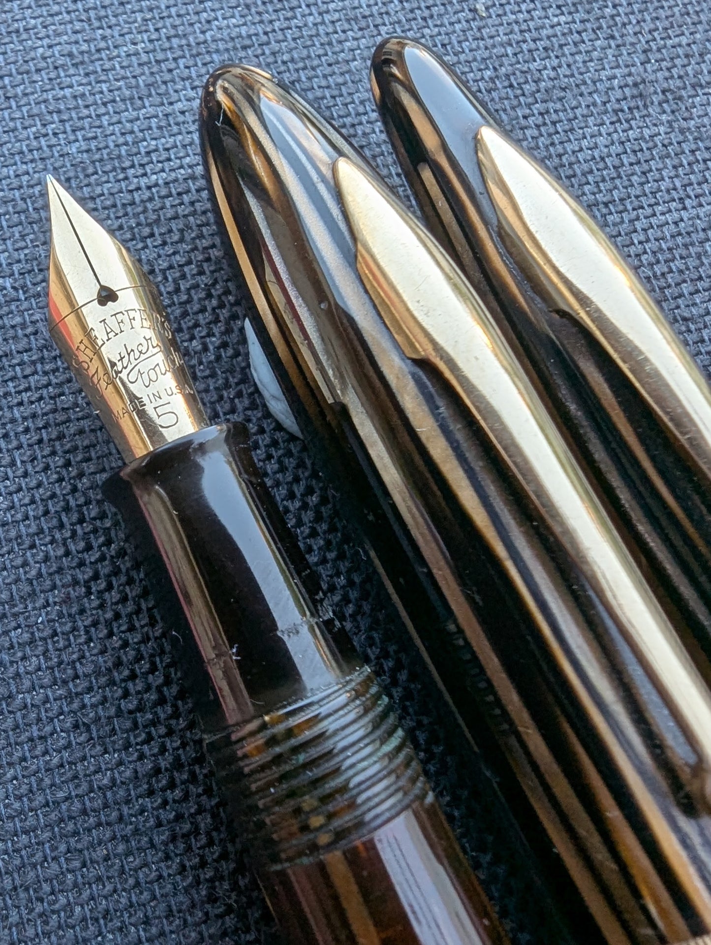 J'appelle ce stylo un Craftsman « Deluxe » pour deux raisons. Tout d'abord, la bande « bijoutier » fraisée est une caractéristique que l'on ne trouve pas dans les catalogues Sheaffer. Celui-ci est gravé avec MMC. La tradition des collectionneurs dit que les stylos avec des bandes fantaisie comme celles-ci étaient vendus exclusivement par les revendeurs Sheaffer qui étaient des bijoutiers. Un petit quelque chose de spécial pour les frères bijoutiers de Walter Sheaffer - il a commencé à vendre ses stylos dans sa propre bijouterie. Deuxièmement, j'ai mis à niveau la plume n°3 cassée avec une Feather Touch 5. Je pense que la Feather Touch 5 est l'une des meilleures plumes jamais produites. Elles ne sont pas flexibles mais elles sont douces et rebondissantes et produisent de belles variations de lignes sous une pression d'écriture normale.