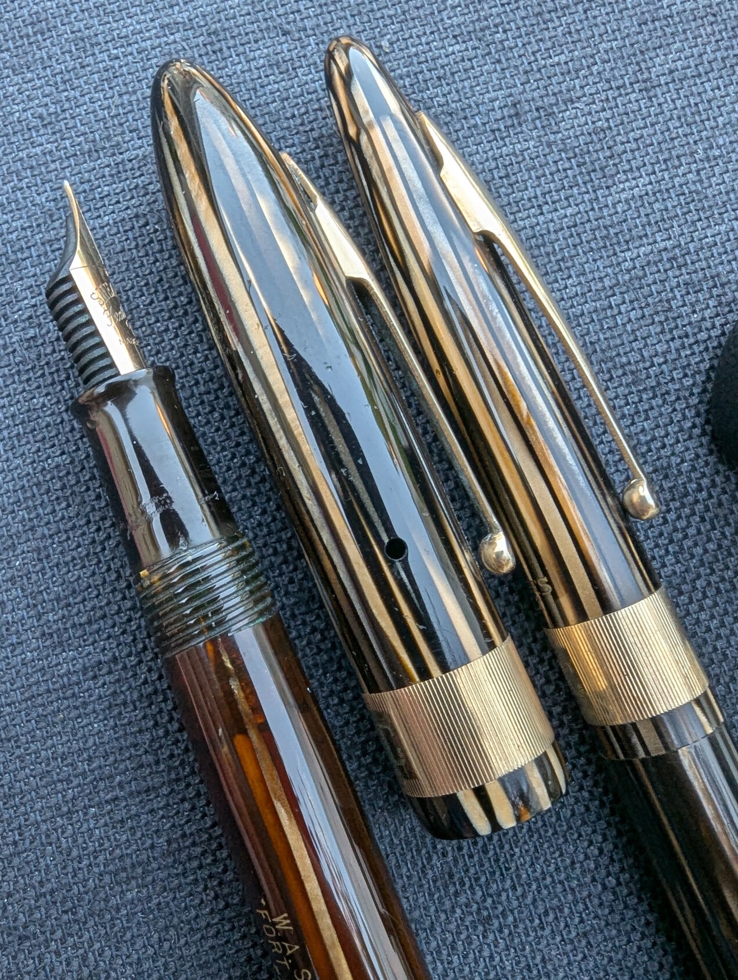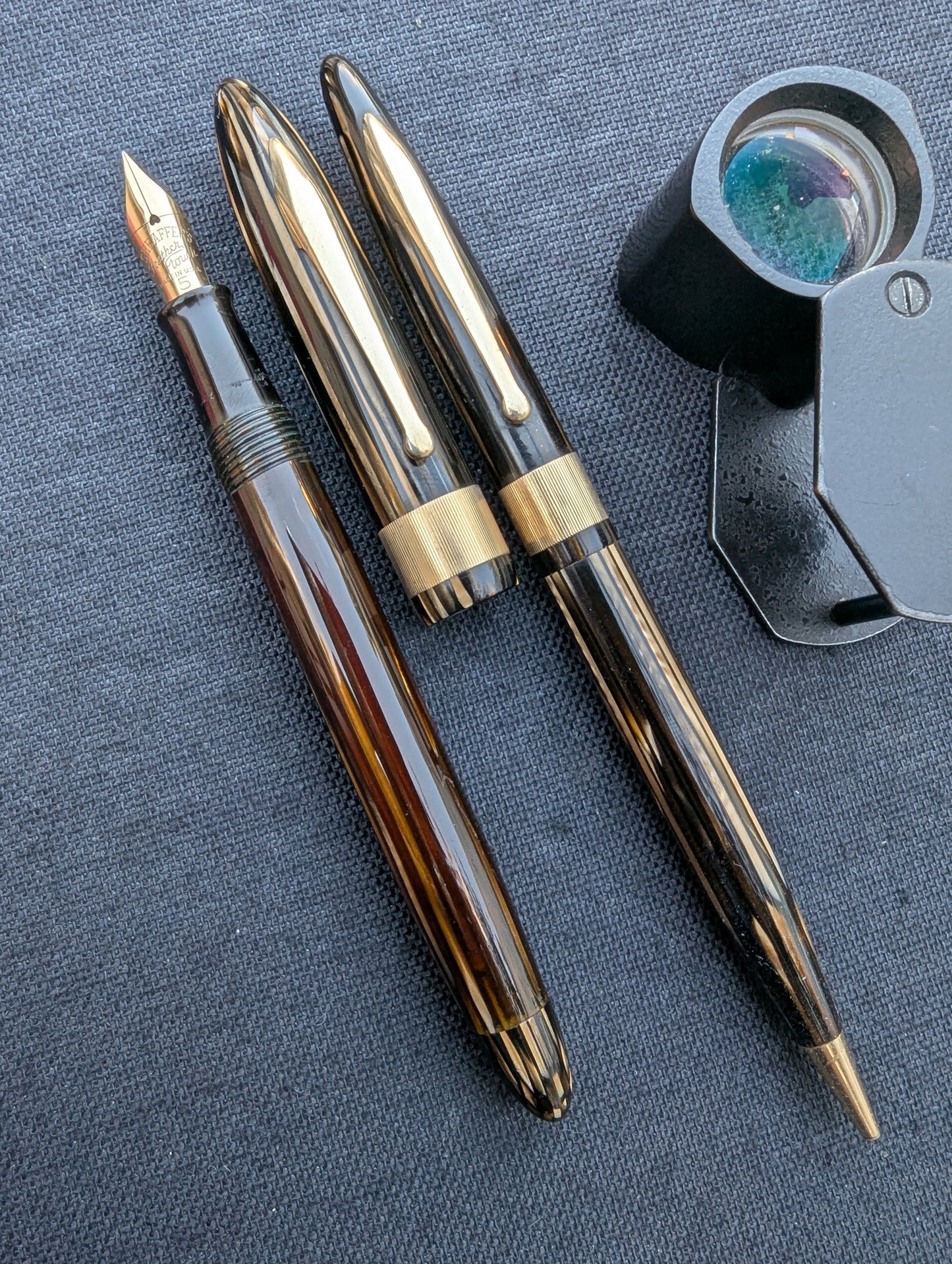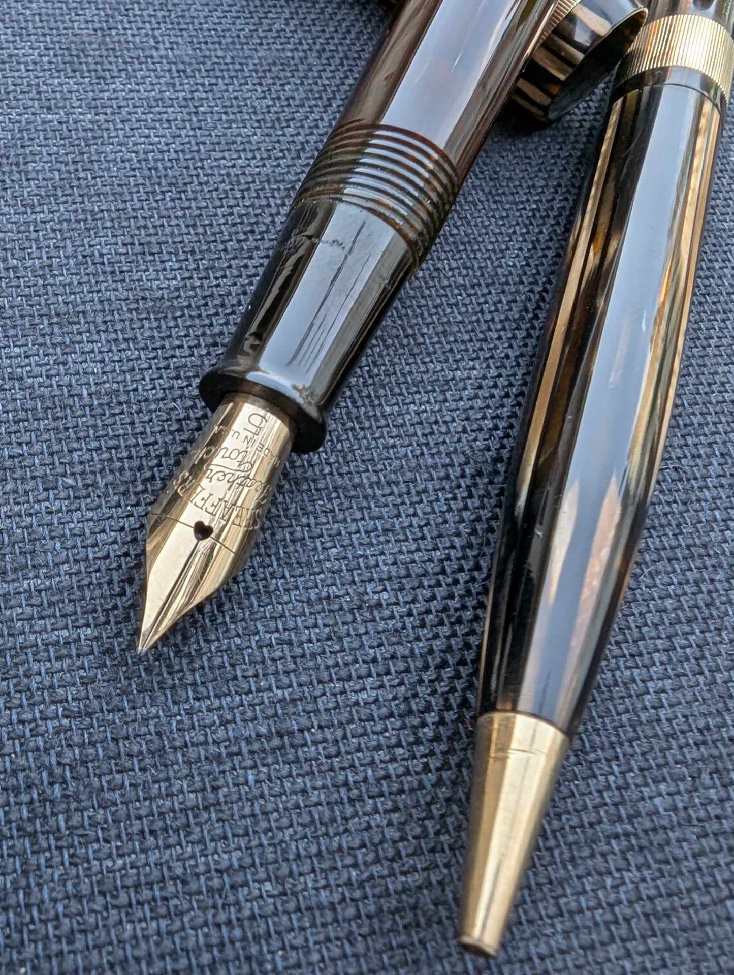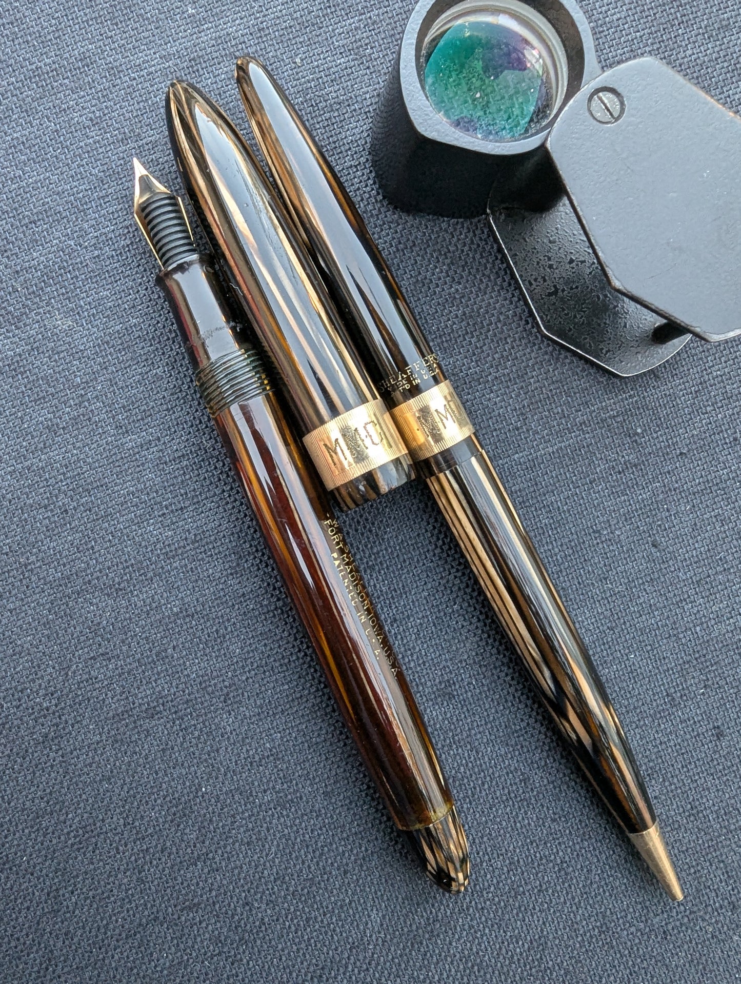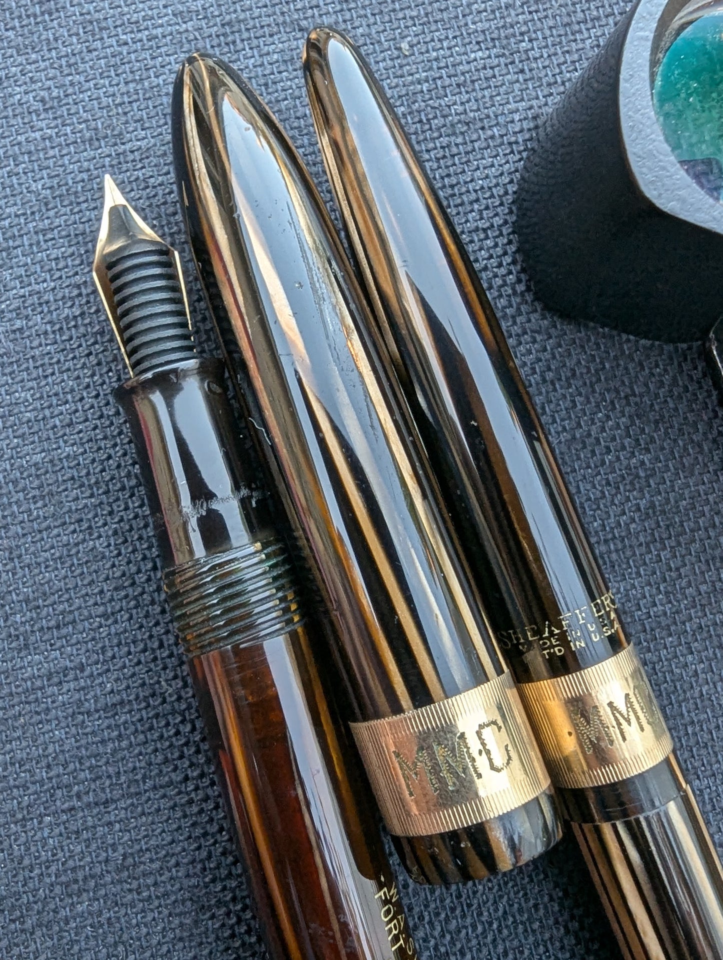 J'appelle ce stylo un Craftsman « Deluxe » pour deux raisons. Tout d'abord, la bande « bijoutier » fraisée est une caractéristique que l'on ne trouve pas dans les catalogues Sheaffer. Celui-ci est gravé avec MMC. La tradition des collectionneurs dit que les stylos avec des bandes fantaisie comme celles-ci étaient vendus exclusivement par les revendeurs Sheaffer qui étaient des bijoutiers. Un petit quelque chose de spécial pour les frères bijoutiers de Walter Sheaffer - il a commencé à vendre ses stylos dans sa propre bijouterie. Deuxièmement, j'ai mis à niveau la plume n°3 cassée avec une Feather Touch 5. Je pense que la Feather Touch 5 est l'une des meilleures plumes jamais produites. Elles ne sont pas flexibles mais elles sont douces et rebondissantes et produisent de belles variations de lignes sous une pression d'écriture normale.