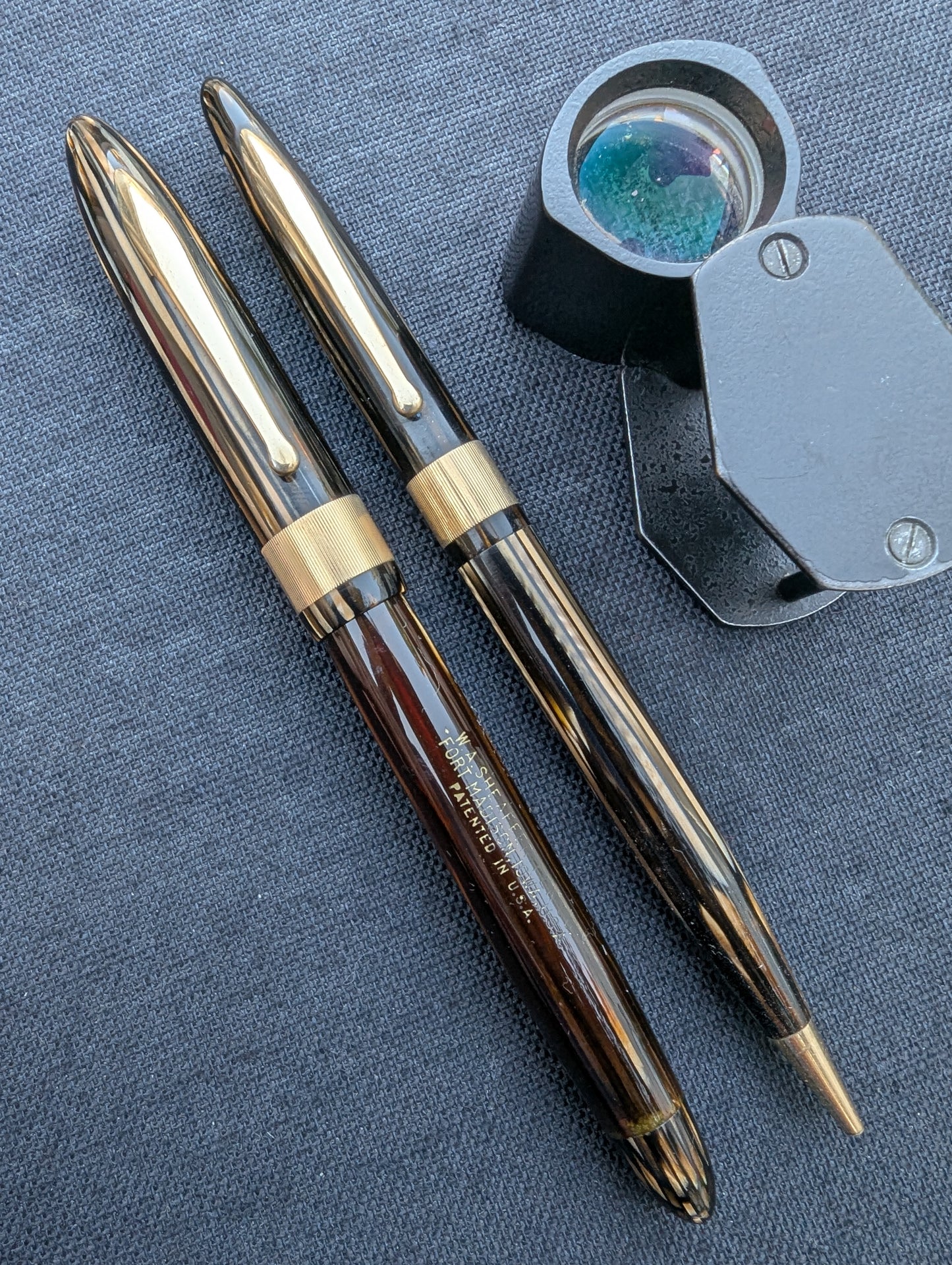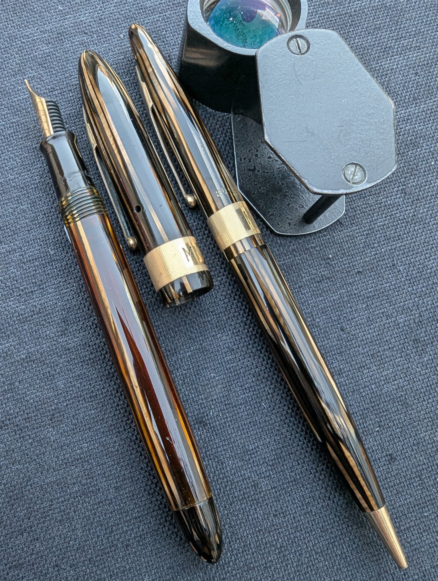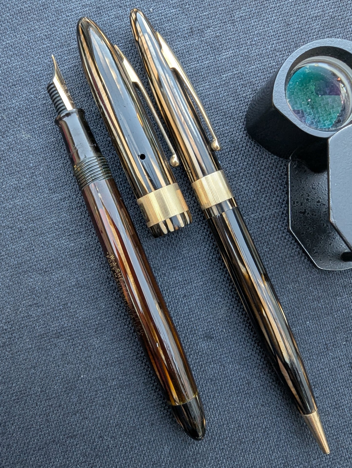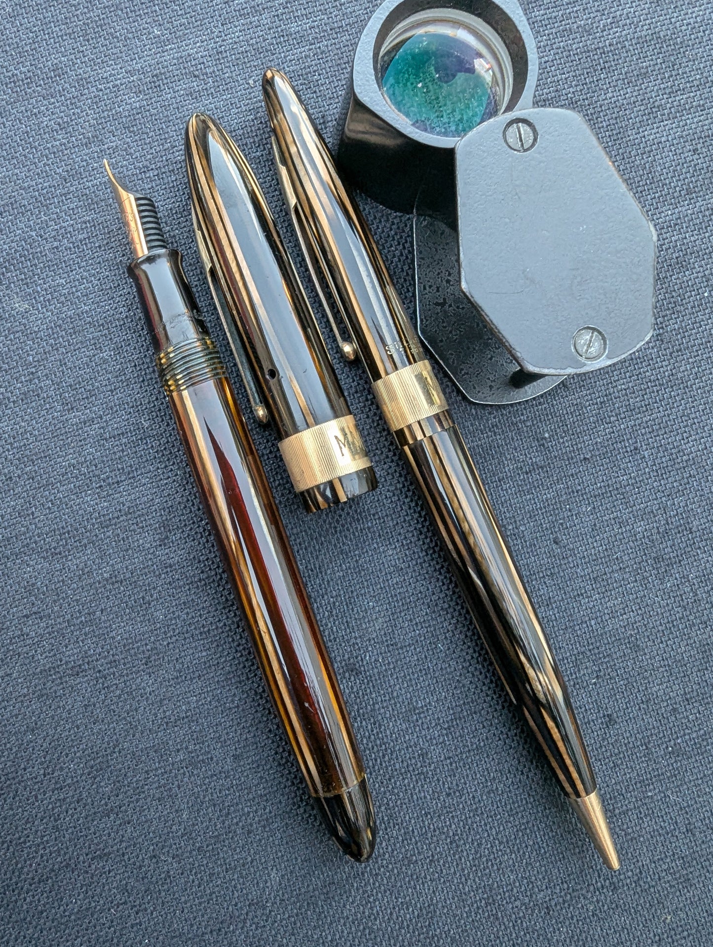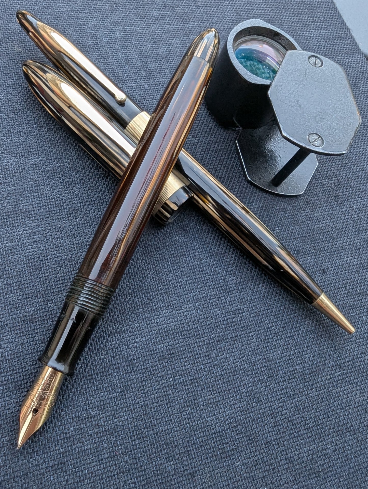 J'appelle ce stylo un Craftsman « Deluxe » pour deux raisons. Tout d'abord, la bande « bijoutier » fraisée est une caractéristique que l'on ne trouve pas dans les catalogues Sheaffer. Celui-ci est gravé avec MMC. La tradition des collectionneurs dit que les stylos avec des bandes fantaisie comme celles-ci étaient vendus exclusivement par les revendeurs Sheaffer qui étaient des bijoutiers. Un petit quelque chose de spécial pour les frères bijoutiers de Walter Sheaffer - il a commencé à vendre ses stylos dans sa propre bijouterie. Deuxièmement, j'ai mis à niveau la plume n°3 cassée avec une Feather Touch 5. Je pense que la Feather Touch 5 est l'une des meilleures plumes jamais produites. Elles ne sont pas flexibles mais elles sont douces et rebondissantes et produisent de belles variations de lignes sous une pression d'écriture normale.
