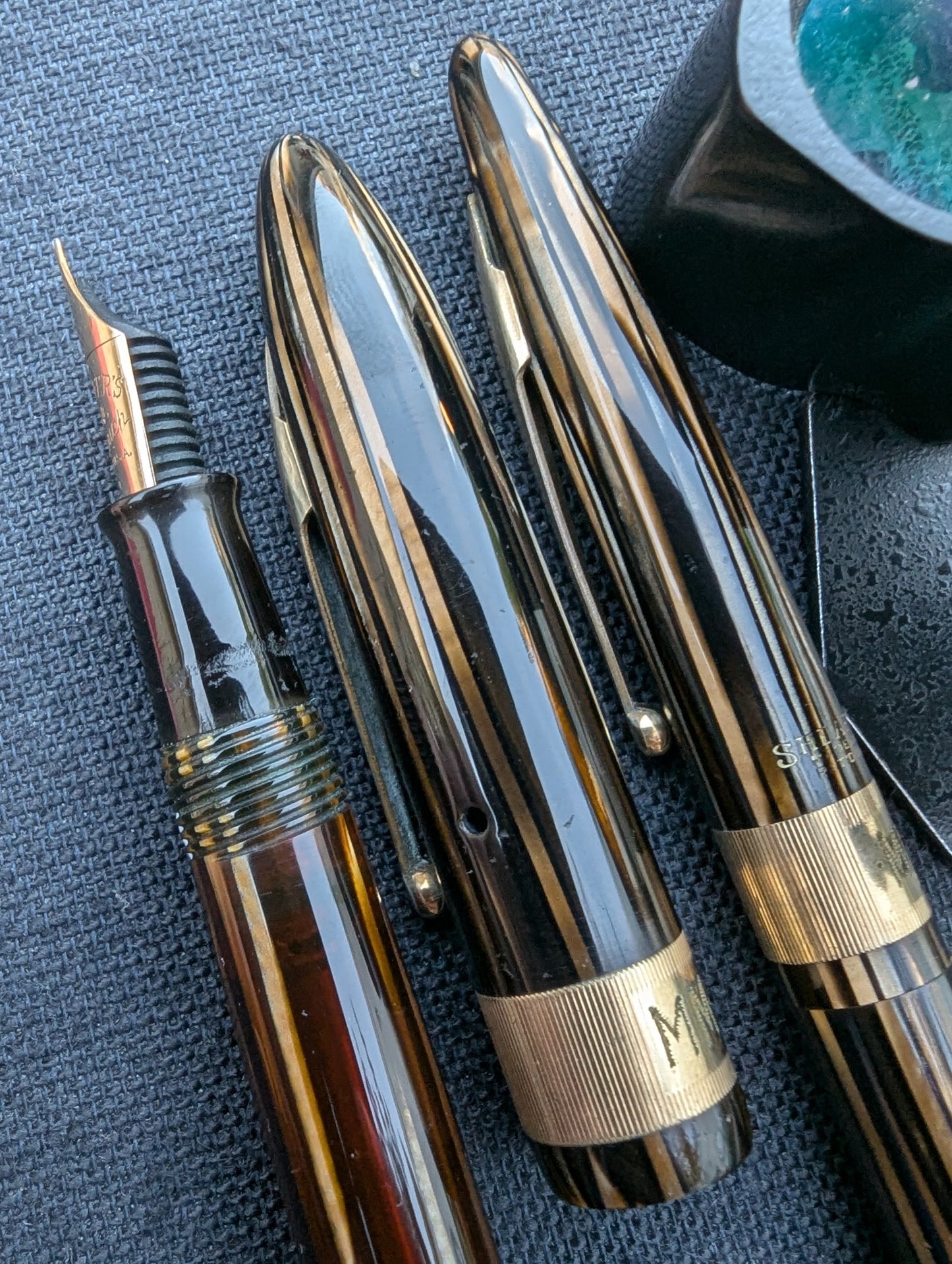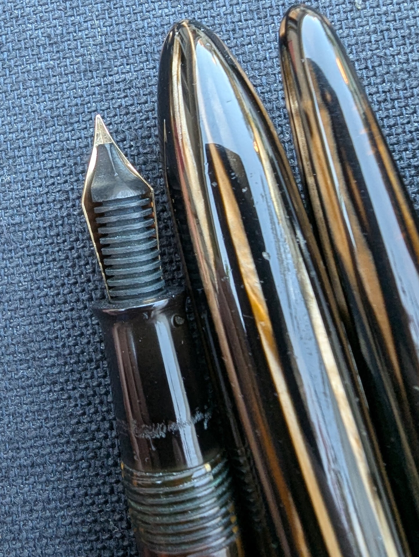 Le celluloïd n'est marqué par aucune fissure ou défaut. La transparence s'est assombrie et rougie, bien que le niveau d'encre soit facilement visible lorsqu'il est tenu devant une lumière. Quelqu'un a essayé de retirer la partie de préhension en ébonite avec une pince, laissant une cicatrice annulaire. J'ai lissé la cicatrice pour qu'elle ne soit pas palpable malgré son aspect peu attrayant. Les extrémités du clip ont un peu de placage usé. Le crayon fonctionne parfaitement mais n'a ni graphite ni gomme.