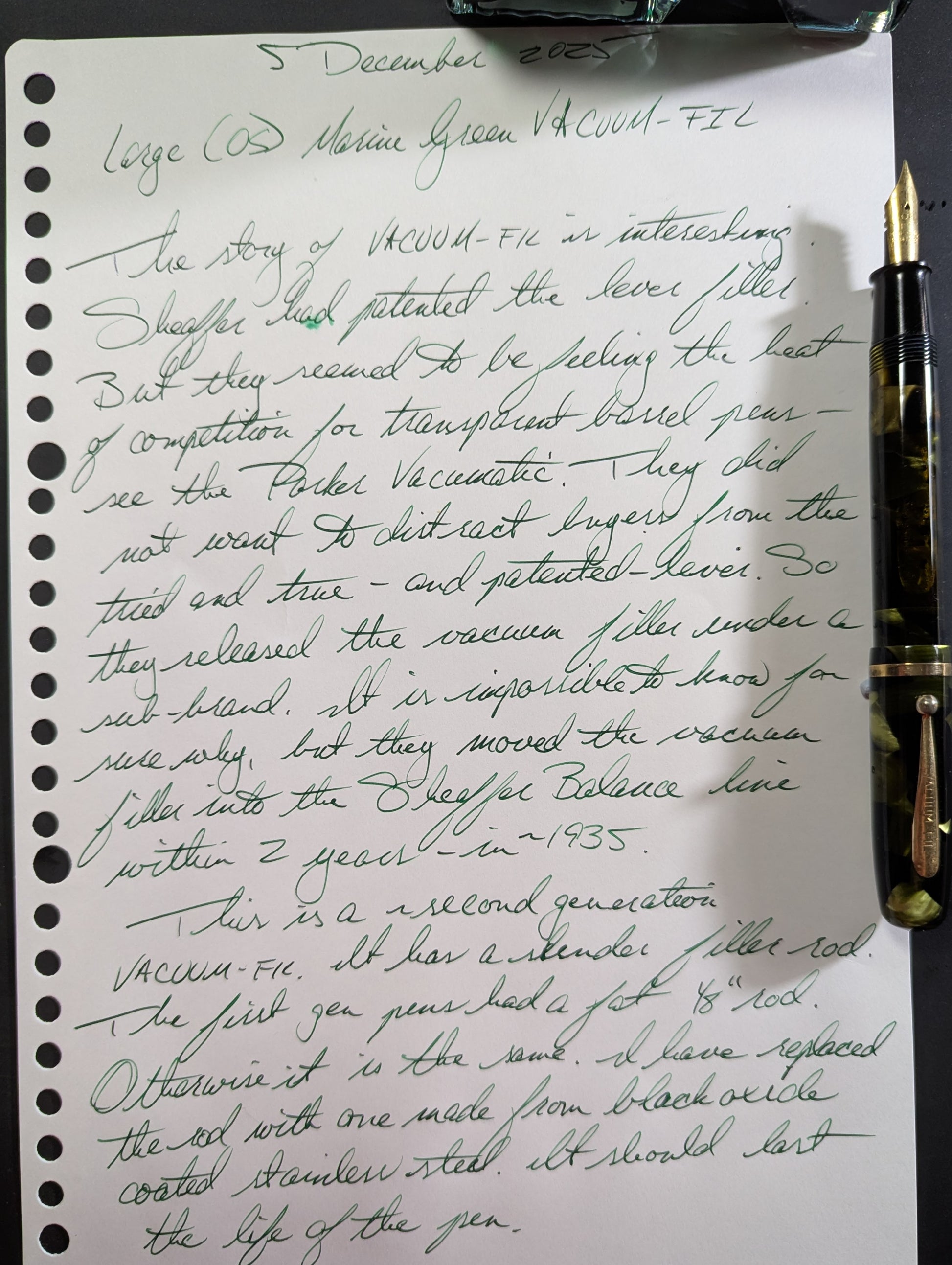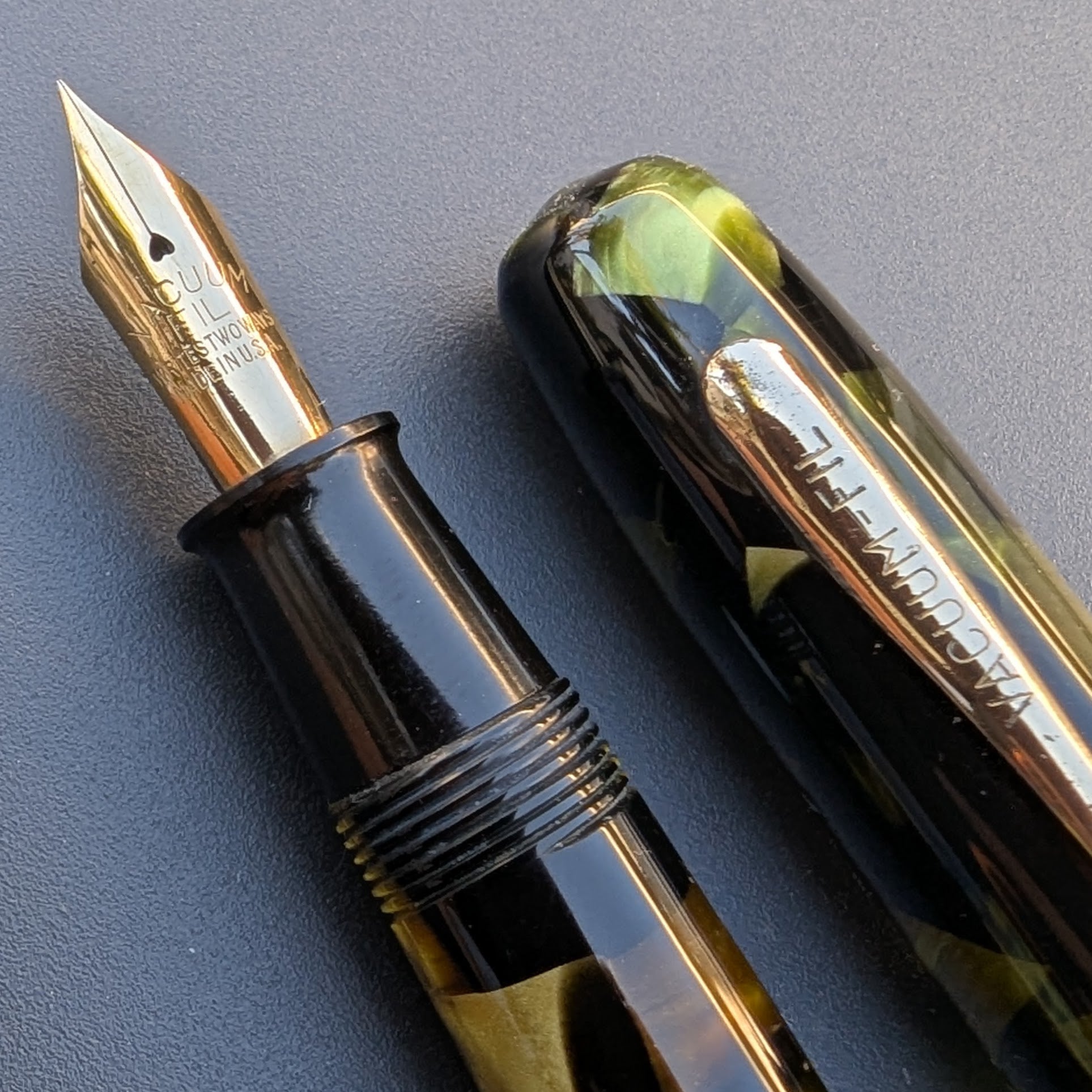 This is the largest VACUUM-FIL / WASP pen made; collectors call it OS or Oversize. This is probably a second generation pen. The first generation pens have fat, 1/8" (3.175 mm) filler rods. The second generation pens have the same 5/64" (2.07 mm) rods used on the later Balance pens. I have replace the original rod with a black oxide coated stainless steel rod. The original was celluloid covered carbon steel. Those often fail when moisture gets beneath the cover and the rod rusts. This stainless rod will last the life of the pen.