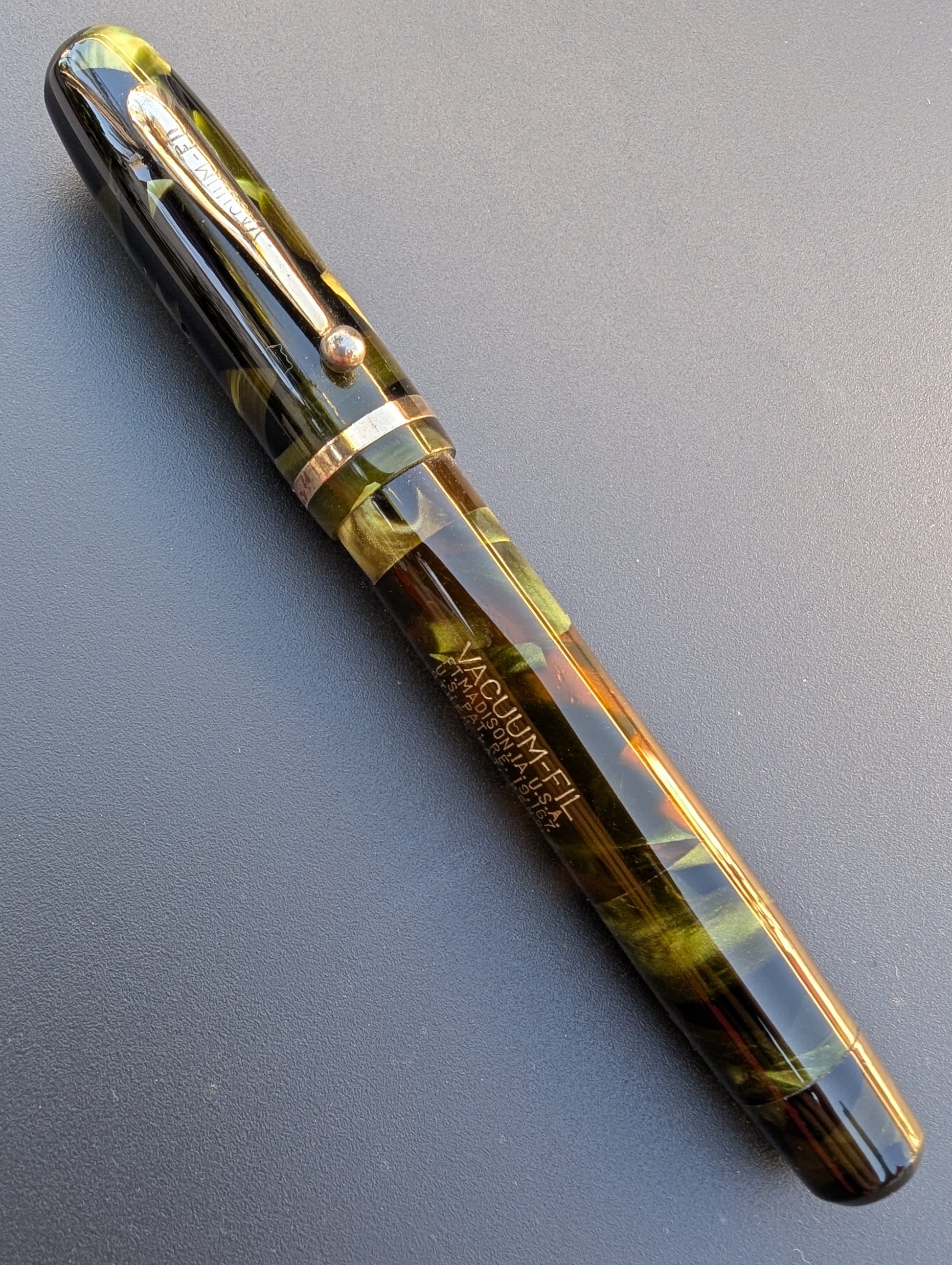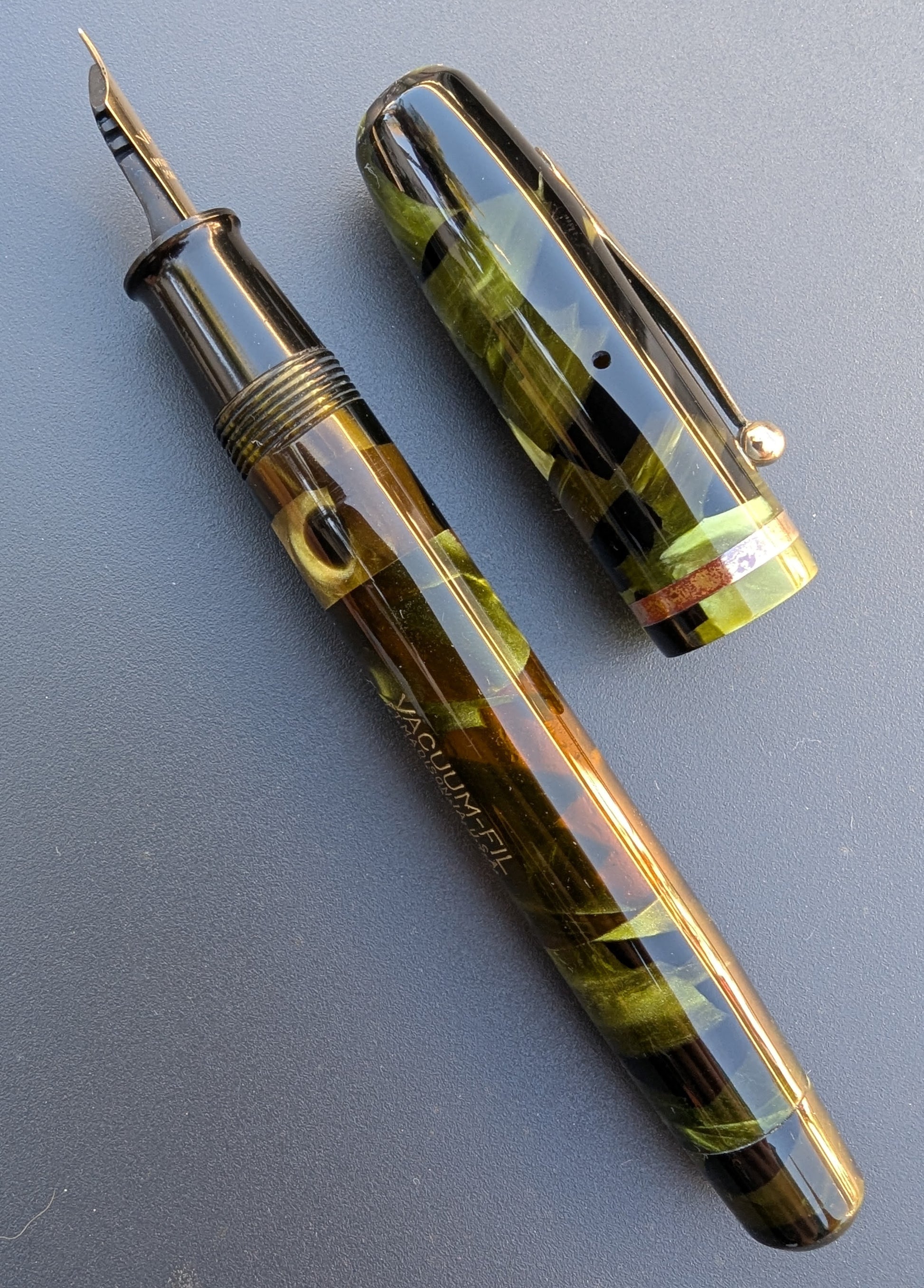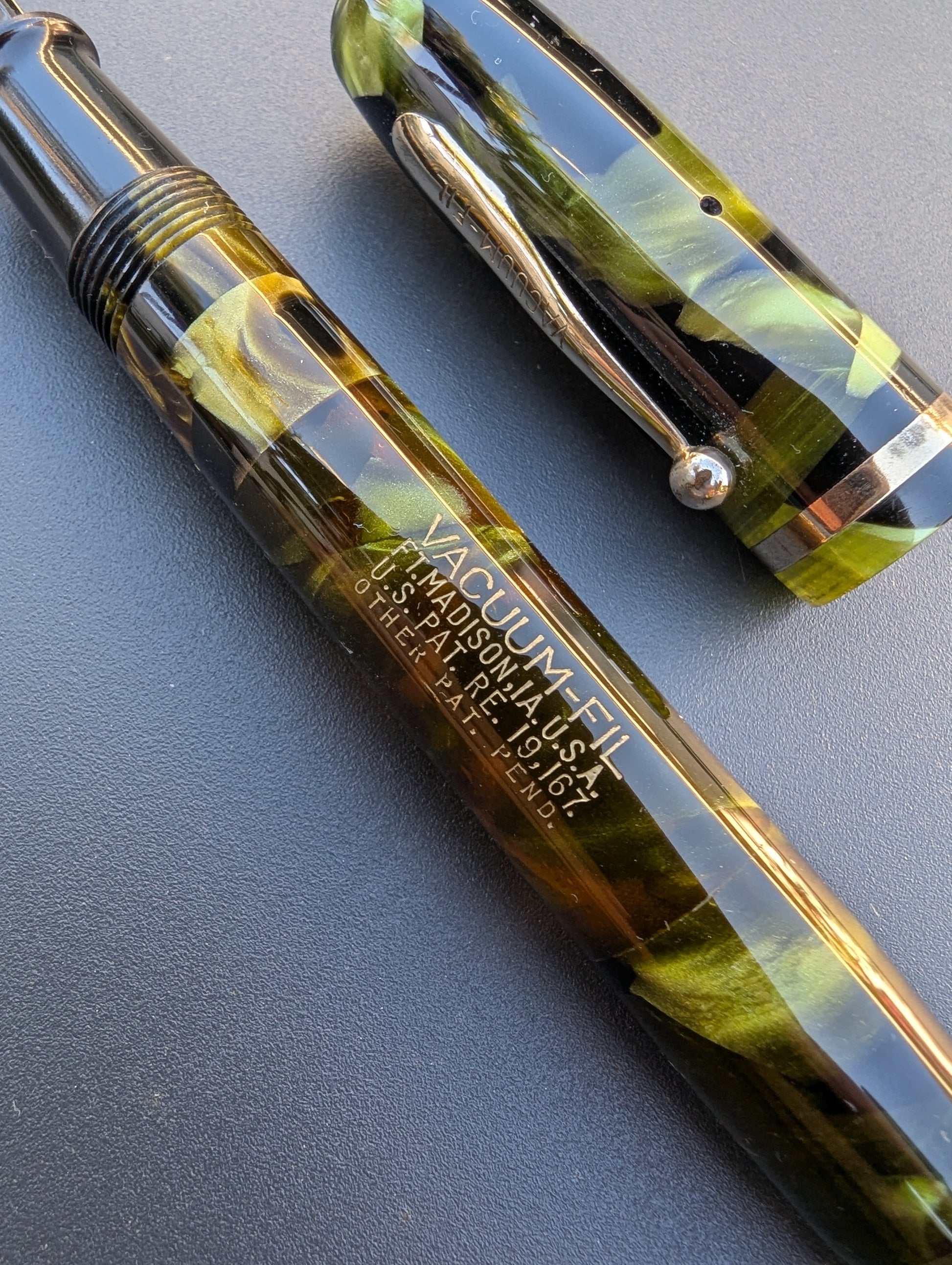 The peak of the clip has some pitting to the plating. The cap band and clip ball have areas of plating loss. The transparent barrel has darkened a bit from its original pale green. The celluloid has no damage at all.