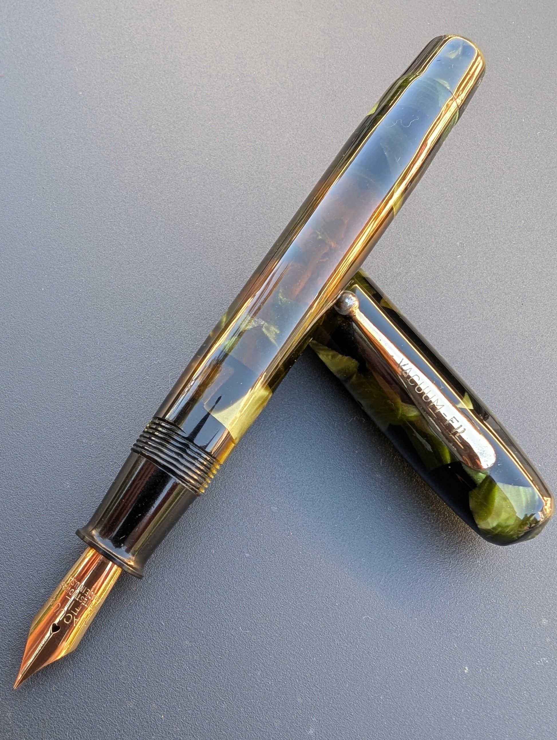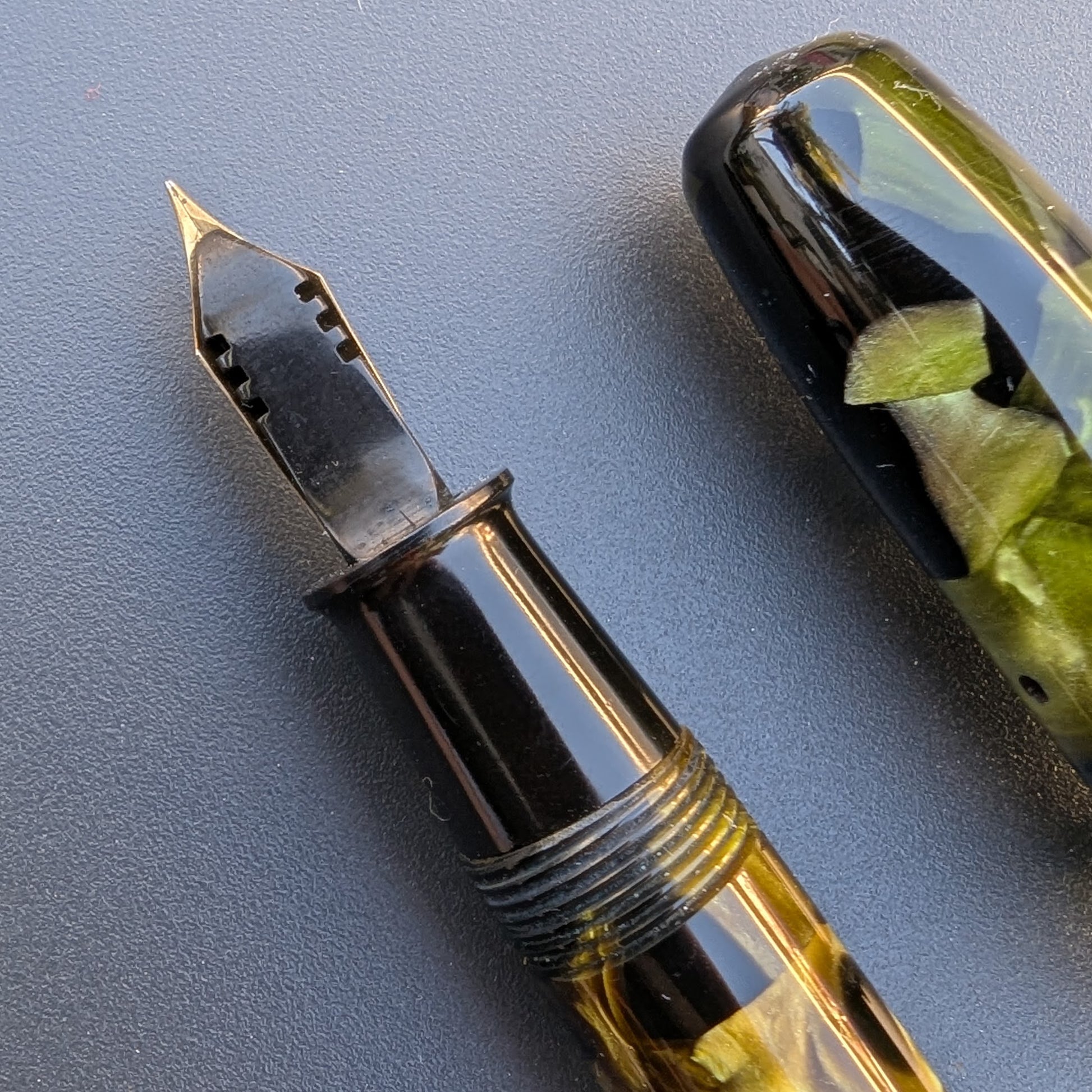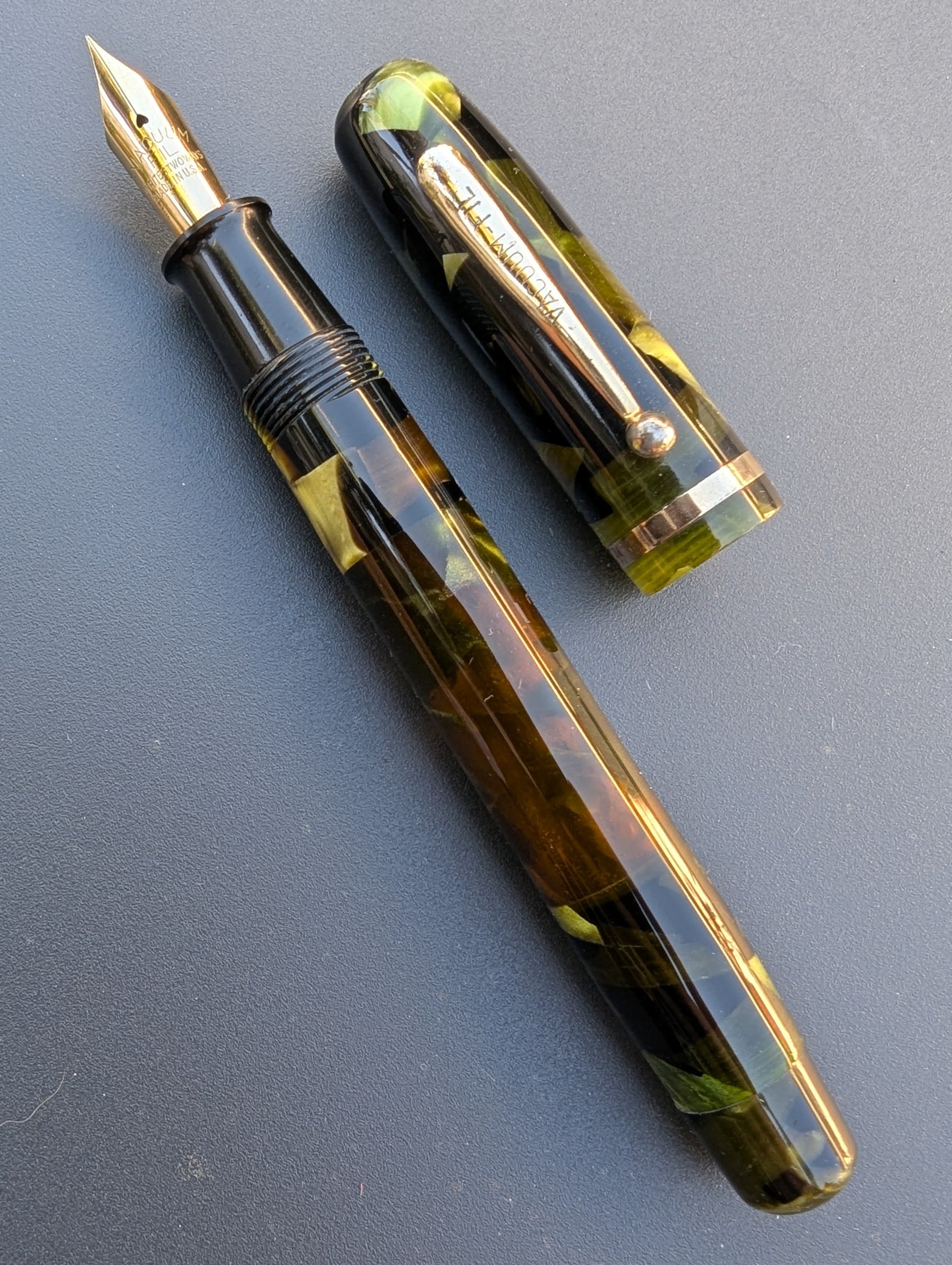 The peak of the clip has some pitting to the plating. The cap band and clip ball have areas of plating loss. The transparent barrel has darkened a bit from its original pale green. The celluloid has no damage at all.