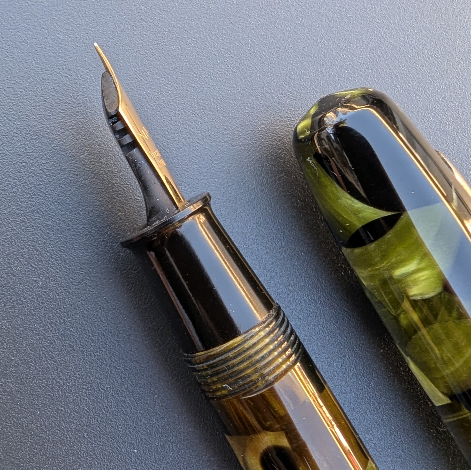 The nib is soft, bouncy, wet and an amazing writer. I hesitate to describe it as semi-flex because these nibs are 12 karat gold and quite thin. They provide lovely line variation under normal writing pressure but should never be pushed like a truly flexible nib.
