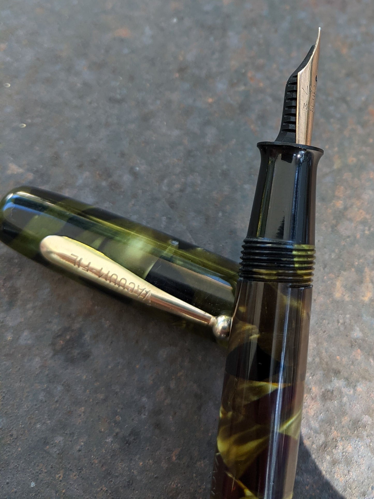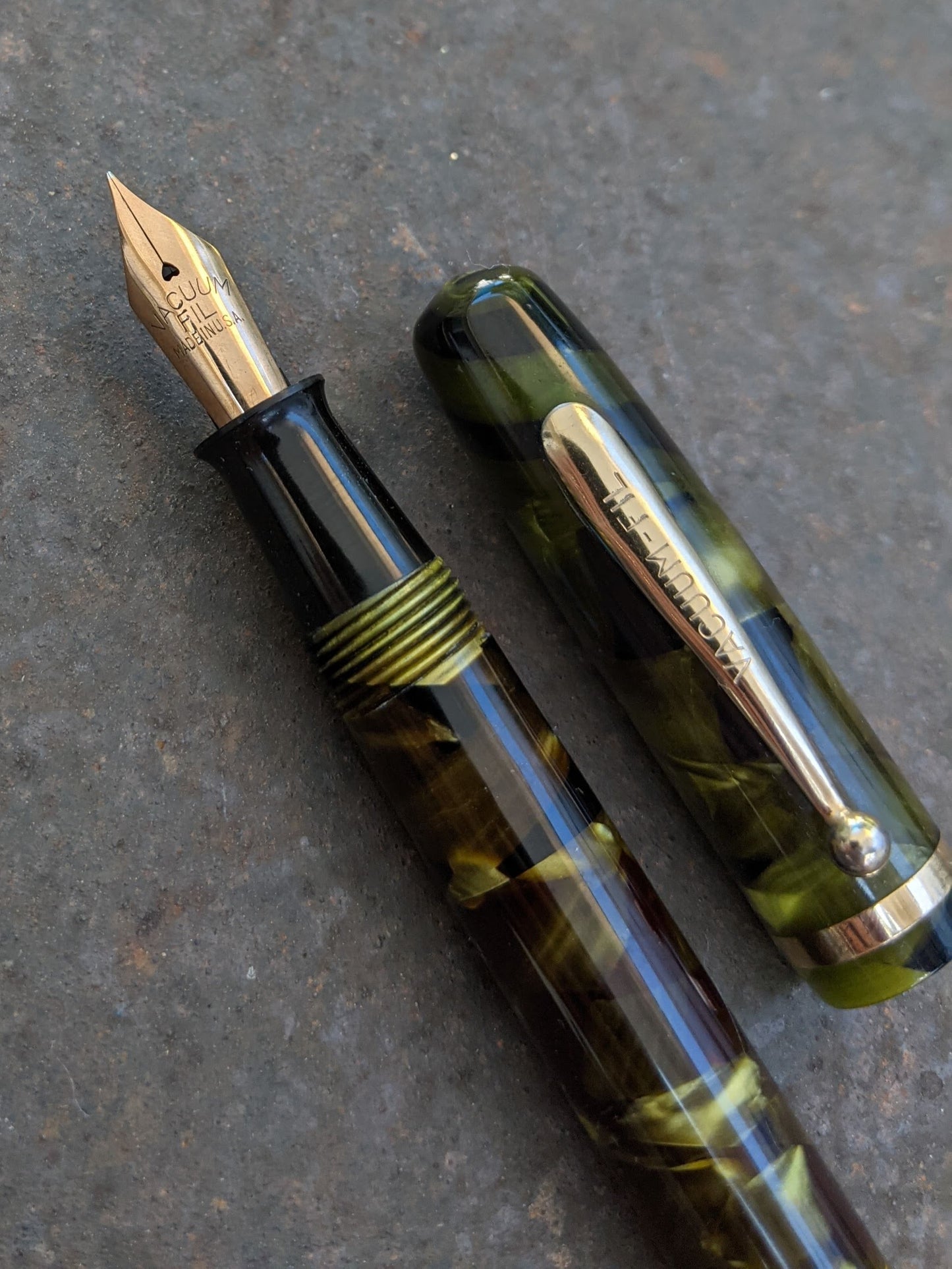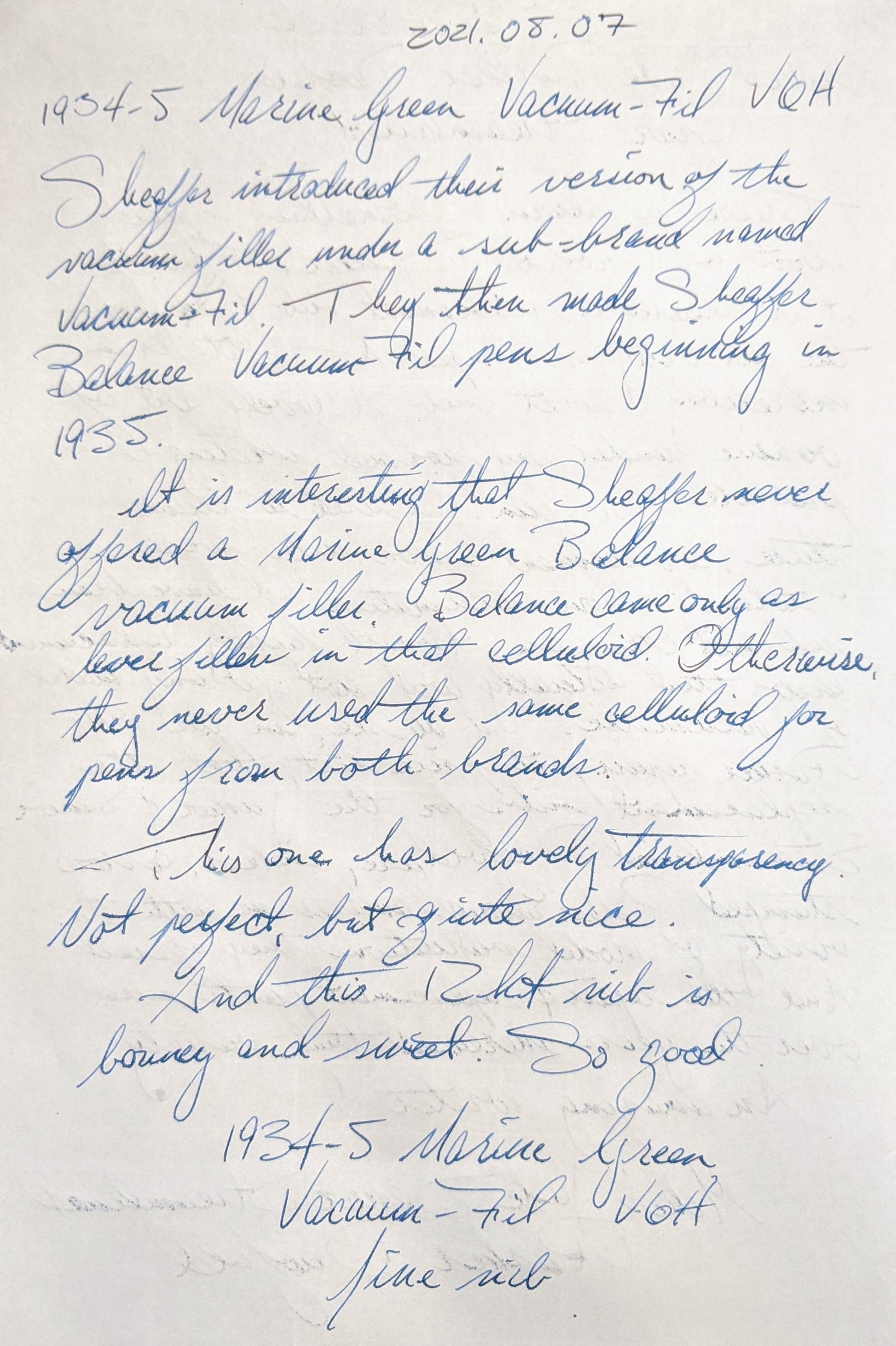 Sheaffer Balance pens were available in marine green celluloid from 1930 to 1935. However, they were only lever fillers. Marine green vacuum-filling pens were available only from VACUUM-FIL.