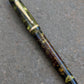 The filler rods on these early pens were made of celluloid covered carbon steel. Quite often moisture seeps under the celluloid and the steel oxidizes so badly the cover blisters or splits. Other times, the ends of the celluloid are adequately sealed and remain perfectly intact. This rod has been replaced with a custom made, black oxide coated, stainless steel unit that will last an age. Likewise, the seals of the filler have been replaced with hardy, modern materials. The filler restoration is guaranteed for at least a year provided that inks like Noodler's are strictly avoided. Such inks will also permanently stain celluloid and ruin the gorgeous transparency.