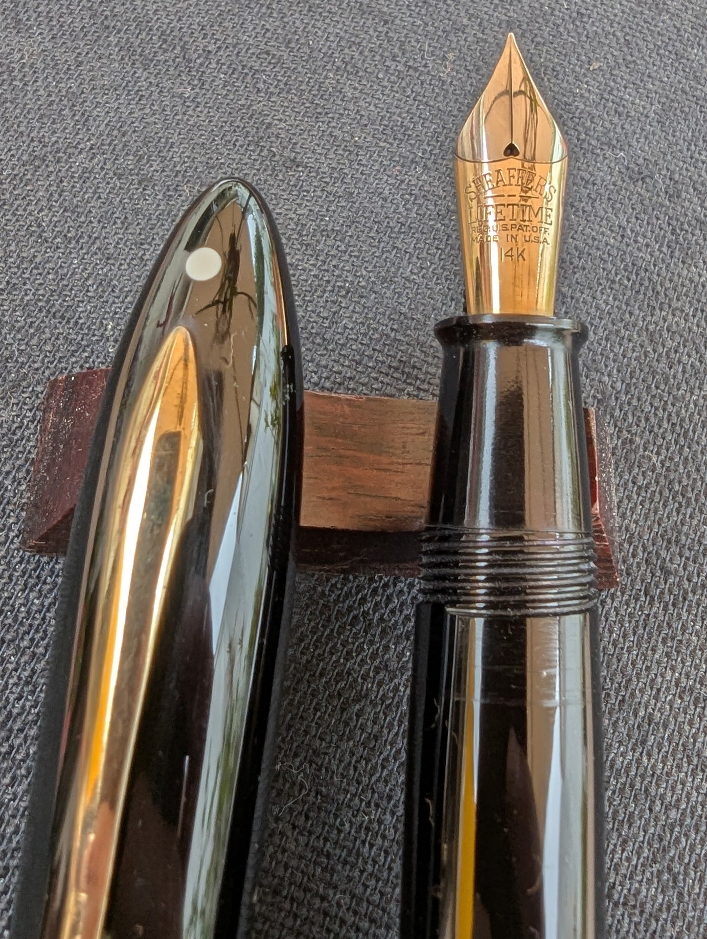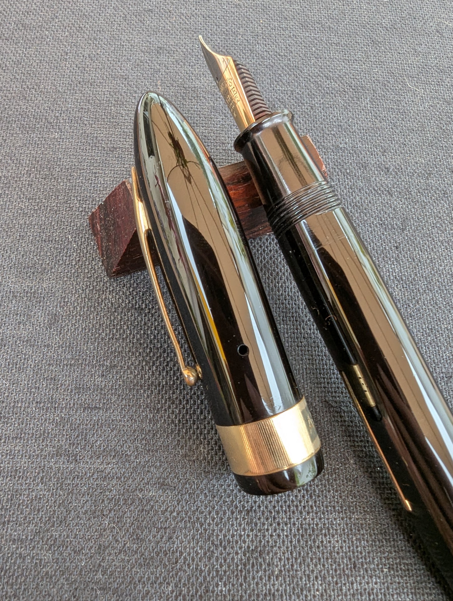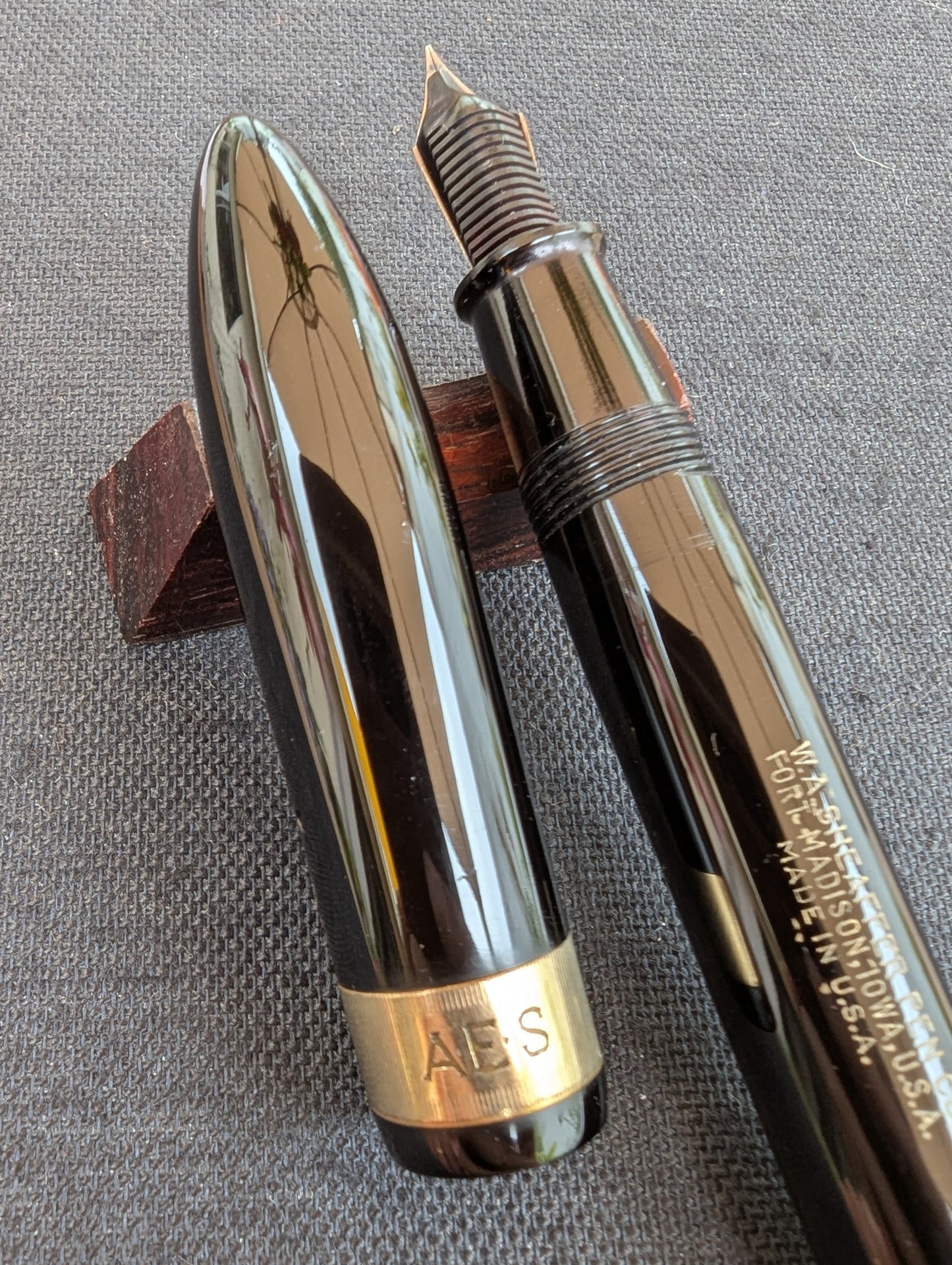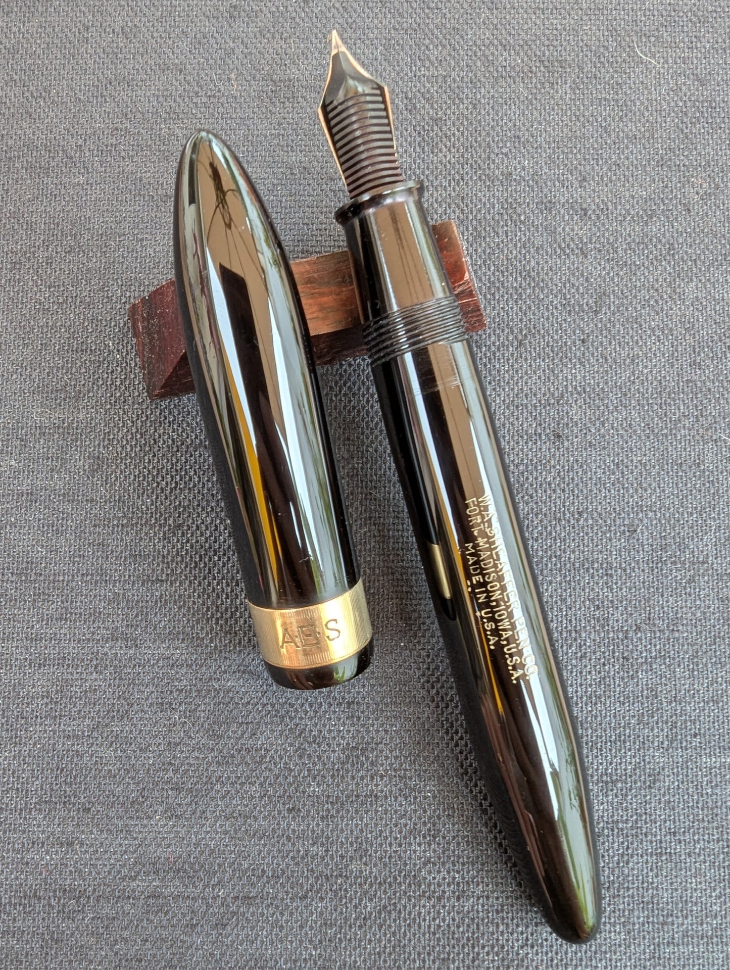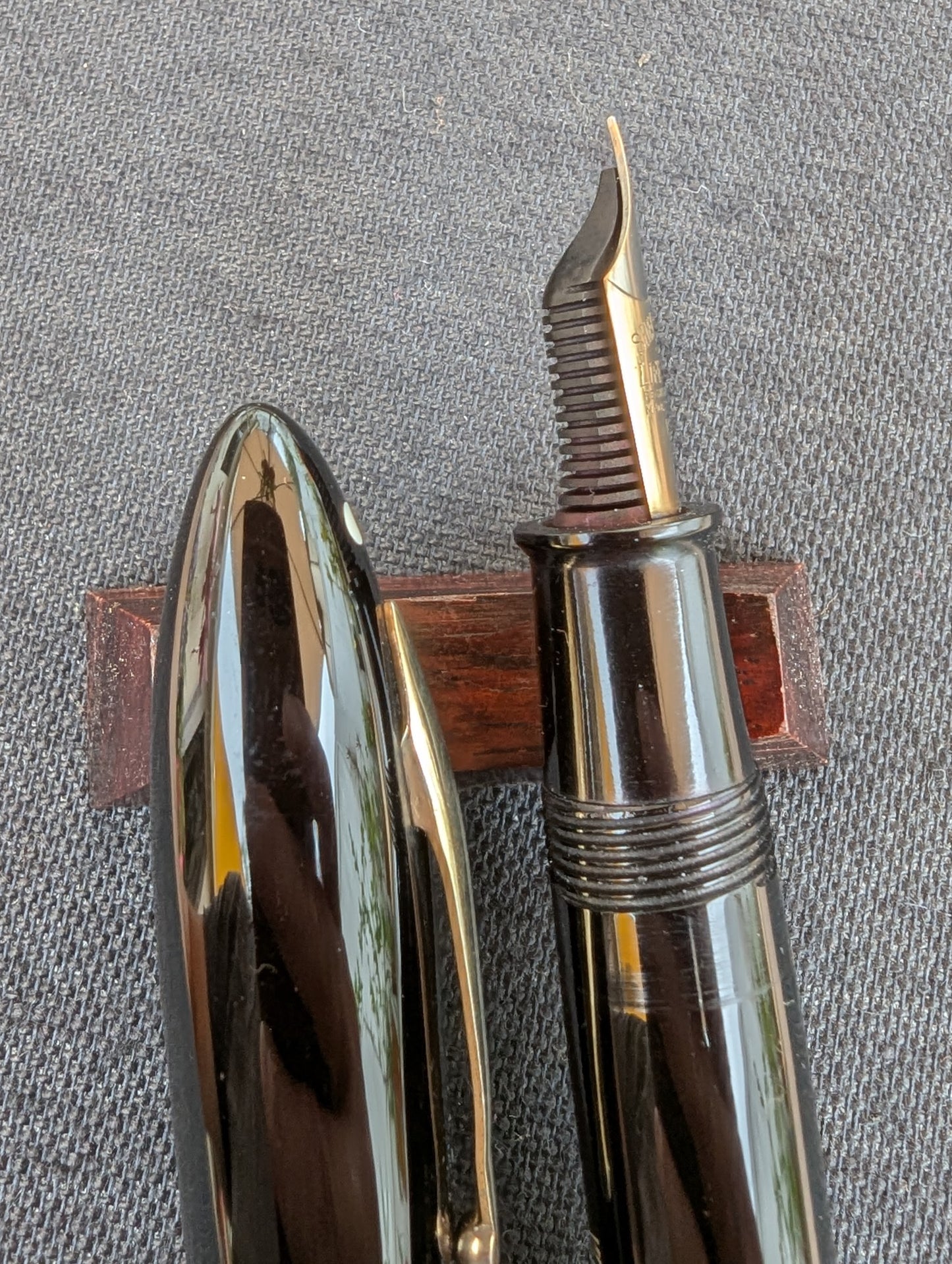 The wide, fluted cap band on this pen makes it quite special. Collectors call this a jewelers band. It seems they were available mainly from Sheaffer pen retailers who were jewelers. Walter Sheaffer started his pen company in his own jewelry store.