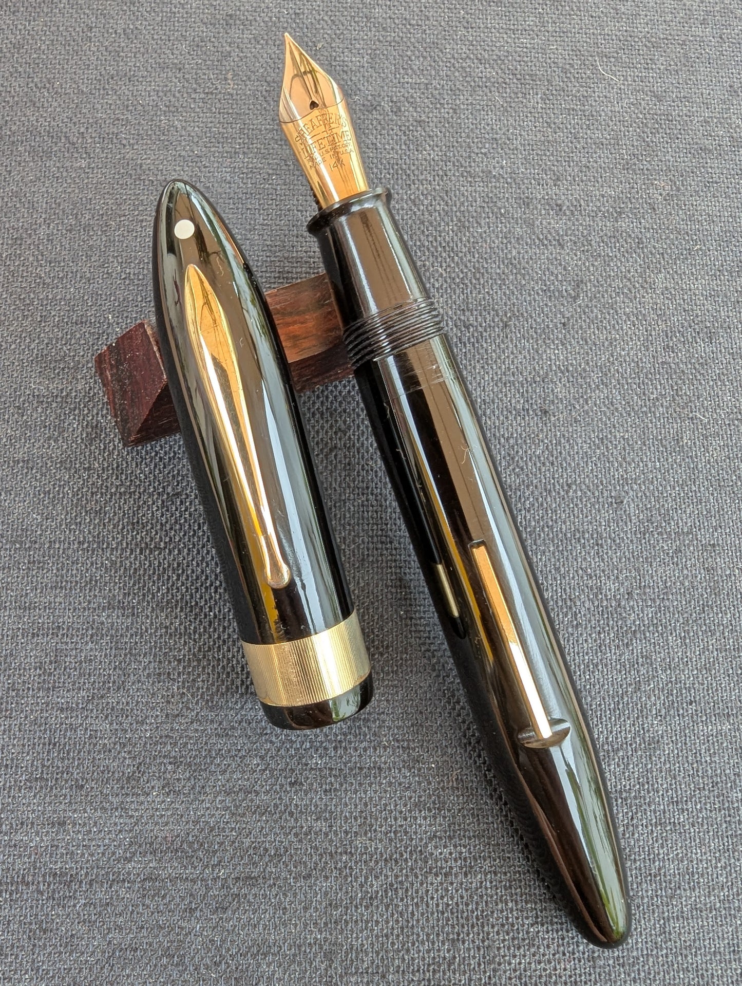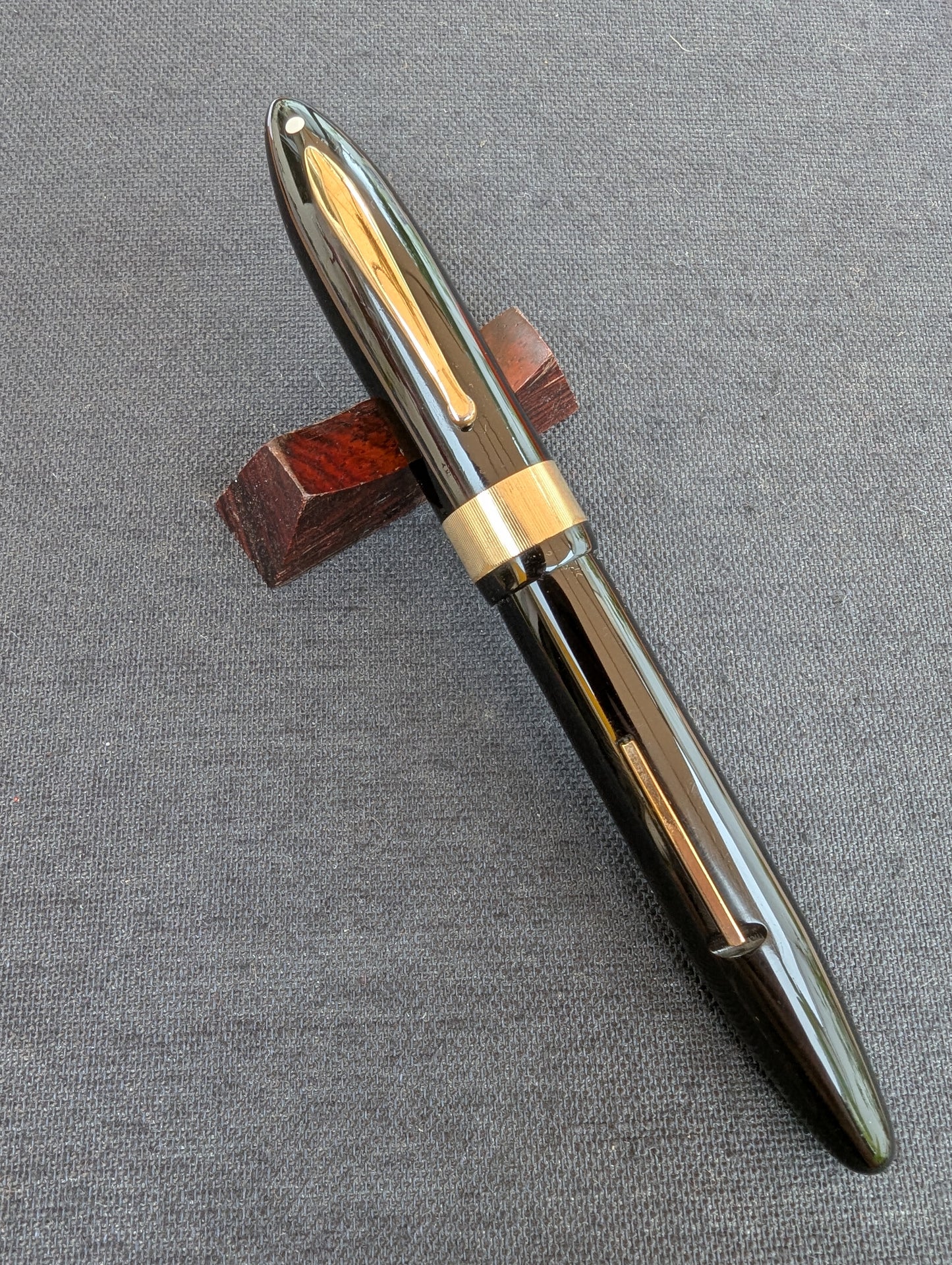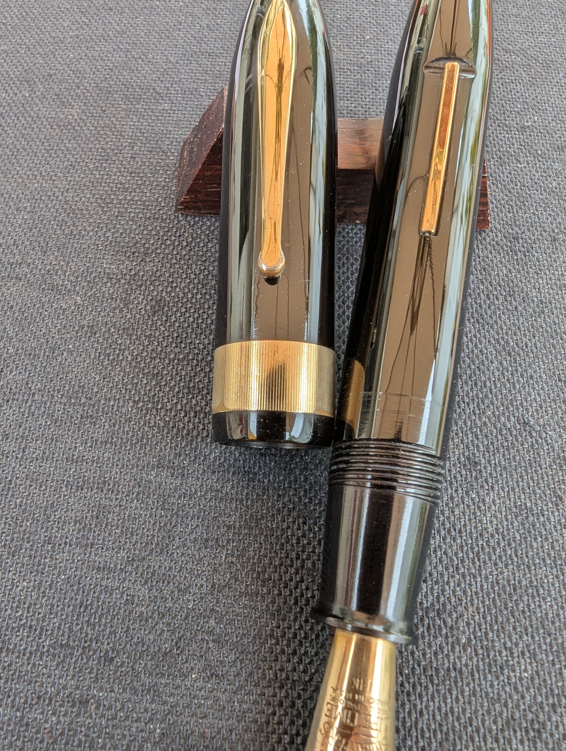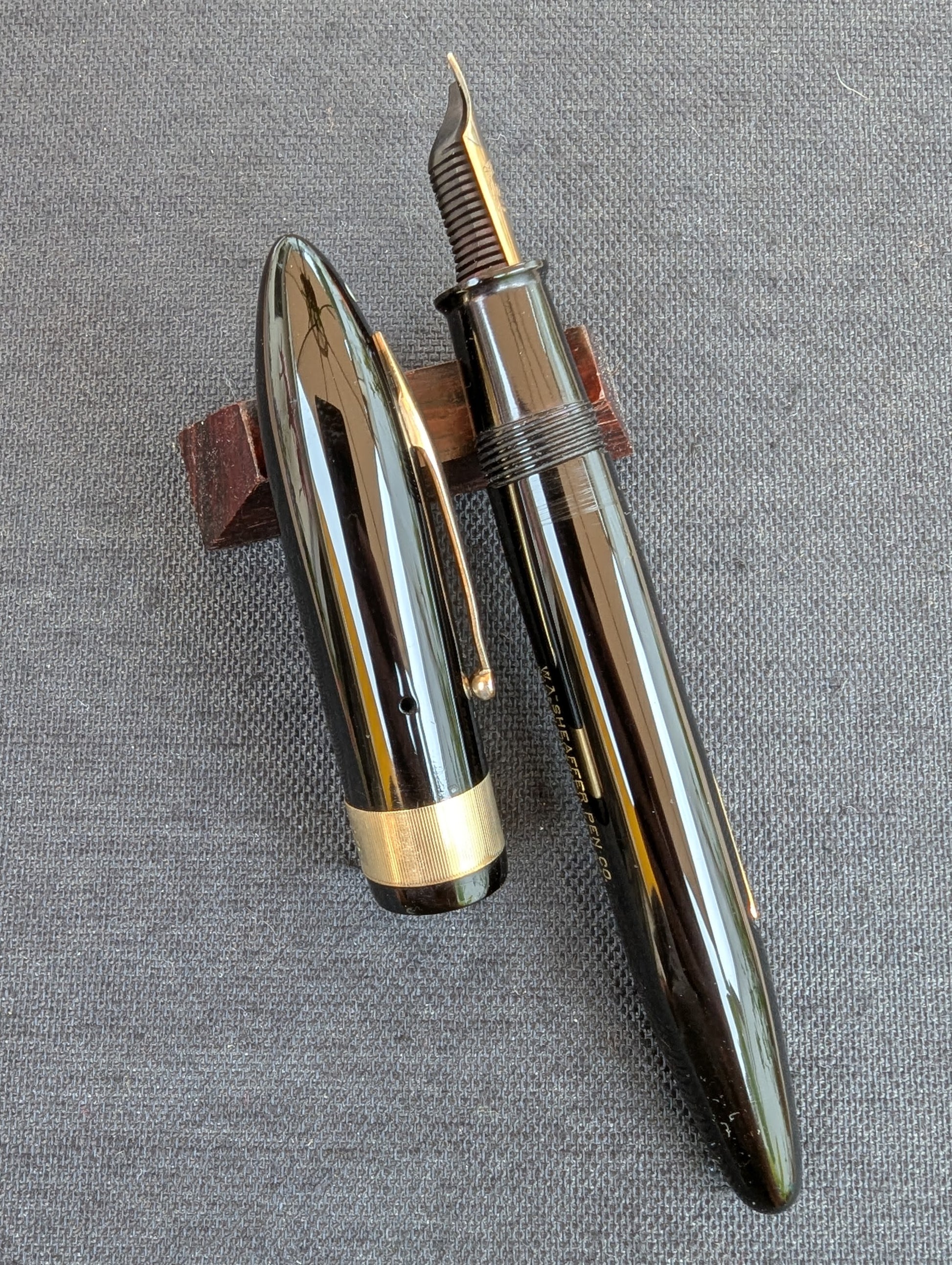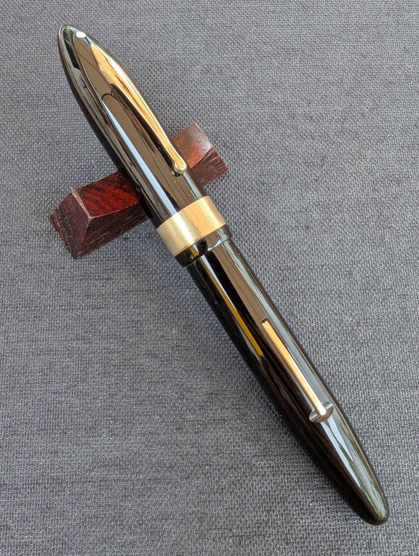 The wide, fluted cap band on this pen makes it quite special. Collectors call this a jewelers band. It seems they were available mainly from Sheaffer pen retailers who were jewelers. Walter Sheaffer started his pen company in his own jewelry store.