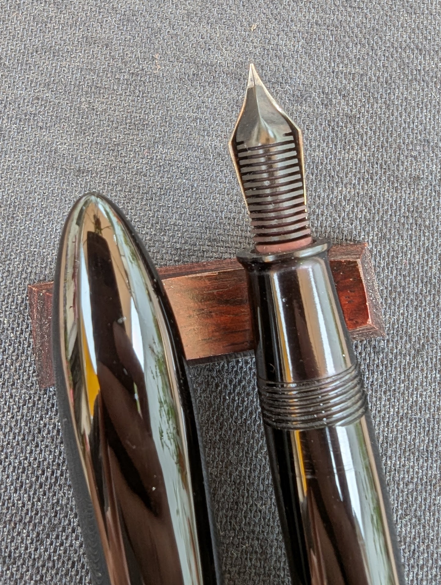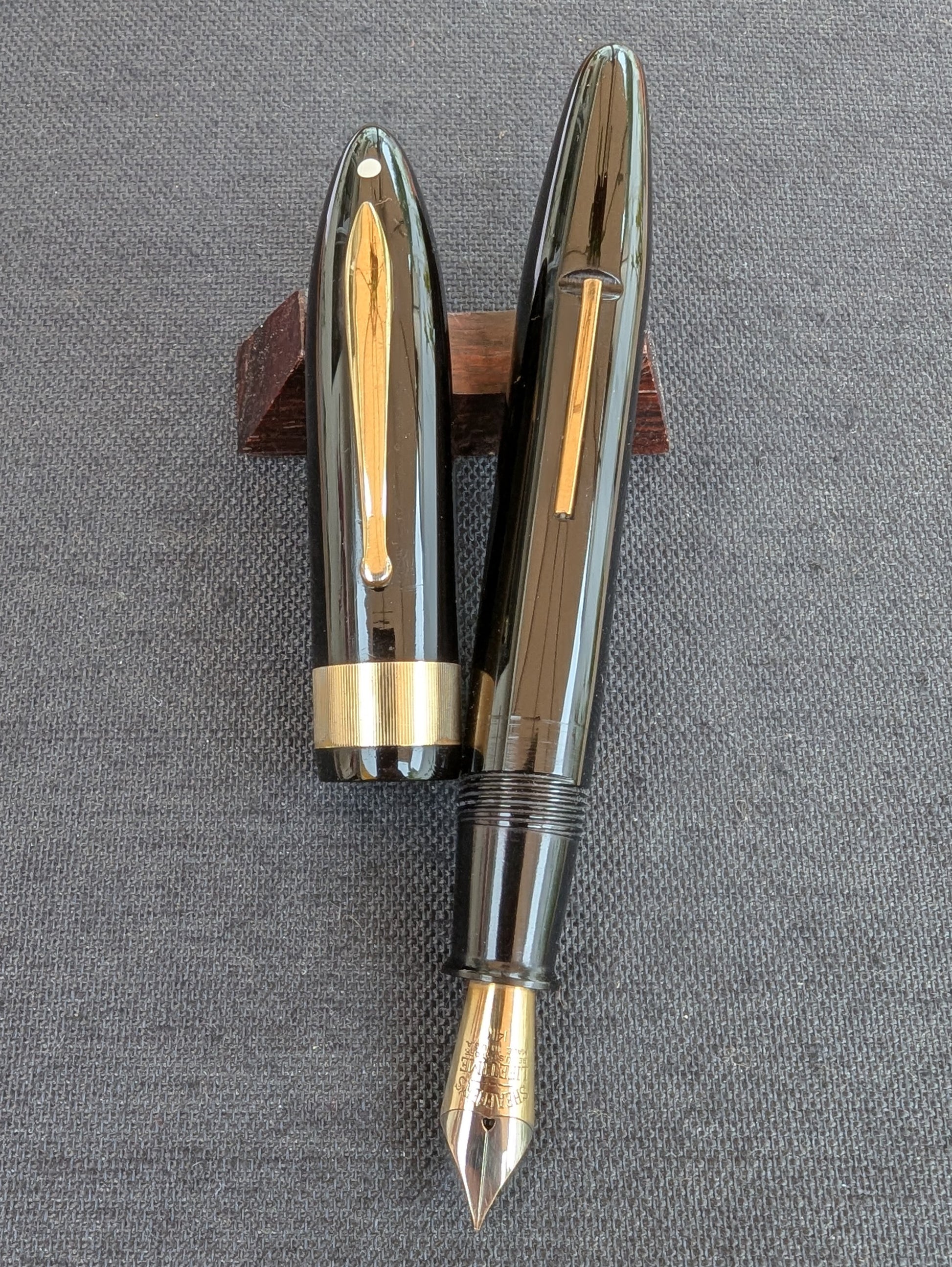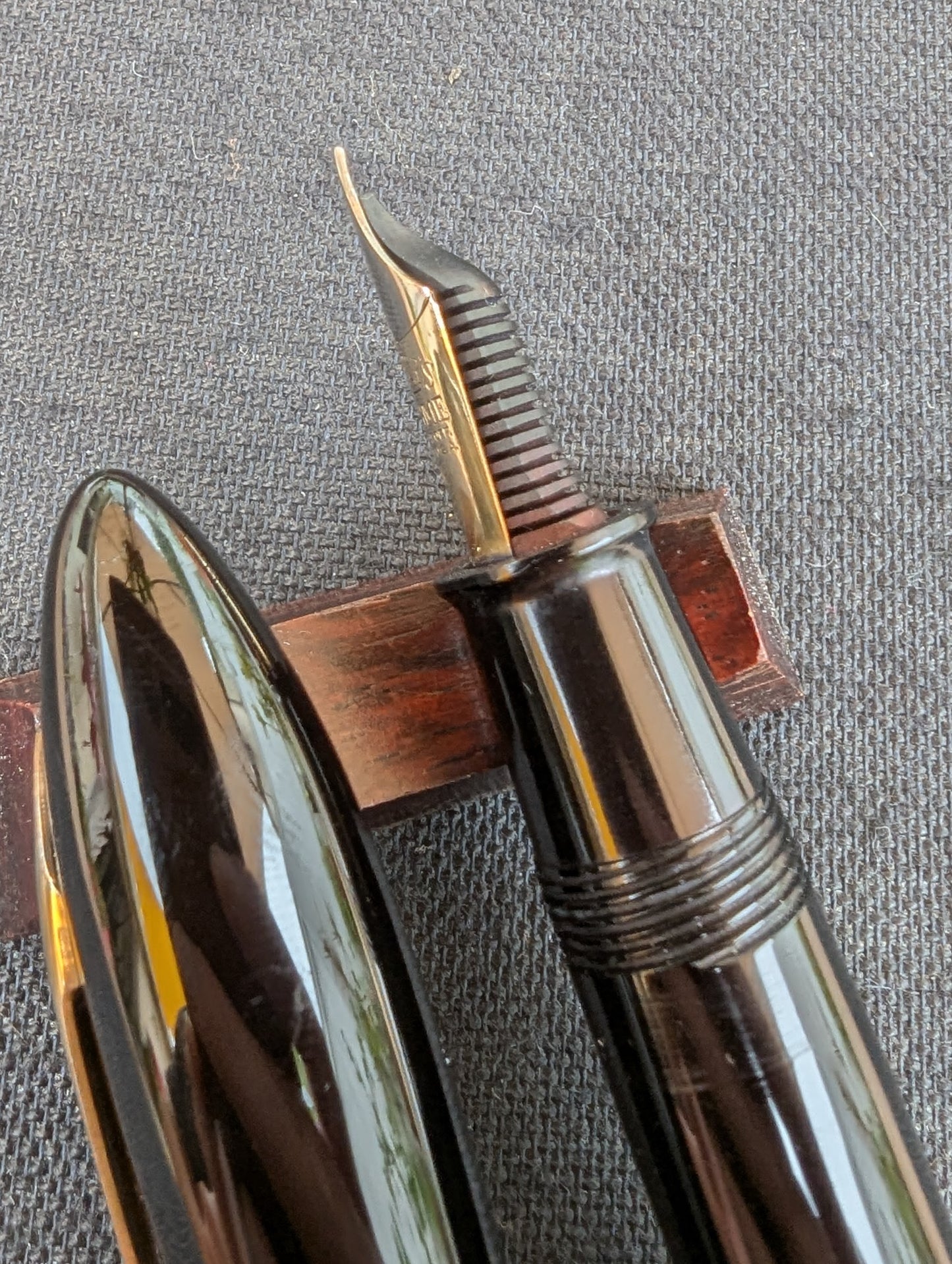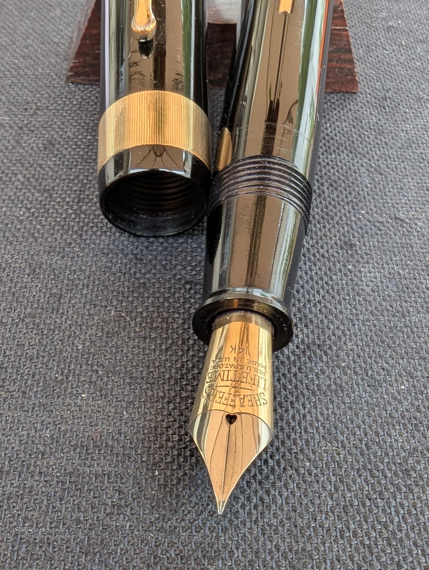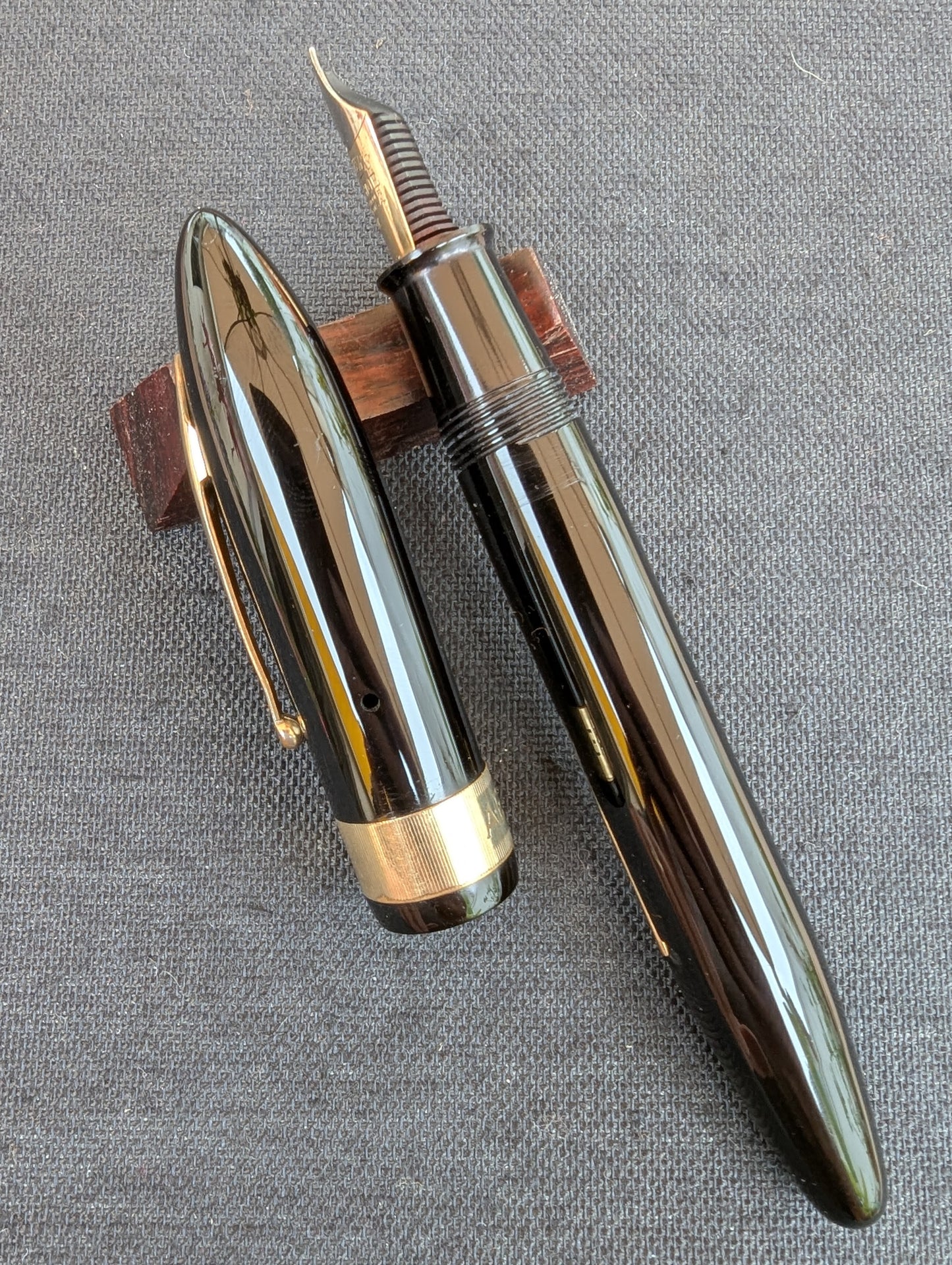 The wide, fluted cap band on this pen makes it quite special. Collectors call this a jewelers band. It seems they were available mainly from Sheaffer pen retailers who were jewelers. Walter Sheaffer started his pen company in his own jewelry store.