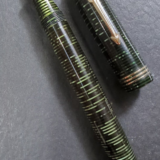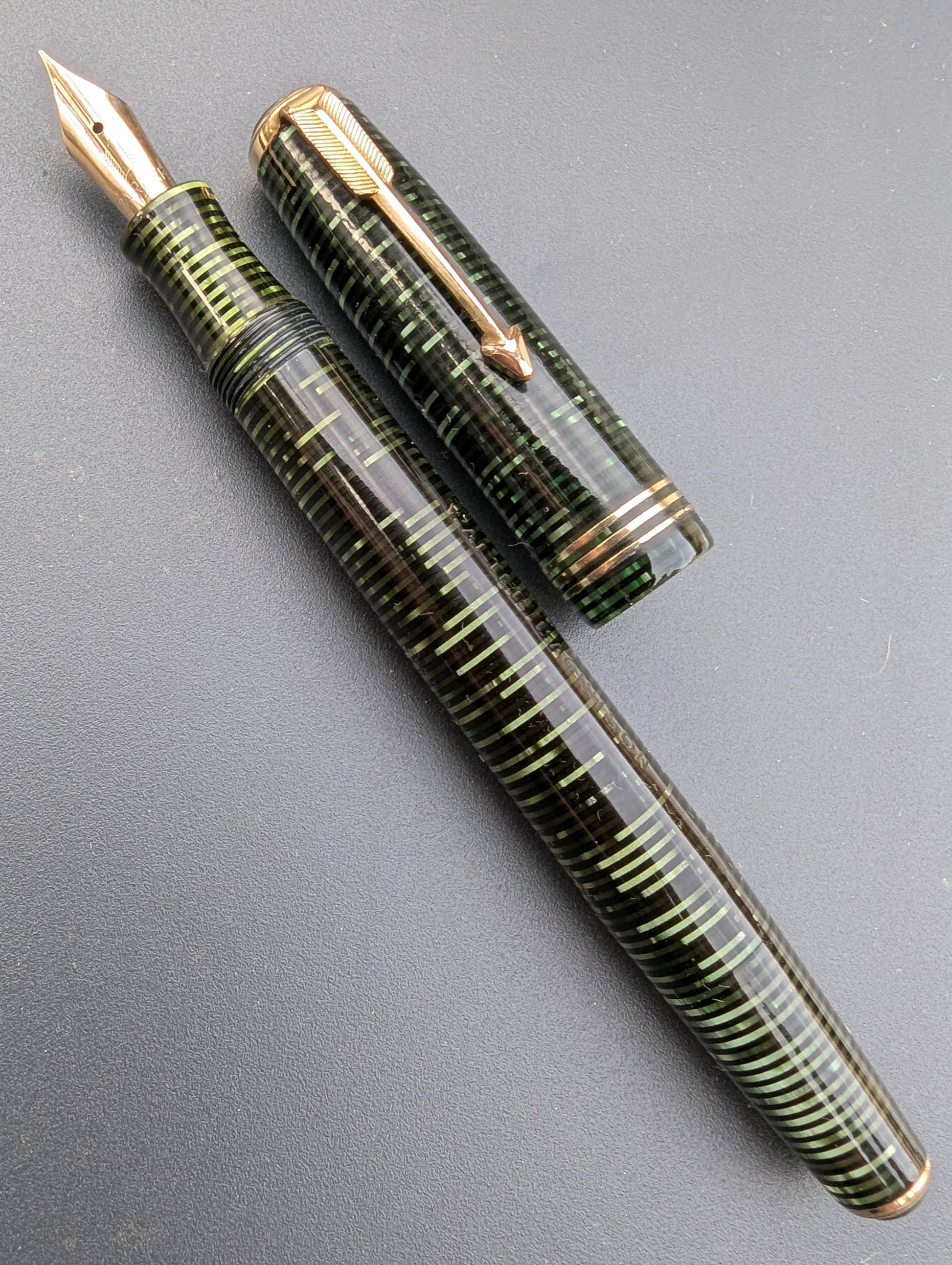 There are too few green vintage fountain pens. Was green not a popular color in the 1930s and 1940s? It seems there are far more black and brown vintage pens than green. Those are fine and good. But green celluloid has such amazing depth. This pen is no exception. Parker stacked celluloid is fabulously beautiful stuff. Amazing.