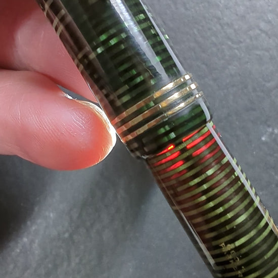 The barrel clarity is very good. The celluloid is perfect and without blemish. The lower cap band has one small spot of chipped plating, The bands are tight and straight. The tassies have some plating loss at the edges of the rings though it is difficult to photograph. The nib has an 8 date code but it's plating is gone. The jewels are the original striped green celluloid to match the pen. The filler should be a speedline but it is a later plastic plunger that fits and works perfectly.