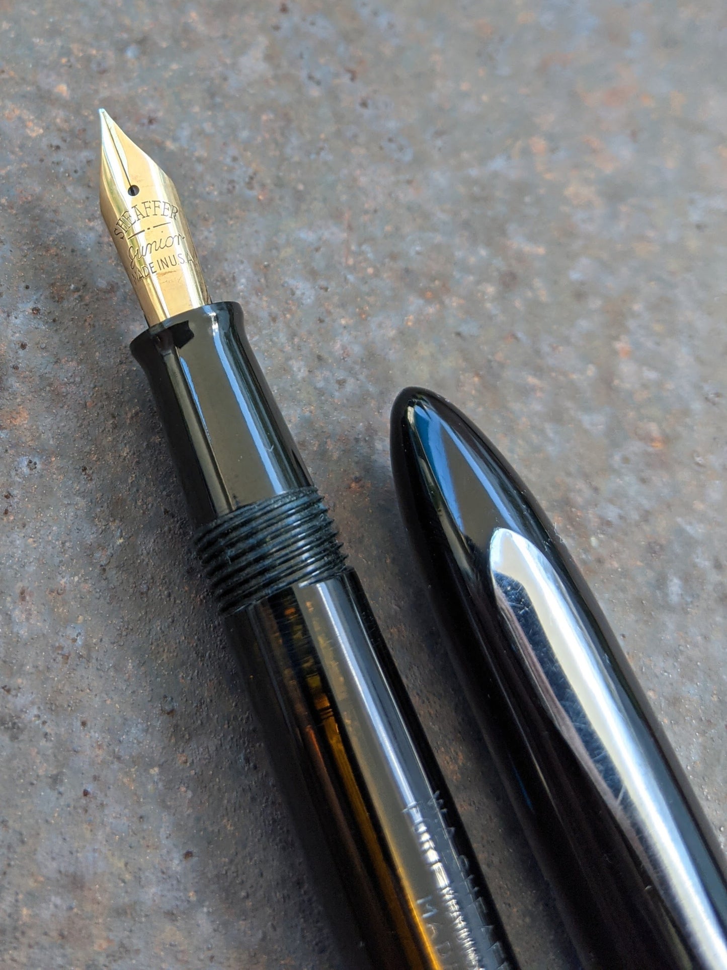 Walter Sheaffer began his fountain pen business in his jewelry store. When pens became his full time occupation he continued to favor jewelry stores as preferred dealers. Collector lore says pens like this with fancy cap bands were only available from those jewelry store Sheaffer retailers. Thus they've been dubbed "jewelers band" pens. There are several know variants of the special cap bands but none are shown in any Sheaffer catalog.