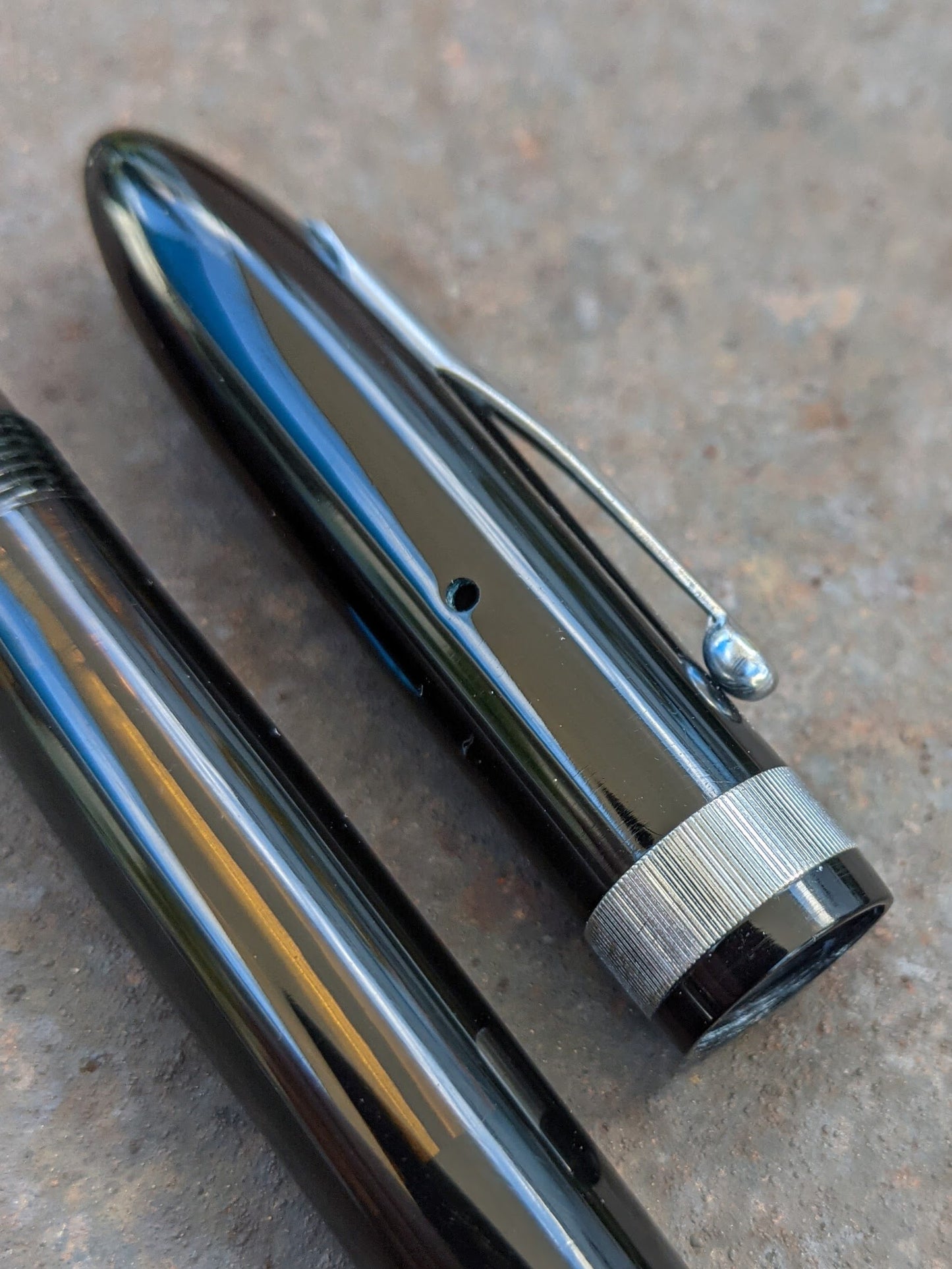 This pen is in excellent condition. The barrel clarity/transparency is perfect. The chrome plating has only 2 small spots of wear on each side of the clip ball. This is significant as chrome plating from this era often seems to take a wicked beating and endure it poorly.