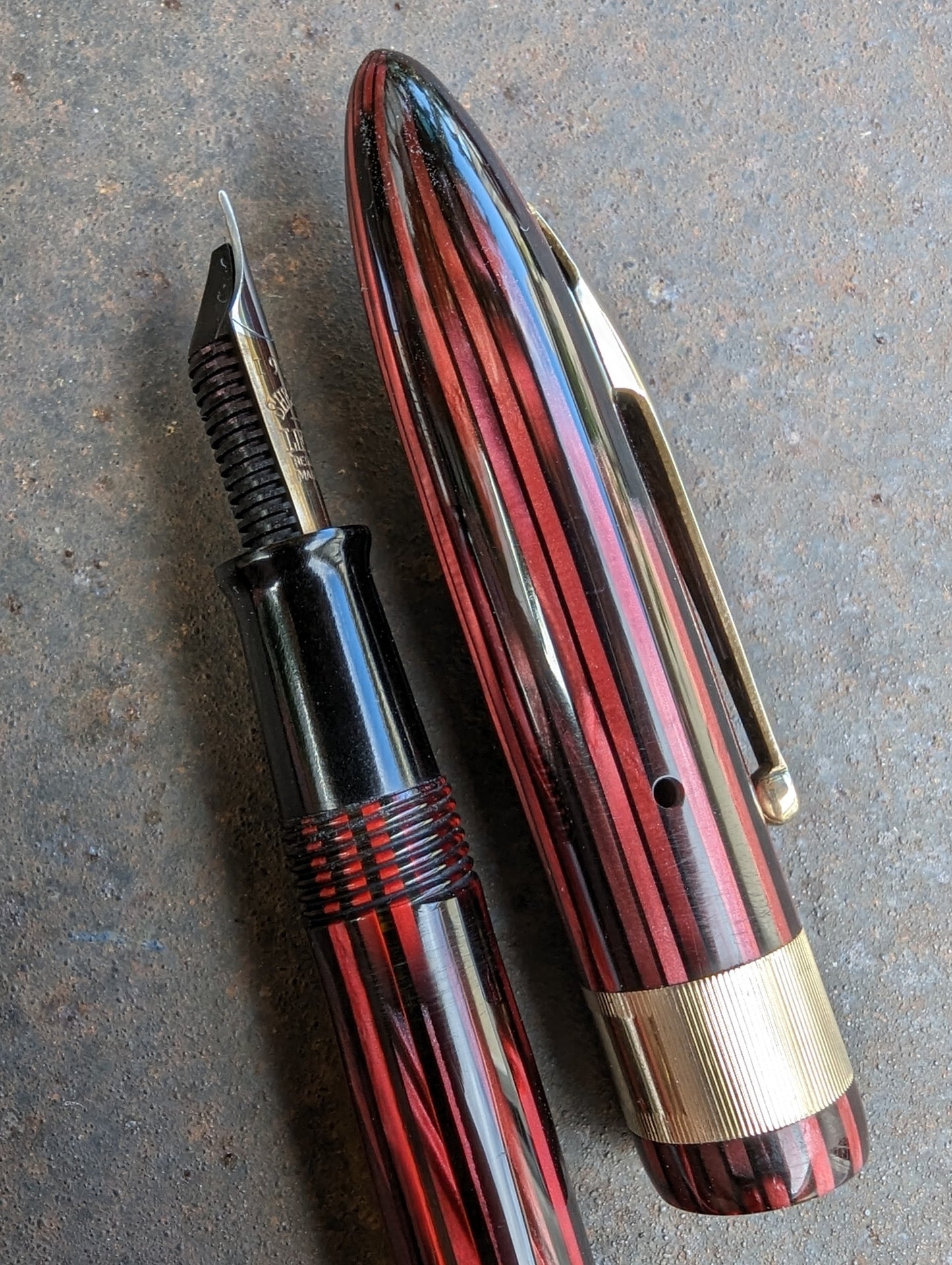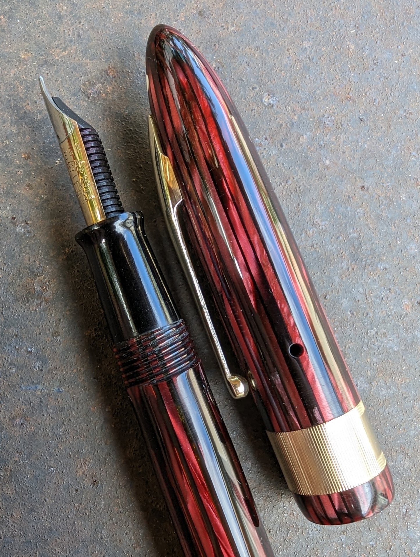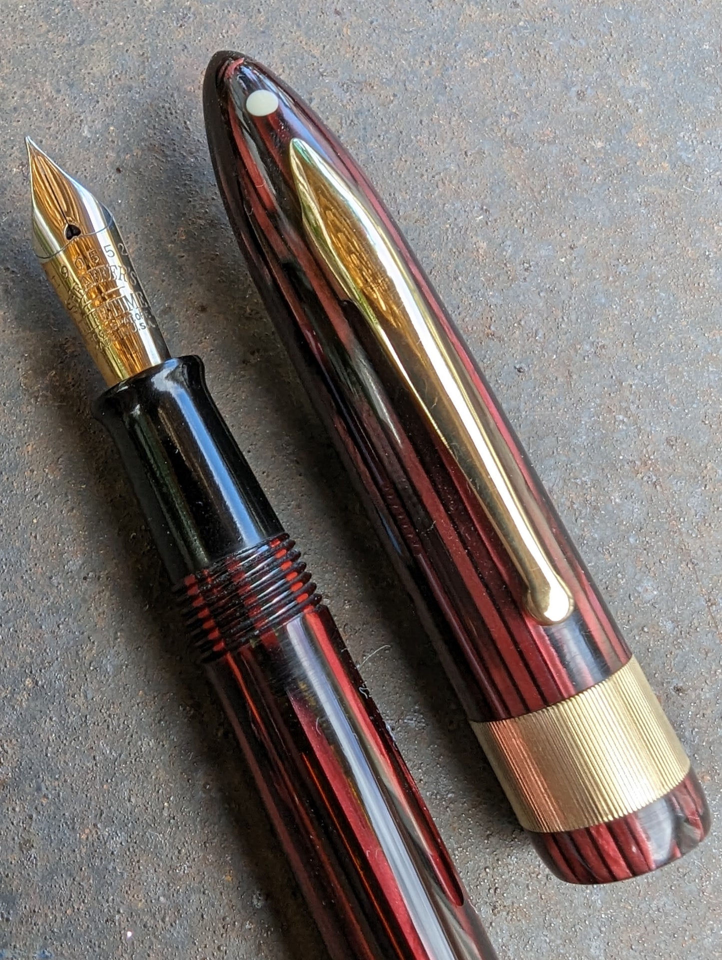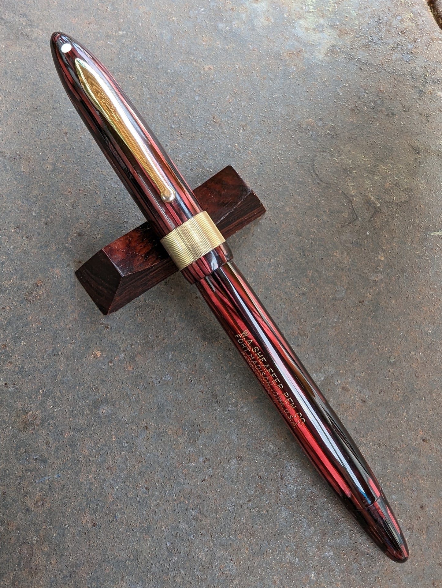 The Sovereign is somewhat less commonly found among the Sheaffer Balance models. It is the same length as the standard size pens but slightly smaller in diameter. This one is a special model with a milled "jewelers" band. Pens with these caps were not found in the Sheaffer catalog. Lore says they were offered only by jewelry stores that were Sheaffer retailers. Walter Sheaffer began his pen company in his own jewelry store. He seems to have wanted to offer pen shoppers at jewelry store retailers the option of a little bling. The cap band on this pen has a blank spot that could be engraved with a name or initial but it remains blank.