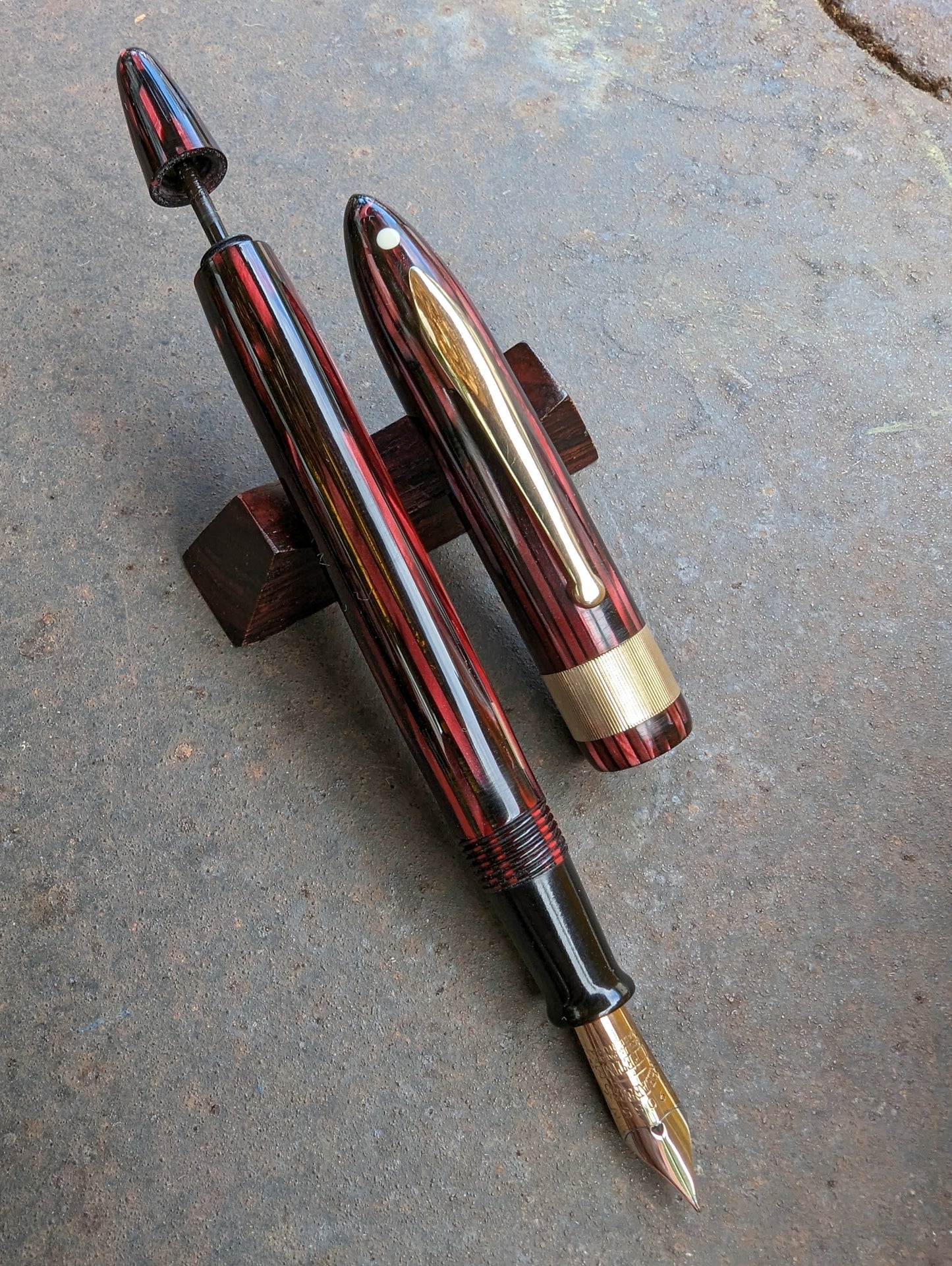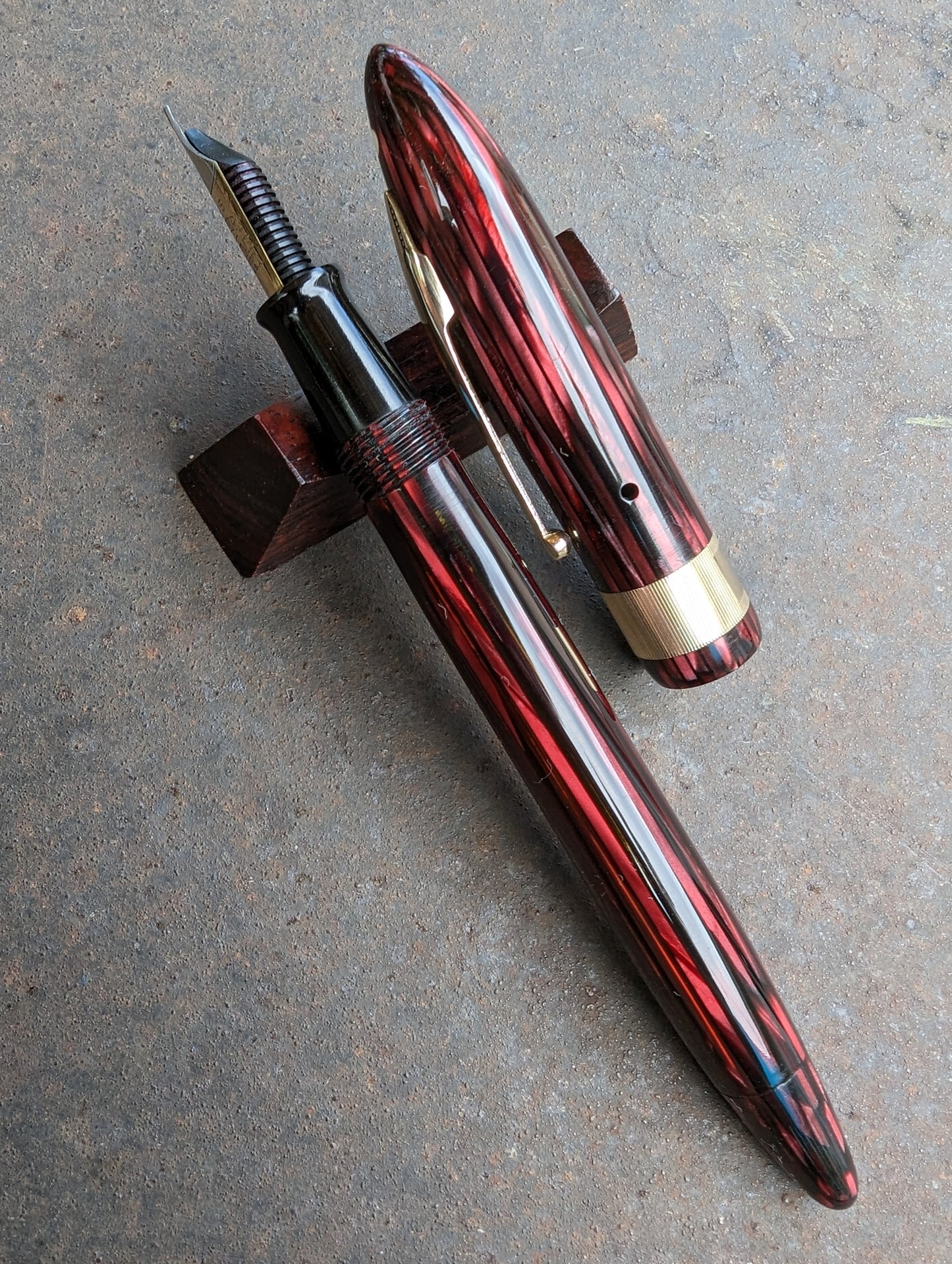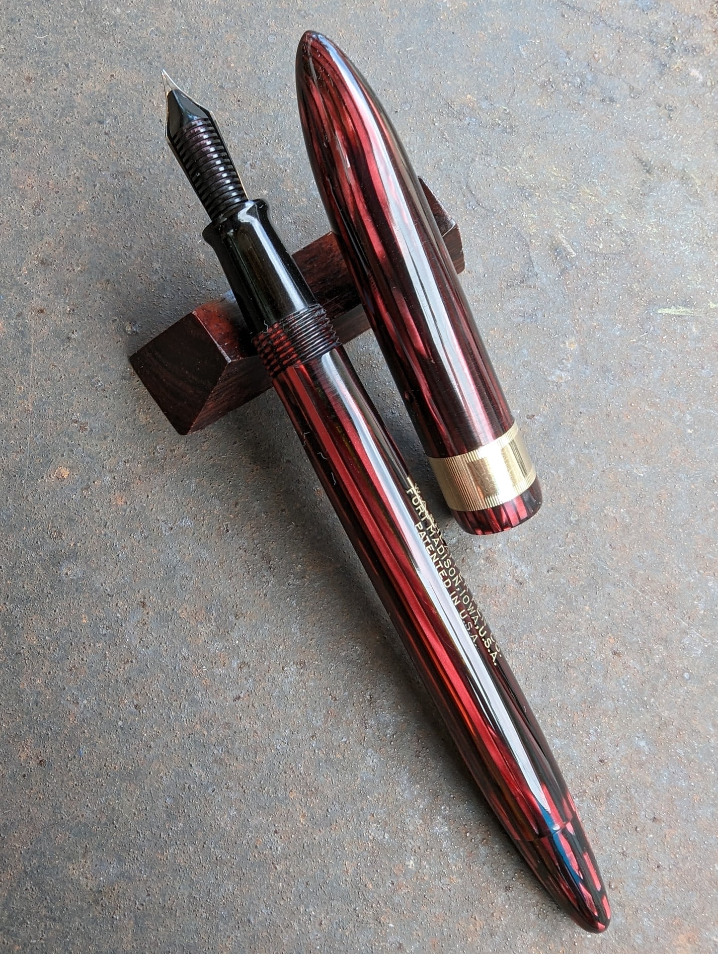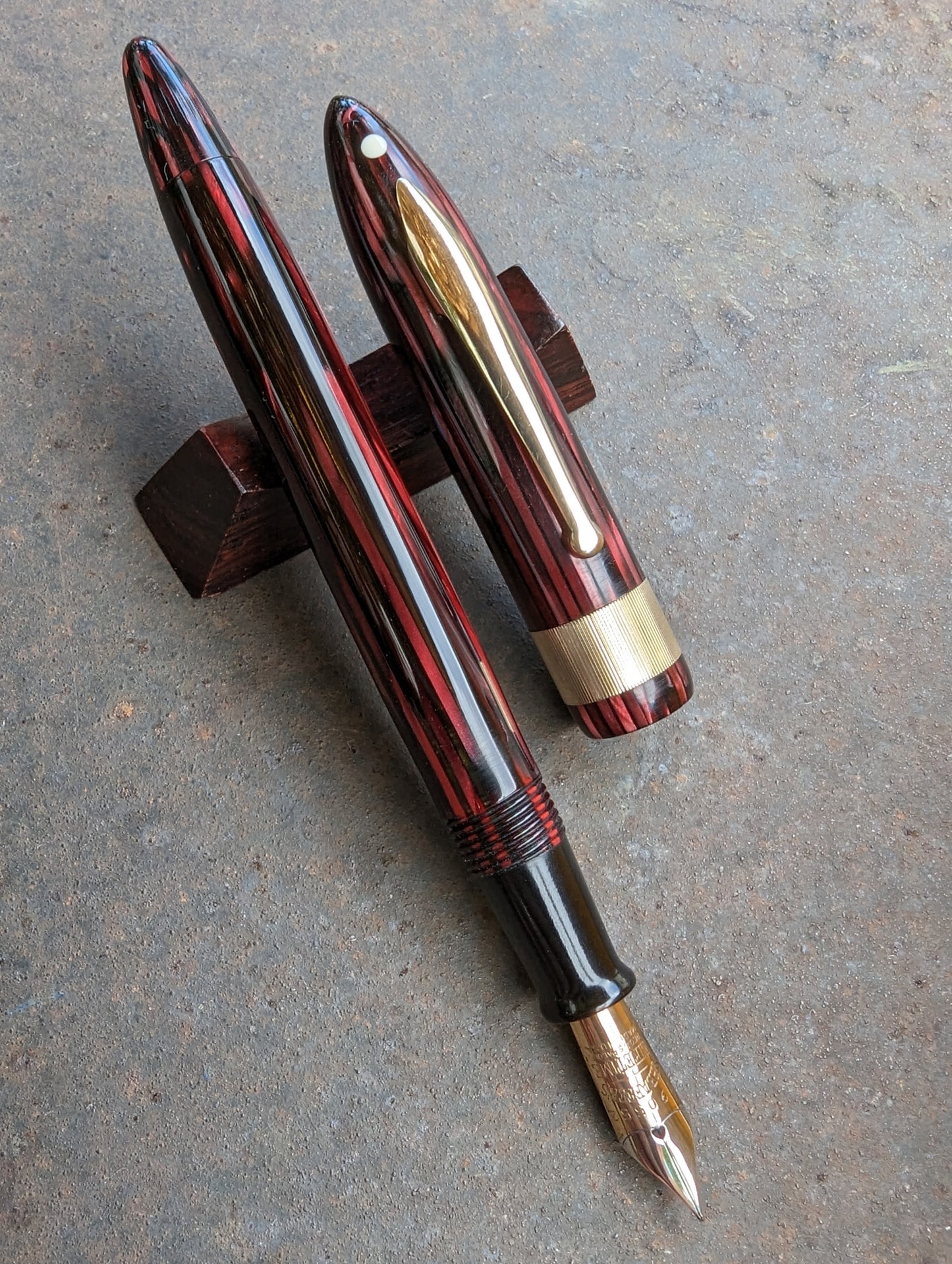 The Sovereign is somewhat less commonly found among the Sheaffer Balance models. It is the same length as the standard size pens but slightly smaller in diameter. This one is a special model with a milled "jewelers" band. Pens with these caps were not found in the Sheaffer catalog. Lore says they were offered only by jewelry stores that were Sheaffer retailers. Walter Sheaffer began his pen company in his own jewelry store. He seems to have wanted to offer pen shoppers at jewelry store retailers the option of a little bling. The cap band on this pen has a blank spot that could be engraved with a name or initial but it remains blank.