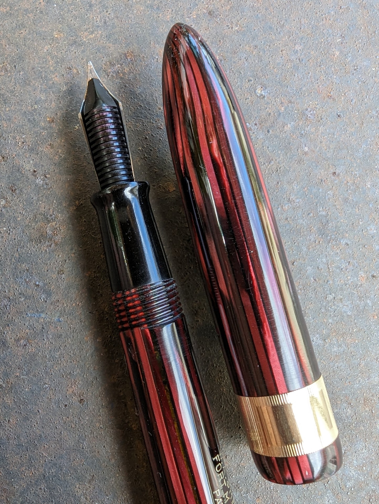 The barrel color and clarity is excellent as can be seen in the video. The celluloid and gold plating are flawless. The fine nib writes a smooth, wet line.
