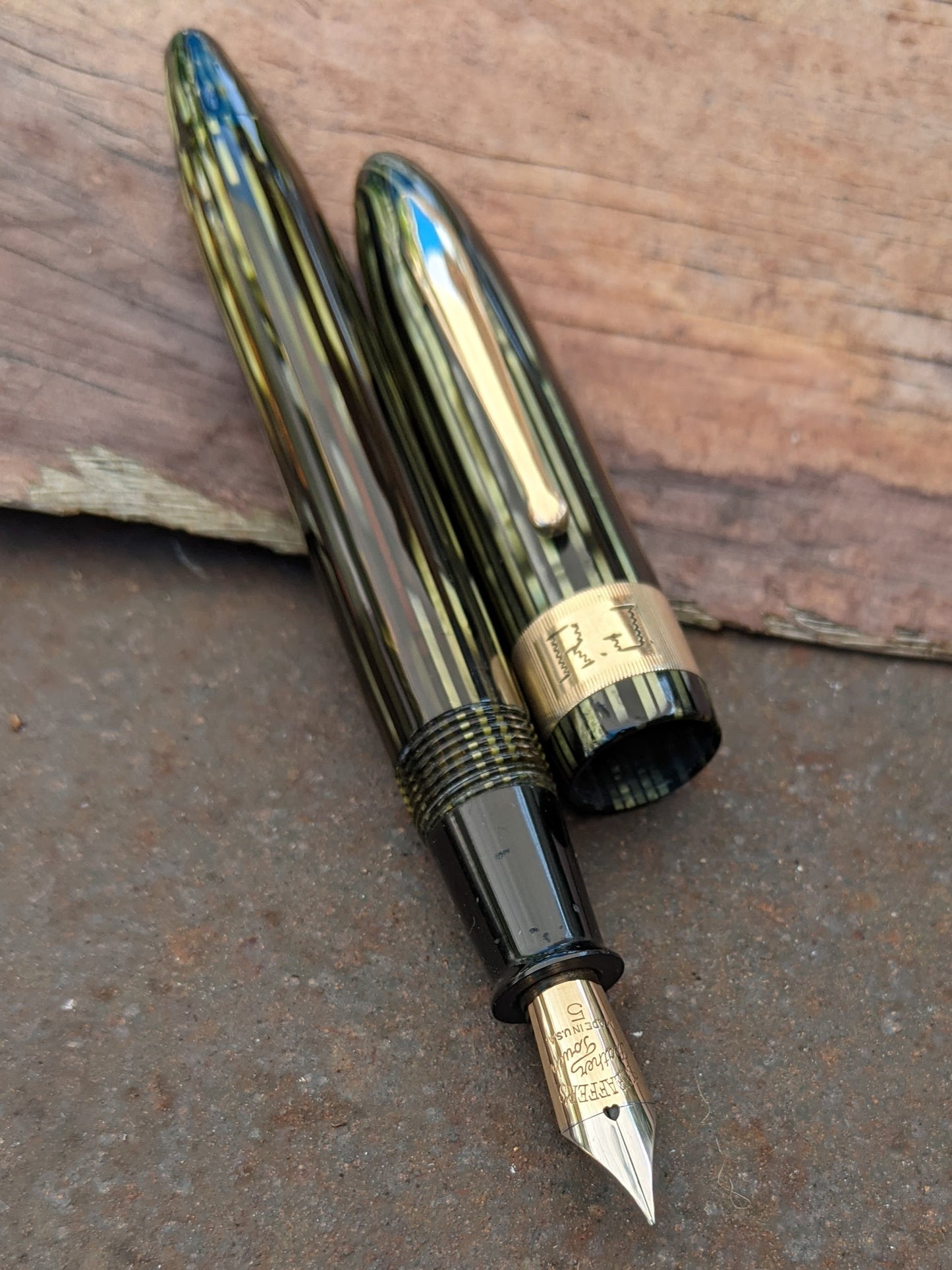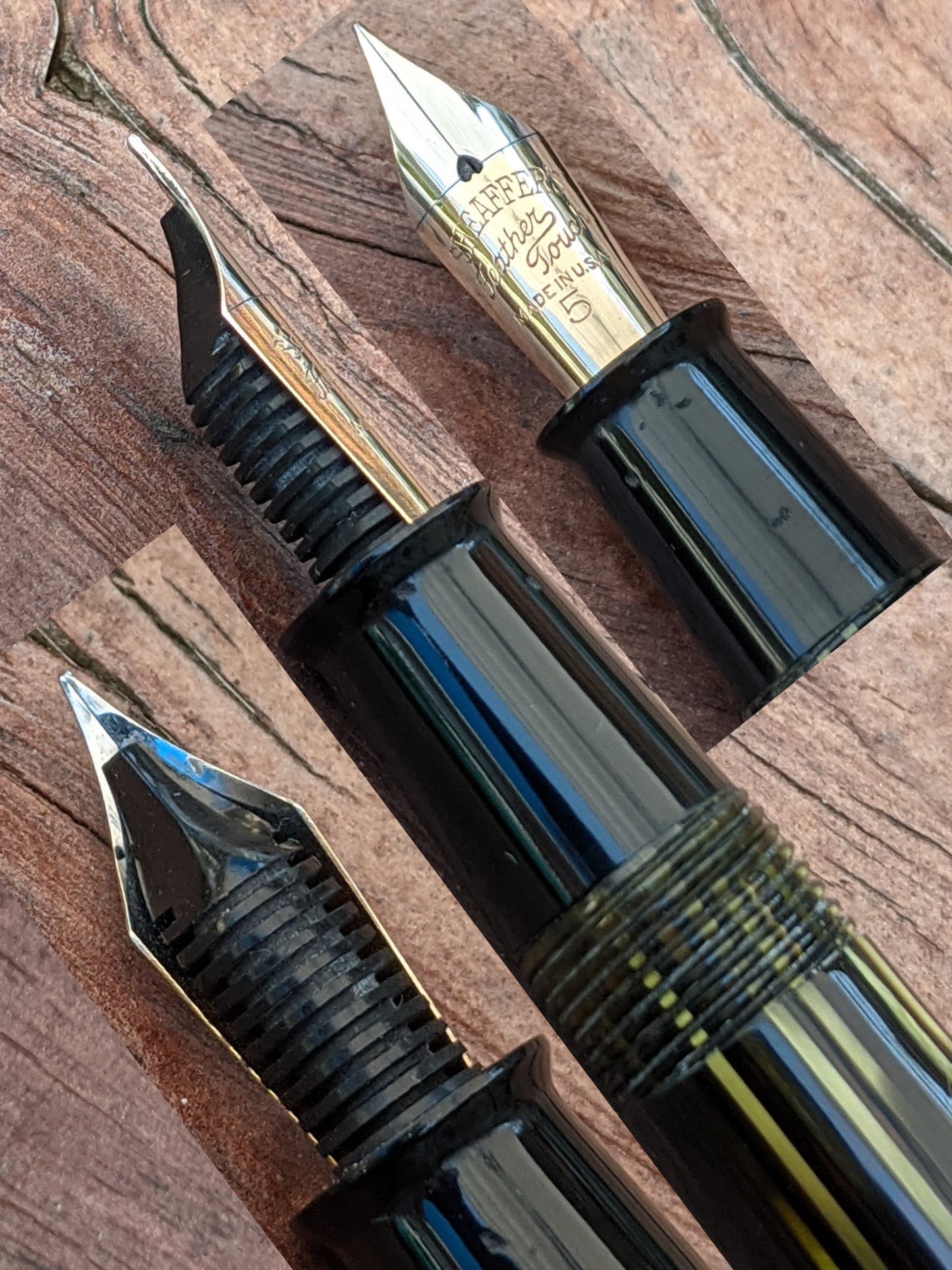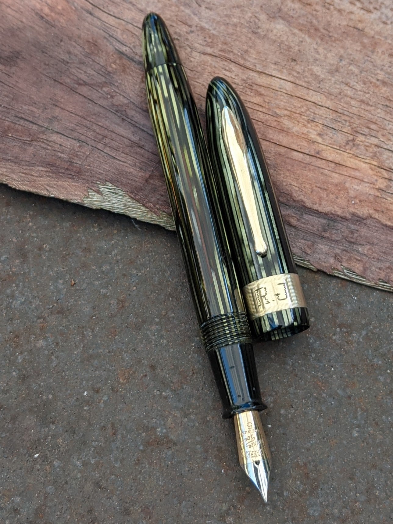 Pens with straight line bands like this one, are not rare, though they are uncommon. This is a less common, uncommon pen. Most jewelers band pens are the thinner barrel Craftsman model with a #3 nib. I speculate the Craftsman pens were made on spec for jewelry store display cases. And that the larger, less common jewelers band pens like this one were only available by special order.
