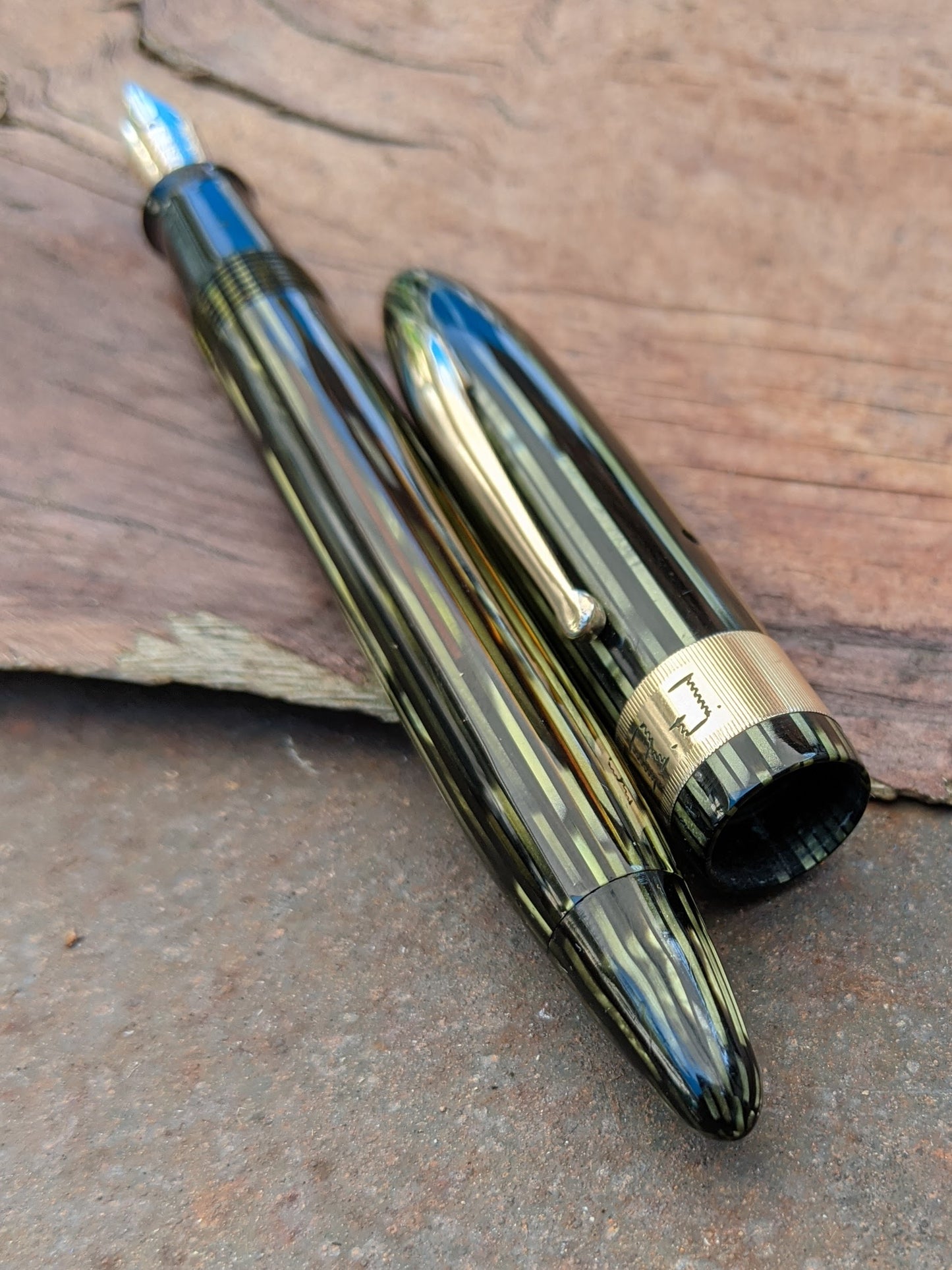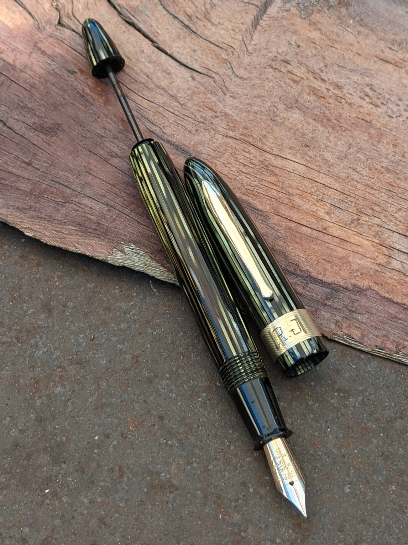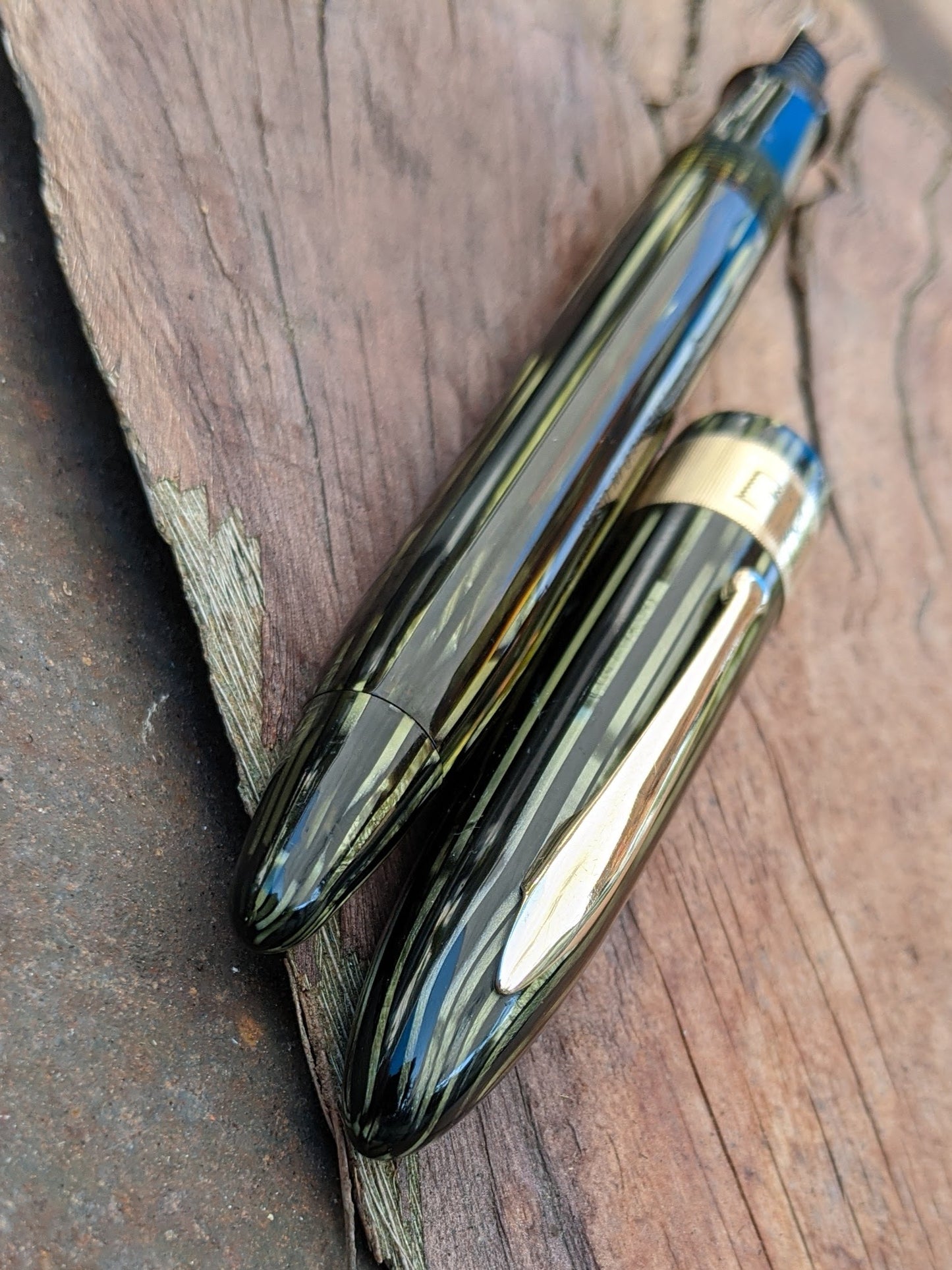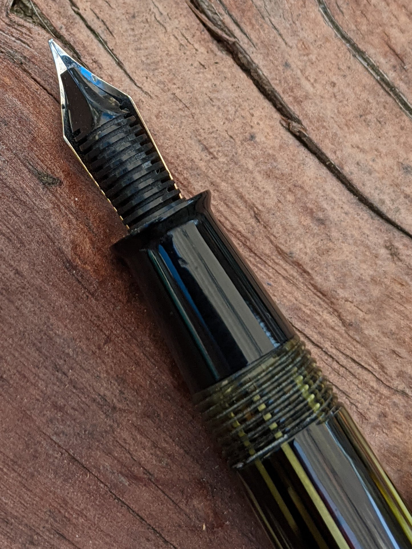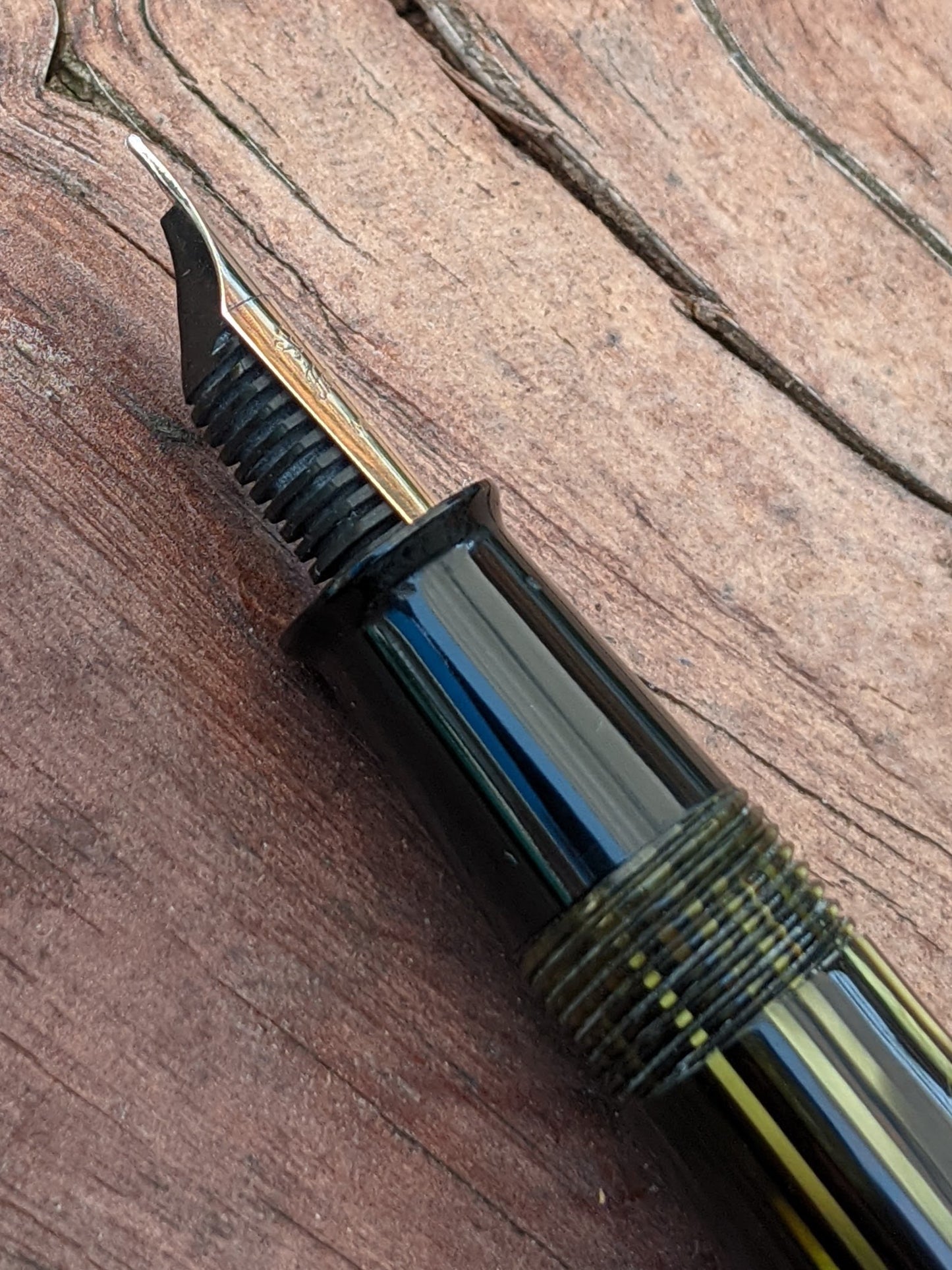 This pen is in excellent condition with no plating loss and flawless celluloid. The ink view barrel has very good clarity and holds a lot of ink. The filler rod has been replaced with one made from black oxide coated, stainless steel. The filling system restoration is guaranteed for at least one year provided Noodler's ink is strictly avoided. It will melt the rubber in the filler and stain the barrel. There are several small pock marks in the grip section.