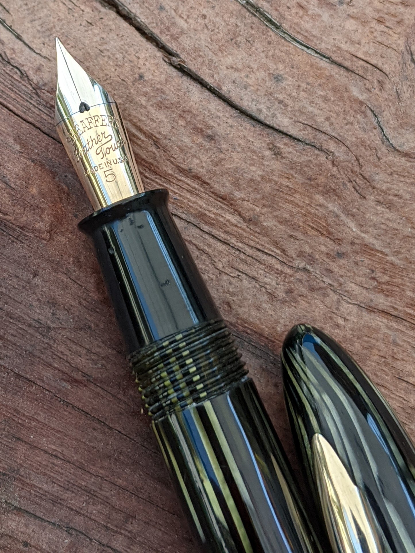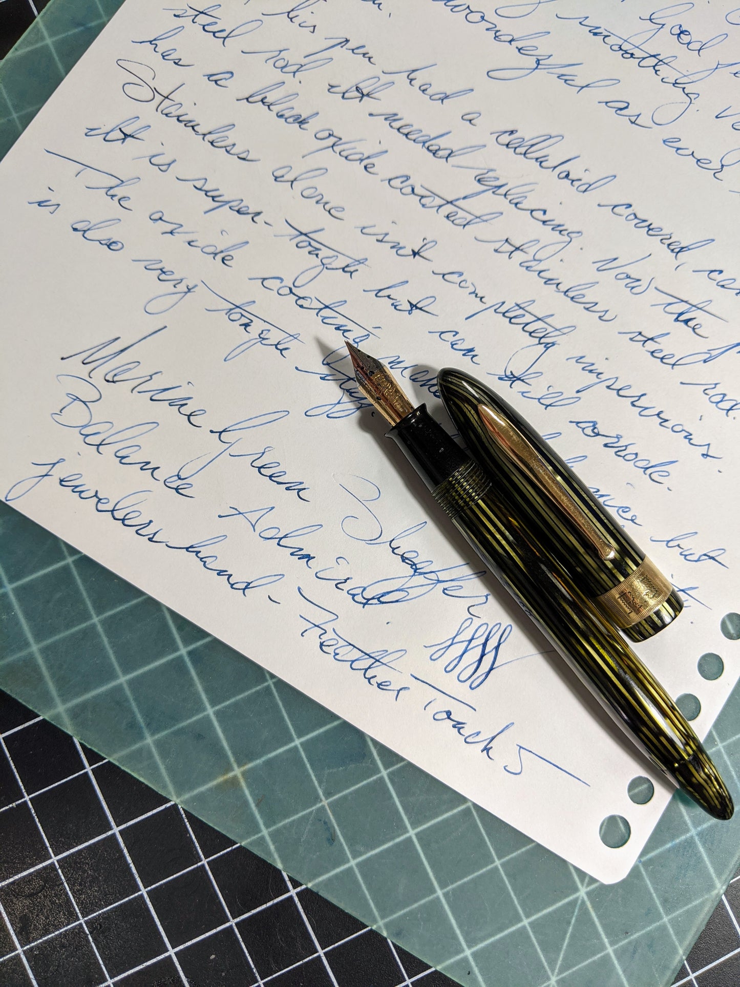 What makes this pen stand out is the Feather Touch 5 nib. One of the best nibs ever produced. Ever. It has the perfect amount of softness and bounce to produce mesmerizing line variation under normal writing pressure. So much fun and happiness.